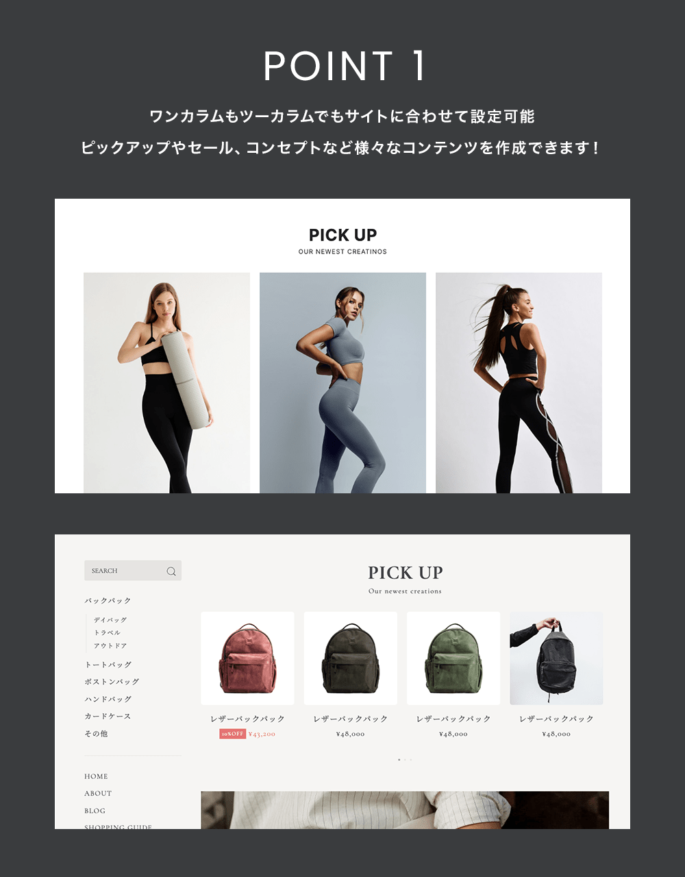さらにピックアップ商品やセール商品、スライドバナーやスクロールコンテンツ、YouTube動画の紹介エリアやお知らせにブログ、ABOUTページにショッピングガイドやよくある質問を追加したりと様々なコンテンツを作成可能です。