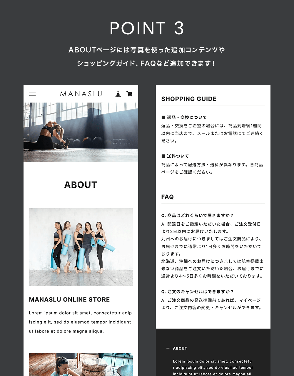 また、ショッピングガイド、よくある質問を作成することができ、これを作成した場合ドロワーやサイドバー、フッターのメニューに表示されます。