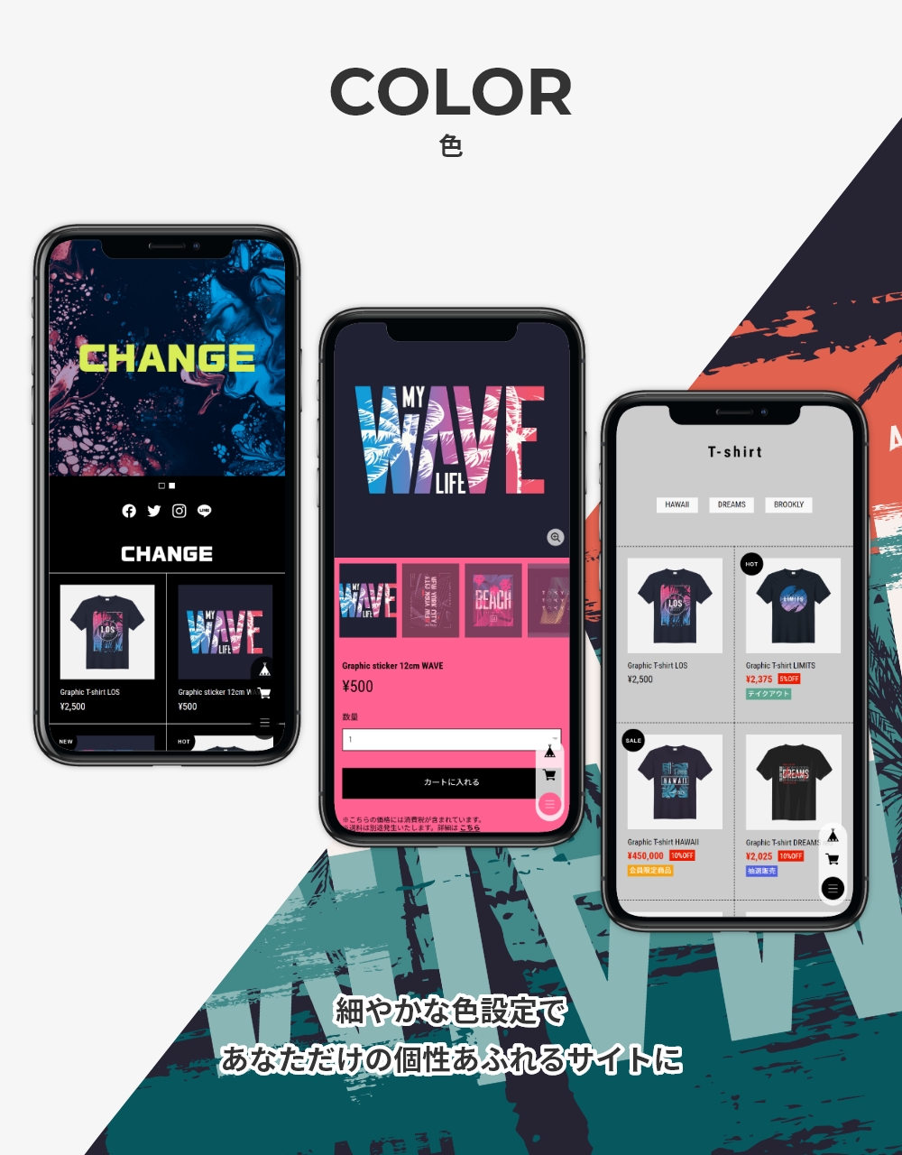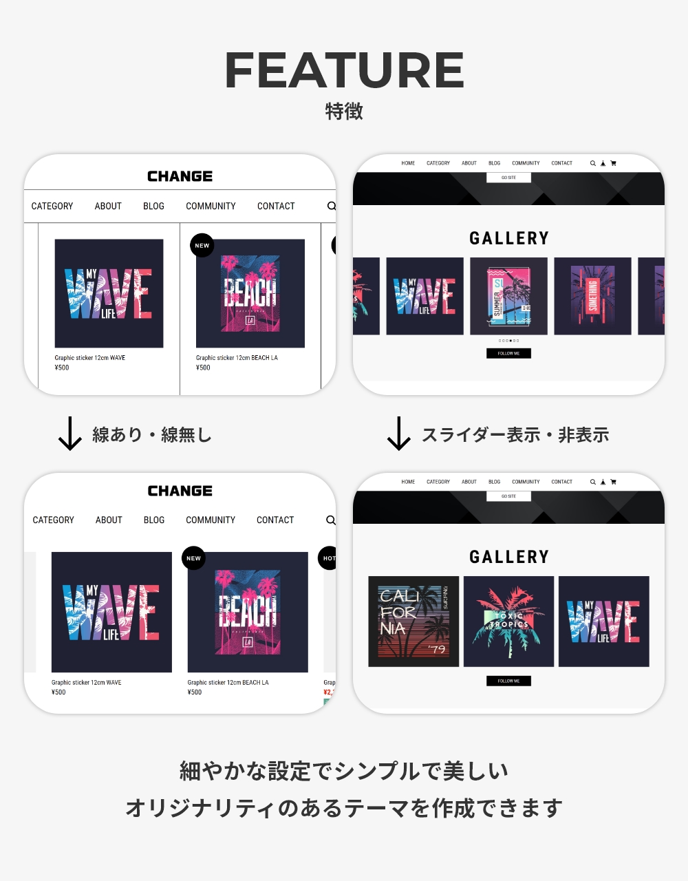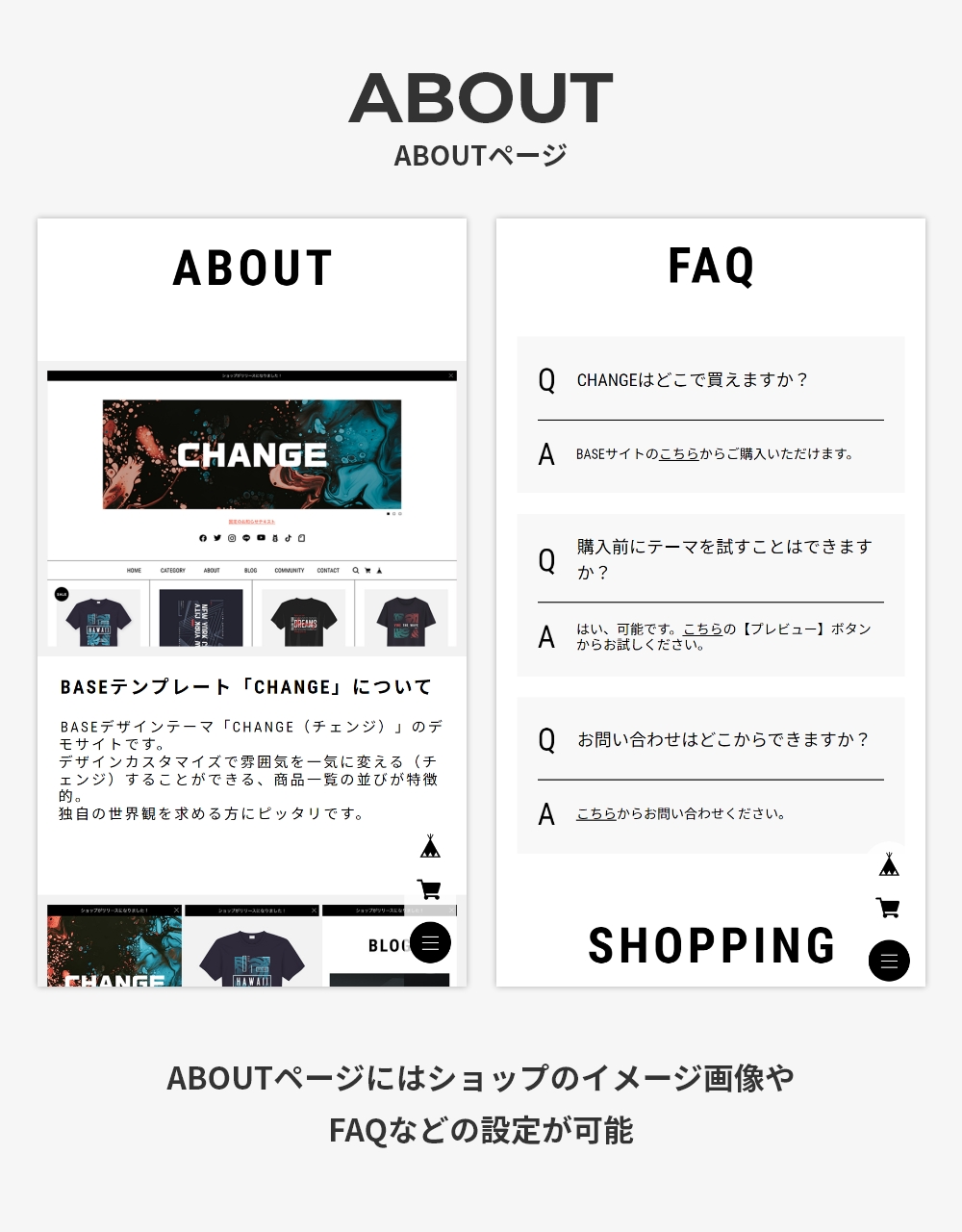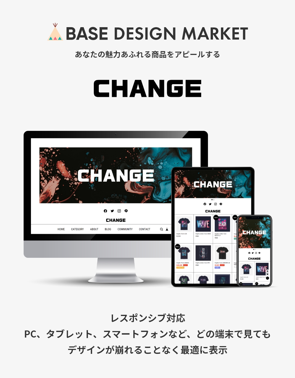 BASEテンプレート「CHANGE」は、シンプルかつオリジナリティを求める方にぴったりのテーマです。 トップページスライダーの下に商品一覧がある事で、あなたの魅力あふれる商品をすぐに目立たせることができます。 商品画像は拡大することができ、食品の様なシズル感を大事にする商材はもちろん繊細なアクセサリーや、画像を大きく見せたいイラストといったデータ商材、化粧品、家具、雑貨など、あらゆる商材にお使いいただけます。 ギャラリーは列数を変更したり、またはスライダーに変更できるなど、あらゆる要素を細かく設定することが可能です。 レスポンシブに対応していますので、PC、タブレット、スマホなど、どの端末で見てもデザインが崩れることなく最適に表示されます。 ─────────────────── ■デモショップ https://hameedemo05.base.shop/ ■テーマの詳細 https://hamee-consulting.co.jp/base/change ■よくあるご質問 https://hamee-consulting.co.jp/base/change#other_01 ─────────────────── 【主な機能】 ■フォントサイズ・ロゴ フォントは「Noto Sans JP」「Noto Serif JP」「M PLUS 1p」の3種類から選べます。 英数字に適用されるフォントも選べます。 ■各カラー メニュー部分やボタンカラーなど細かく色を設定することができます。 ■スライド トップページ上部にスライド画像を3枚まで設定できます。 ■FREE SPACE 文字、画像、リンクを変更することができます。 ■GALLERY 画像を最大6枚まで設置できます。スライダーにすることも可能です。 ■TOP BLOG Blog Appで書いた最新記事を3つまで表示します。 固定記事は一番左に表示されます。 ■FAQ 質問と回答を5つまで設定できます。 ■フッター ABOUTページへのSHOPPING GUIDEへのリンクと メールマガジンの表示ができます。 ■ABOUT 画像、FAQ、SHOPPING GUIDEの設定などが出来ます。 ■商品ページ 商品画像は拡大可能です。大きな画像で商品をアピールできます。 【対応Apps】 ・メンバーシップ ・メッセージ ・カテゴリ管理 ・送料詳細設定 ・BASEロゴ非表示 ・デジタルコンテンツ ・英語・外貨対応 ・Blog ・ラベル ・商品検索 ・定期便 ・レビュー ・セール ・販売期間設定 ・予約販売 ・抽選販売 ・商品説明カスタム ・商品オプション ・コミュニティ ・テイクアウト ・お知らせバナー ・メールマガジン ・再入荷自動通知 ・年齢制限 ■ 更新履歴 ・2025.12 ご利用可能クレジットカード変更に伴い画像を修正いたしました。 ・2025.06 Pay ID あと払いウィジェットが商品ページに表示されるようになりました。 ・2024.08 テーマの説明URLを変更いたしました。 ・2023.11 twitterアイコンをXに変更いたしました。 ・2023.06 メンバーシップAppに対応いたしました。