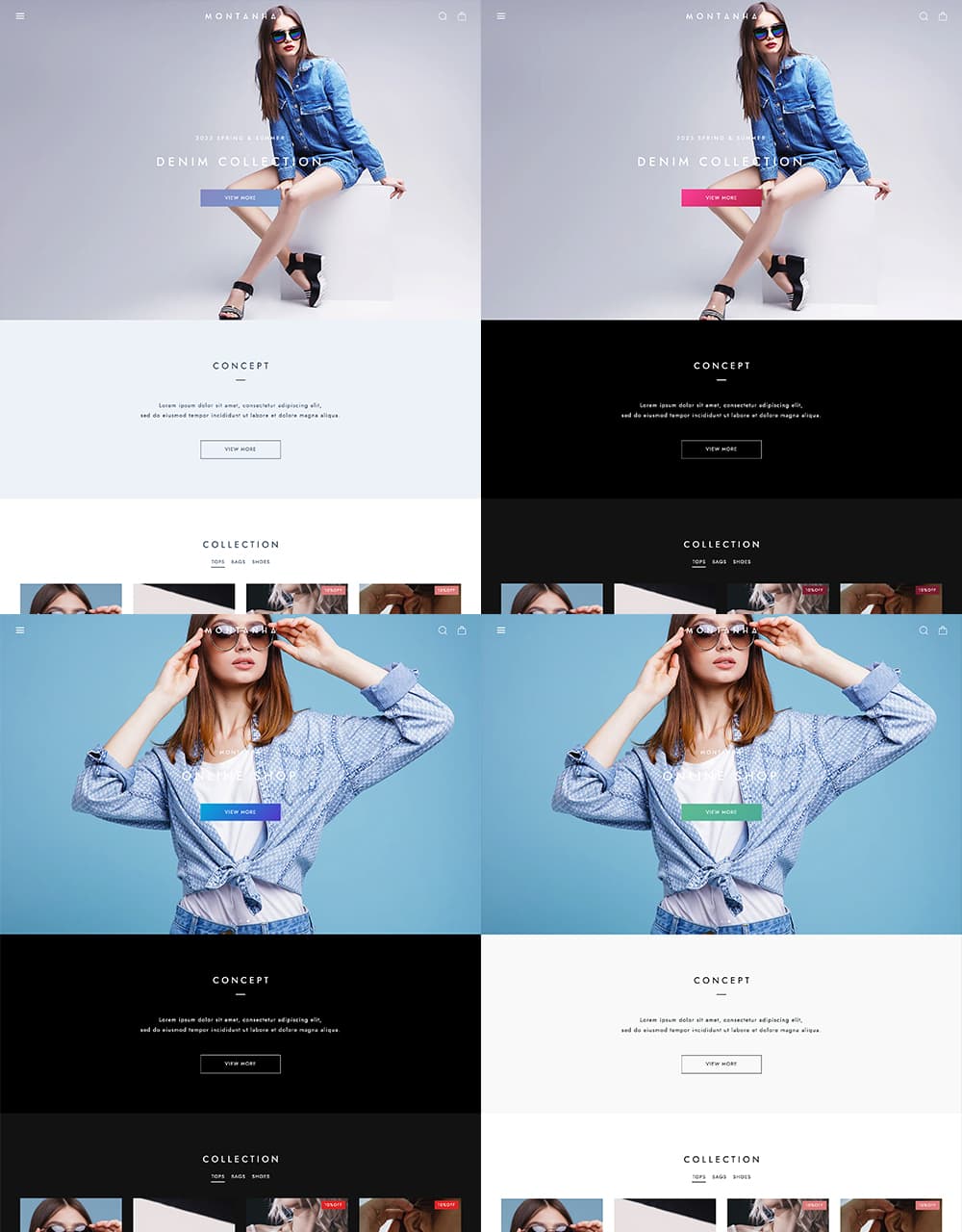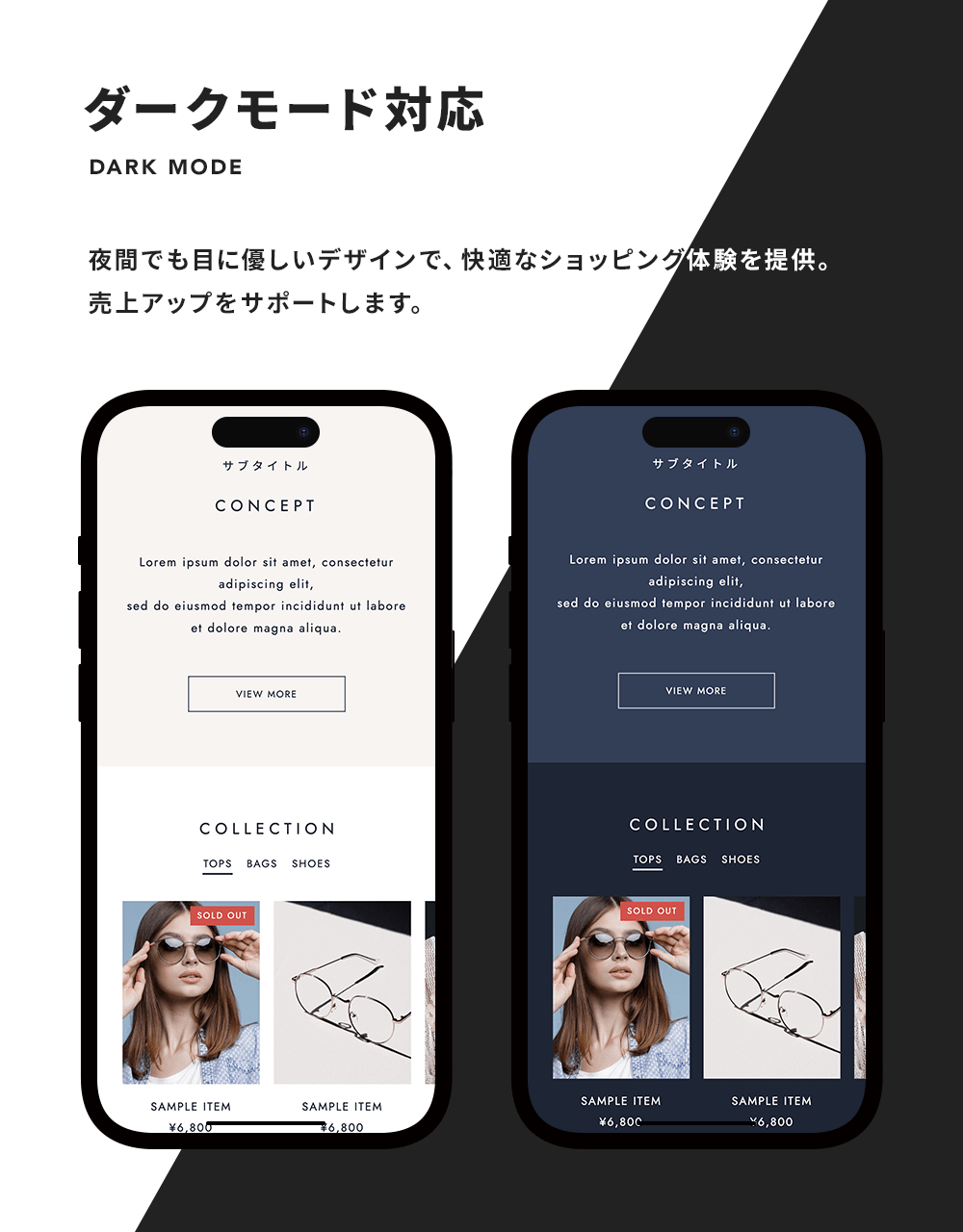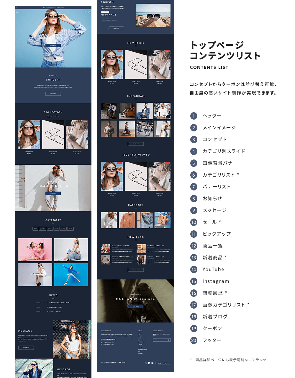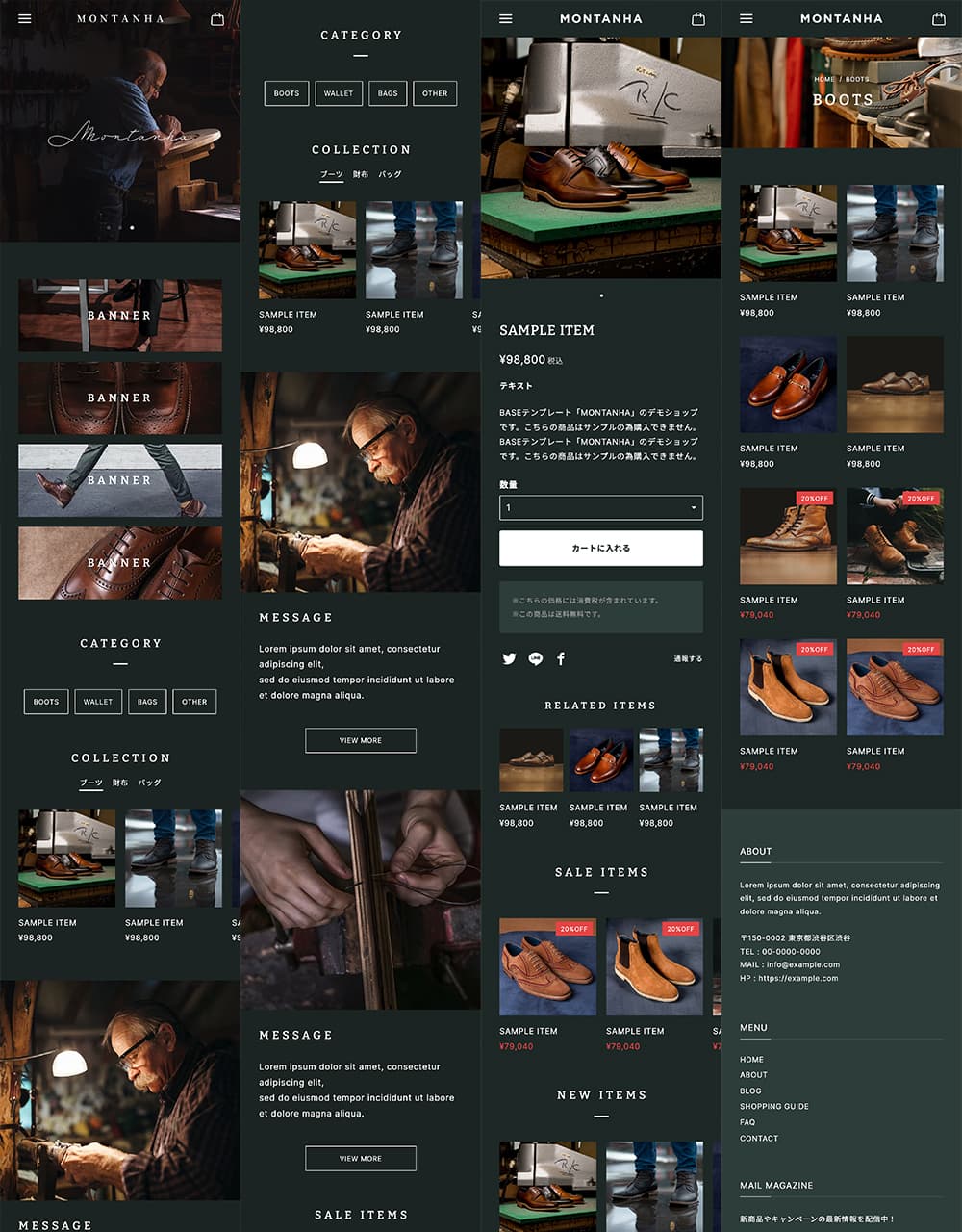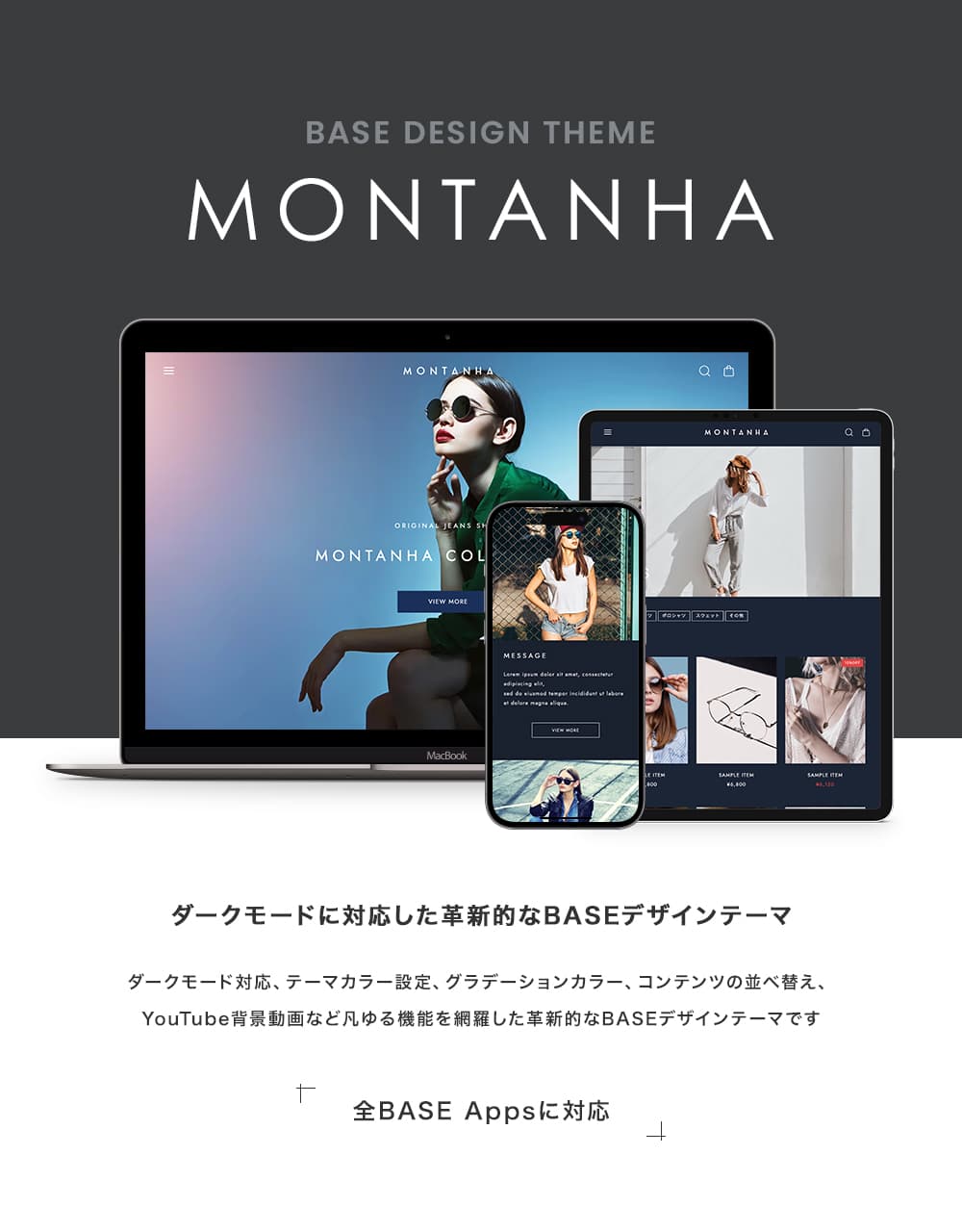 MONTANHAはダークモードに対応したBASEデザインテーマです。 ダークモードに加えて、テーマカラー設定、デザインパターン、グラデーションカラー、コンテンツの並べ替え、YouTube背景動画、Instagramの埋め込みなど、多様な機能を網羅しています。 ミニマル・シンプルデザインでどんなショップにもおすすめです。見出しデザイン・ボタンデザインなど高機能でカスタマイズ性も高いので他のサイトとの差別化もしやすいテーマとなっています。 さらに、TOPページには17種類のコンテンツを自由に並び替えることができるように設計しておりますので、使いたいコンテンツや目立たせたいコンテンツを上部に配置するなど、柔軟性の高いテンプレートとなっています。 まずはデモサイトやプレビューで実際のサイトをご確認ください。 ============================================ ■ デモショップ1 https://montanha.base.shop https://montanha.base.shop/items/75897983 ■ デモショップ2 https://montanha2.base.shop https://montanha2.base.shop/items/75922635 ============================================ ■ 主な特徴 ・ダークモード対応 時間帯で自動でカラーが変わります。 夜間でも目に優しいデザインで、快適なショッピング体験を提供。 売上アップをサポートします。 ・選べるデザイン設定 配色パターンと見出しデザイン、ボタンデザイン、ヘッダーレイアウトの組み合わせにより、 自由度の高いサイト制作が可能です。 ・フォント設定 見出し、本文で別々の設定が可能。 フォントの太さや文字間、全体の文字サイズを調整できます。 ・メインイメージ スライドパターン、背景画像の上に乗せるテキスト(または画像)の設定、 全画面設定など自由度の高いメインイメージ。 ・TOPページに17のコンテンツ 全17コンテンツ(下記トップページ コンテンツリスト参照)を自由に並び替え可能。 表示のON/OFFと組み合わせることで自由なサイト制作を実現しました。 ・表示アニメーション スクロールに合わせて要素がフェードインで表示されるアニメーションを搭載。 ユーザーの視線を自然に誘導し、サイト全体のダイナミックな印象を強調します。 ・Instagram埋め込み Instagramの投稿を外部ツールを使って埋め込みできます。 外部ツールはSnapWidgetやSauceが簡単でおすすめです。 ・YouTube背景動画コンテンツ YouTube動画を背景で再生するコンテンツが作成できます。 ・クーポンApp用のコンテンツ クーポン設定専用のコンテンツを用意。 クーポン配布時にご利用ください。 ・商品ページの設定 商品画像はスライド・画像1列・画像2列から選択可能。 スクロールで左右のコンテンツを追従したり、画像をズームする機能も搭載。 商品ページにもTOPページの一部コンテンツを表示させることでユーザーの離脱を防止します。 ・独自CSS、headタグ設定 上級者向け機能。 独自のCSSやJavaScriptの埋め込みも可能です。 ============================================ ■ トップページ コンテンツリスト 1. ヘッダー 2. メインイメージ 3. コンセプト 4. カテゴリ別スライド 5. 画像背景バナー 6. カテゴリリスト 7. バナーリスト 8. お知らせ 9. メッセージ 10. セール 11. ピックアップ 12. 商品一覧 13. 新着商品 14. YouTube 15. Instagram 16. 閲覧履歴 17. 画像カテゴリリスト 18. 新着ブログ 19. クーポン 20. フッター ============================================ ■ ダークモードの確認方法 テーマ設定>ダークモード設定をライトモードのみ、 ダークモードのみと切り替えることでそれぞれのカラーを確認できます。 ============================================ ■ 対応Apps テーマ側で対応が必要なAppsは基本的に全てのAppsに対応しています。 ============================================ ■ マニュアル テーマの設定は以下のオンラインマニュアルを参照ください。 https://base.grayelinc.com/montanha ============================================ ■ 姉妹テーマ OULU / 角丸を使った柔らかいデザイン、北欧デザインにおすすめ https://design.thebase.com/detail/114 HERMANS / 変則的な見出しデザイン、シャドウとグラデを使ったデザイン https://design.thebase.com/detail/113