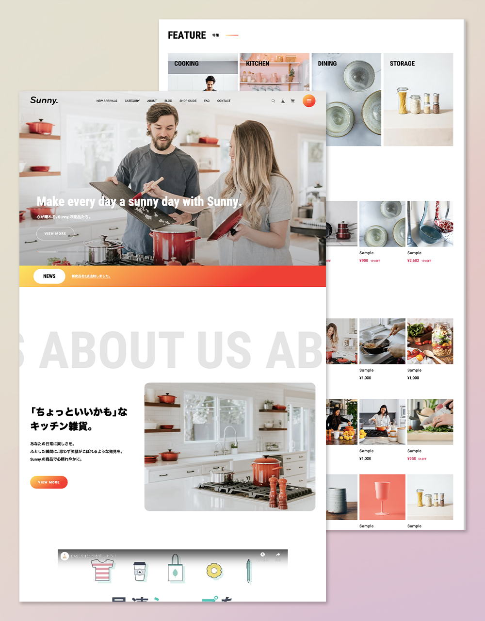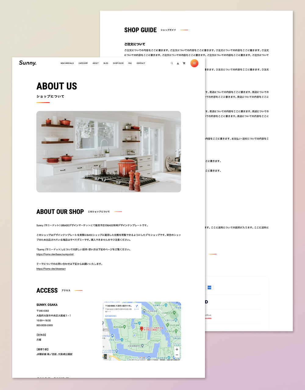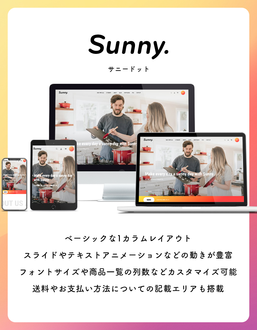 「Sunny.〈 サニードット 〉」はベーシックな1カラムレイアウトのデザイン。 LPのような作りの中に、ECサイトに必要な要素を詰め込みました。 フォントサイズや商品一覧の列数など細かなカスタマイズが可能。 送料やお支払い方法についての記載エリアも搭載。 キッチン用品、日用雑貨、インテリア、アパレル、食品、化粧品、など 様々な商品の販売にお使いいただけます。 ▼こんなショップにおすすめ ・ 小規模〜中規模 ・ ほどほどに機能が充実していて、カスタマイズしやすいテーマが良い ・ 柔らかい雰囲気のデザインを求めている ・ Instagramの埋め込み機能が欲しい =========================== ◆ Sunny.を利用したデモショップ https://sunnydot.base.ec/ ◆ テーマの詳細はこちら https://fromo.dev/base/sunny-dot/ =========================== ▼ 対応するBASE Appsについて ・メッセージApp ・カテゴリ管理App ・送料詳細設定App ・BASEロゴ非表示App ・デジタルコンテンツApp ・英語・外貨対応App ・BlogApp ・ラベルApp ・商品検索App ・定期便App ・レビューApp ・セールApp ・販売期間設定App ・予約販売App ・抽選販売App ・商品説明カスタムApp ・商品オプションApp ・コミュニティApp ・テイクアウトApp ・年齢制限App ・お知らせバナーApp ・メールマガジンApp ・メンバーシップApp ▼ テーマ概要 ◆ ヘッダー ・ヘッダー追従の有無を調整可能 ◆フッター ・送料・お支払い方法についての表示可能 ◆ TOPページ ・スライドを3枚まで設置可能 ・ABOUTページへの導線コンテンツ設置可能 ・PICK UPコンテンツを2つまで設置可能 ・特集バナーを4つまで設置可能 ・Instagram埋め込み表示可能(Sauce by SNPT) ・インフォメーションバーでお知らせ表示可能 ・YouTube動画の埋め込み可能 ・メインコンテンツの並び順を任意変更可能 ・OGP画像変更可能 ・1カラム〜6カラムまで任意設定可能(スマホでは1〜3カラム) ・新着ブログ一覧表示可能 ・セールAppで割引している商品の一覧を表示可能 ◆ ABOUTページ ・ショップガイドを設置可能 ・店舗へのアクセス情報を設置可能 ・送料・お支払い方法についての表示可能 ◆ 商品ページ ・最近見た商品の一覧を表示可能 ・セールAppで割引している商品の一覧を表示可能 ・クーポンコードなど任意のお知らせを掲載できるフリーテキスト機能 ◆ その他 ・フォントを明朝体に切り替え可能 ・フォントサイズの調整可能 ・各箇所の配色設定が可能 ・画面下部に追従バナー設置可能 ・どのページからでもポップアップ表示可能なFAQを10件まで設置可能 ・スクロールアニメーションの有無を切り替え可能 その他、詳細についてはテーマの説明ページをご覧ください。 =========================== ◆ テーマの詳細はこちら https://fromo.dev/base/sunny-dot/ ◆ ご質問・ご要望については下記サイトよりお願いいたします。 https://fromo.dev/ =========================== ◆ 更新情報 2026.2 ABOUTページ お支払い情報に「PayPay」を追加 2025.5 ABOUTページ お支払い情報に「Diners Club」を追加 2025.2 カートバッジ表示機能に対応 2024.11 Pay ID あと払いウィジェットに対応 2024.2 SNSアイコン画像を一部変更 2023.12 商品ページ 購入ボタンの配色変更機能を追加