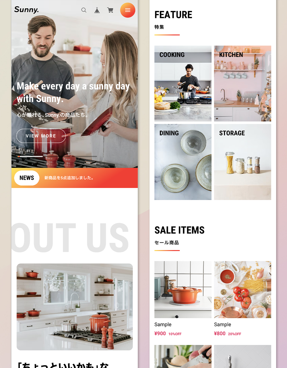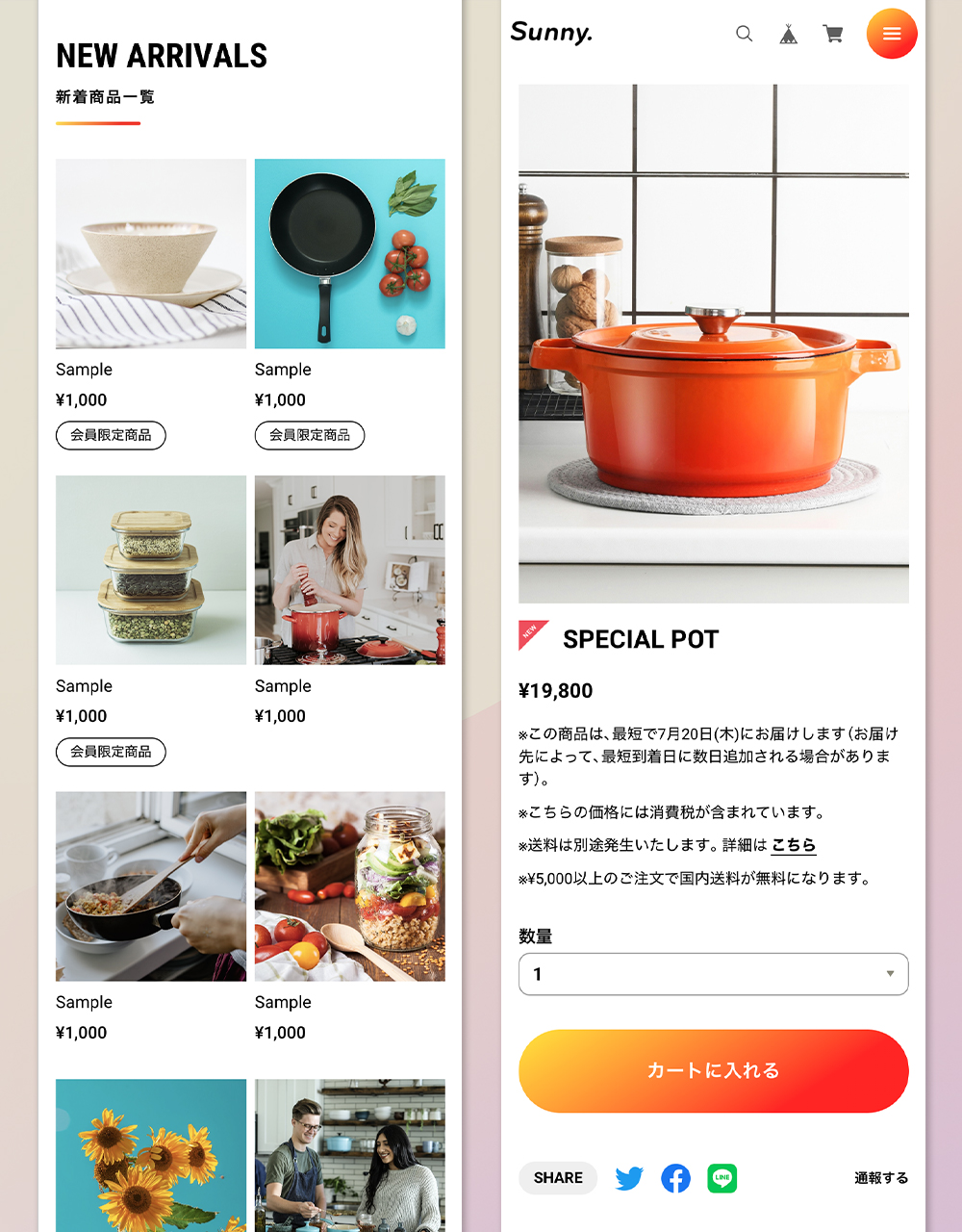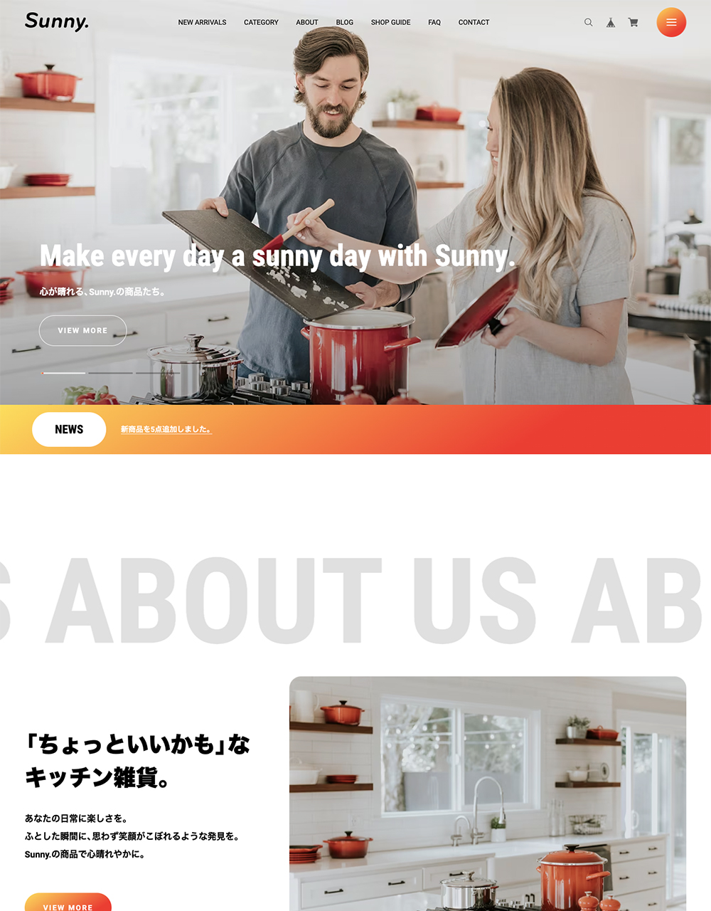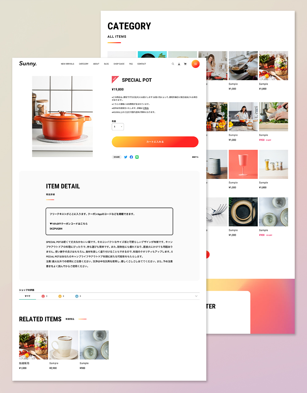 「Sunny.〈 サニードット 〉」はベーシックな1カラムレイアウトのデザイン。 LPのような作りの中に、ECサイトに必要な要素を詰め込みました。 フォントサイズや商品一覧の列数など細かなカスタマイズが可能。 送料やお支払い方法についての記載エリアも搭載。 キッチン用品、日用雑貨、インテリア、アパレル、食品、化粧品、など 様々な商品の販売にお使いいただけます。 ▼こんなショップにおすすめ ・ 小規模〜中規模 ・ ほどほどに機能が充実していて、カスタマイズしやすいテーマが良い ・ 柔らかい雰囲気のデザインを求めている ・ Instagramの埋め込み機能が欲しい =========================== ◆ Sunny.を利用したデモショップ https://sunnydot.base.ec/ ◆ テーマの詳細はこちら https://fromo.dev/base/sunny-dot/ =========================== ▼ 対応するBASE Appsについて ・メッセージApp ・カテゴリ管理App ・送料詳細設定App ・BASEロゴ非表示App ・デジタルコンテンツApp ・英語・外貨対応App ・BlogApp ・ラベルApp ・商品検索App ・定期便App ・レビューApp ・セールApp ・販売期間設定App ・予約販売App ・抽選販売App ・商品説明カスタムApp ・商品オプションApp ・コミュニティApp ・テイクアウトApp ・年齢制限App ・お知らせバナーApp ・メールマガジンApp ・メンバーシップApp ▼ テーマ概要 ◆ ヘッダー ・ヘッダー追従の有無を調整可能 ◆フッター ・送料・お支払い方法についての表示可能 ◆ TOPページ ・スライドを3枚まで設置可能 ・ABOUTページへの導線コンテンツ設置可能 ・PICK UPコンテンツを2つまで設置可能 ・特集バナーを4つまで設置可能 ・Instagram埋め込み表示可能(Sauce by SNPT) ・インフォメーションバーでお知らせ表示可能 ・YouTube動画の埋め込み可能 ・メインコンテンツの並び順を任意変更可能 ・OGP画像変更可能 ・1カラム〜6カラムまで任意設定可能(スマホでは1〜3カラム) ・新着ブログ一覧表示可能 ・セールAppで割引している商品の一覧を表示可能 ◆ ABOUTページ ・ショップガイドを設置可能 ・店舗へのアクセス情報を設置可能 ・送料・お支払い方法についての表示可能 ◆ 商品ページ ・最近見た商品の一覧を表示可能 ・セールAppで割引している商品の一覧を表示可能 ・クーポンコードなど任意のお知らせを掲載できるフリーテキスト機能 ◆ その他 ・フォントを明朝体に切り替え可能 ・フォントサイズの調整可能 ・各箇所の配色設定が可能 ・画面下部に追従バナー設置可能 ・どのページからでもポップアップ表示可能なFAQを10件まで設置可能 ・スクロールアニメーションの有無を切り替え可能 その他、詳細についてはテーマの説明ページをご覧ください。 =========================== ◆ テーマの詳細はこちら https://fromo.dev/base/sunny-dot/ ◆ ご質問・ご要望については下記サイトよりお願いいたします。 https://fromo.dev/ =========================== ◆ 更新情報 2026.2 ABOUTページ お支払い情報に「PayPay」を追加 2025.5 ABOUTページ お支払い情報に「Diners Club」を追加 2025.2 カートバッジ表示機能に対応 2024.11 Pay ID あと払いウィジェットに対応 2024.2 SNSアイコン画像を一部変更 2023.12 商品ページ 購入ボタンの配色変更機能を追加
