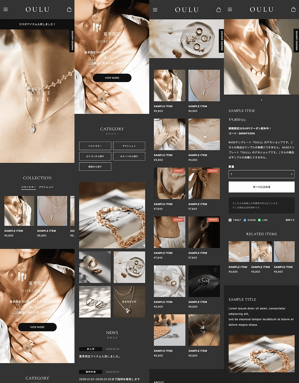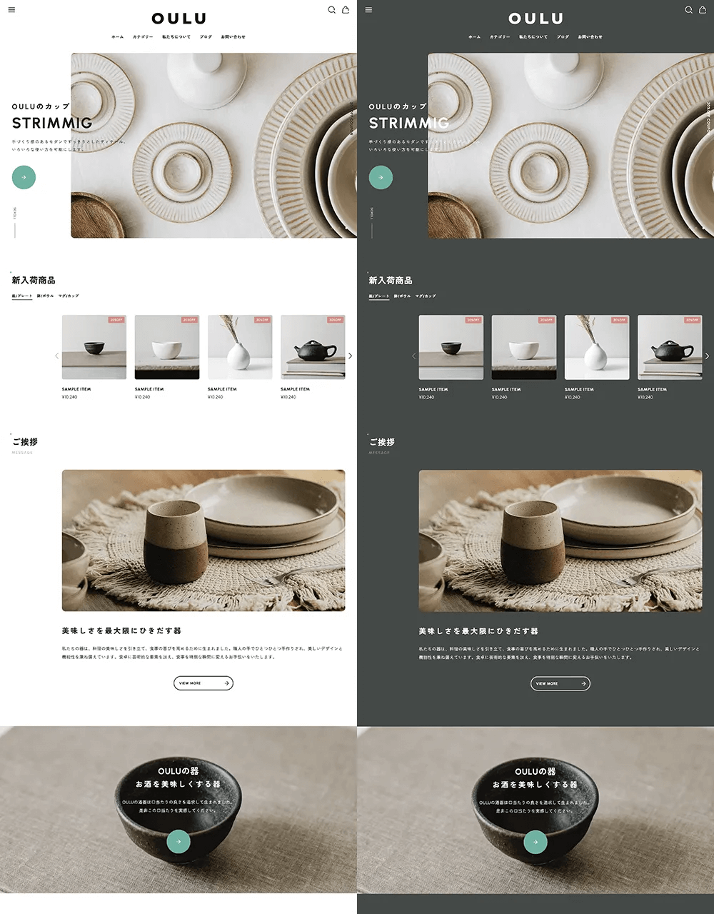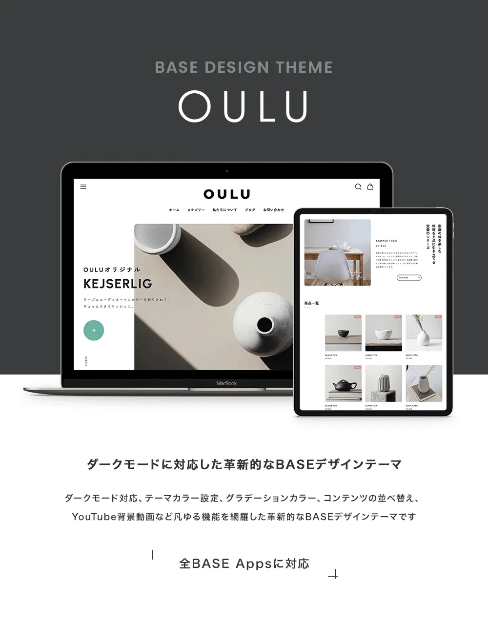 OULUはダークモードに対応したBASEデザインテーマです。 ダークモードに加えて、テーマカラー設定、デザインパターン、メインイメージのカスタム、コンテンツの並べ替え、YouTube背景動画、Instagramの埋め込みなど、多様な機能を網羅しています。 4つのメインイメージと角丸を使ったデザインタイプで北欧デザインや柔らかいイメージのデザイン、コンテンツを右寄せ配置にしたり、縦書きの見出しなどを使ったレイアウトで和風デザインにもおすすめです。 ============================================ ■ デモショップ1 https://oulu.base.shop/ https://oulu.base.shop/items/82937215 ■ デモショップ2 https://oulu2.base.shop/ https://oulu2.base.shop/items/82943698 ============================================ ■ 主な特徴 ・ダークモード対応 時間帯で自動でカラーが変わります。 夜間でも目に優しいデザインで、快適なショッピング体験を提供。 売上アップをサポートします。 ・選べるデザイン設定 配色パターンと見出しデザイン、ボタンデザイン、ヘッダーレイアウトの組み合わせにより、 自由度の高いサイト制作が可能です。 ・フォント設定 見出し、本文で別々の設定が可能。 フォントの太さや文字間、全体の文字サイズを調整できます。 ・メインイメージ スライドパターン、背景画像の上に乗せるテキスト(または画像)の設定、 全画面設定など自由度の高いメインイメージ。 ・TOPページに17のコンテンツ 全17コンテンツ(下記トップページ コンテンツリスト参照)を自由に並び替え可能。 表示のON/OFFと組み合わせることで自由なサイト制作を実現しました。 ・表示アニメーション スクロールに合わせて要素がフェードインで表示されるアニメーションを搭載。 ユーザーの視線を自然に誘導し、サイト全体のダイナミックな印象を強調します。 ・コンテンツサイズ 右寄せ(小さく)表示では、見出しとコンテンツを左右に振り分ける少し変わったデザインを搭載。 ・Instagram埋め込み Instagramの投稿を外部ツールを使って埋め込みできます。 外部ツールはSnapWidgetやSauceが簡単でおすすめです。 ・YouTube背景動画コンテンツ YouTube動画を背景で再生するコンテンツが作成できます。 ・クーポンApp用のコンテンツ クーポン設定専用のコンテンツを用意。 クーポン配布時にご利用ください。 ・商品ページの設定 商品画像はスライド・画像1列・画像2列から選択可能。 スクロールで左右のコンテンツを追従したり、画像をズームする機能も搭載。 商品ページにもTOPページの一部コンテンツを表示させることでユーザーの離脱を防止します。 ・独自CSS、headタグ設定 上級者向け機能。 独自のCSSやJavaScriptの埋め込みも可能です。 ============================================ ■ トップページ コンテンツリスト 1. ヘッダー 2. メインイメージ 3. コンセプト 4. カテゴリ別スライド 5. 画像背景バナー 6. カテゴリリスト 7. バナーリスト 8. お知らせ 9. メッセージ 10. セール 11. ピックアップ 12. 商品一覧 13. 新着商品 14. YouTube 15. Instagram 16. 閲覧履歴 17. 新着ブログ 18. クーポン 19. フッター ============================================ ■ ダークモードの確認方法 テーマ設定>ダークモード設定をライトモードのみ、 ダークモードのみと切り替えることでそれぞれのカラーを確認できます。 ============================================ ■ 対応Apps テーマ側で対応が必要なAppsは基本的に全てのAppsに対応しています。 ============================================ ■ マニュアル テーマの設定は以下のオンラインマニュアルを参照ください。 https://base.grayelinc.com/oulu ============================================ ■ 姉妹テーマ HERMANS / 変則的な見出しデザイン、シャドウとグラデを使ったデザイン https://design.thebase.com/detail/113 MONTANHA / ミニマル・シンプルデザイン、見出しやボタンの組み合わせ自由自在 https://design.thebase.com/detail/108
