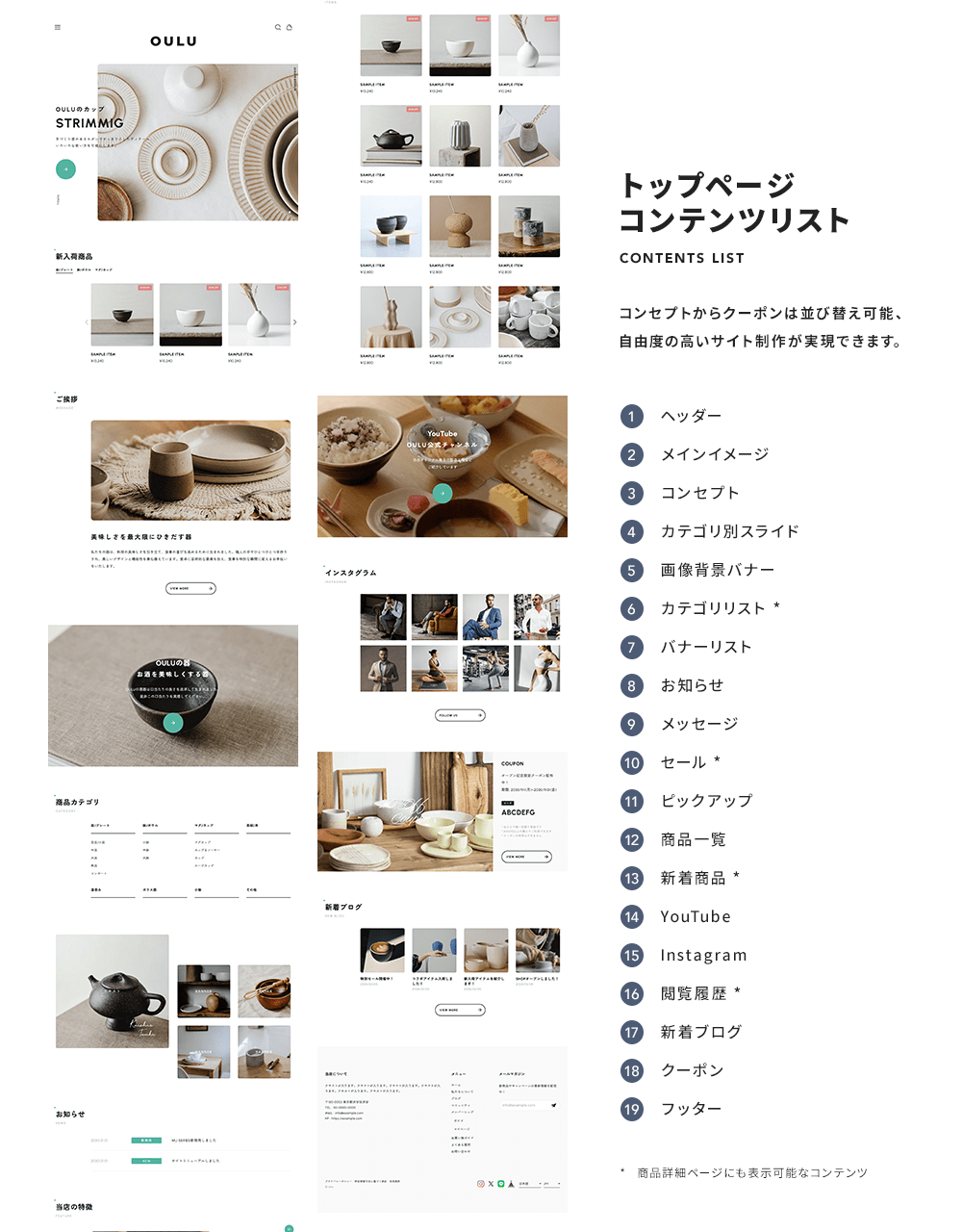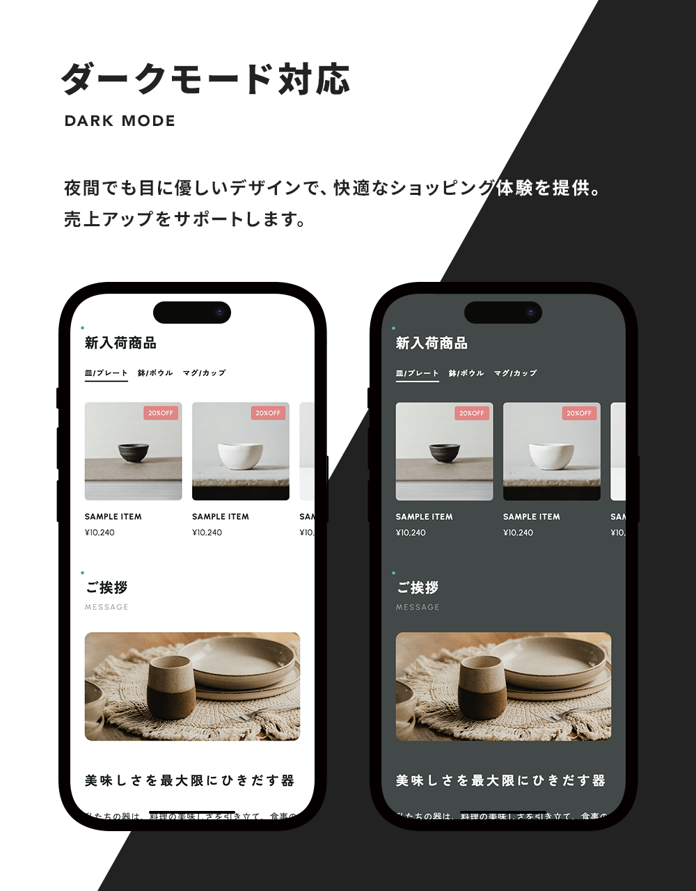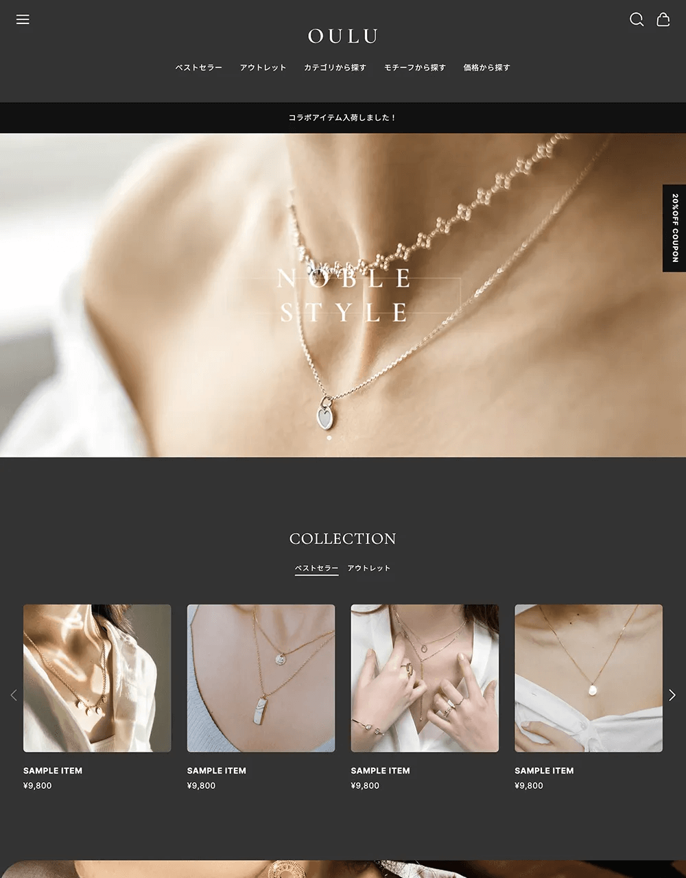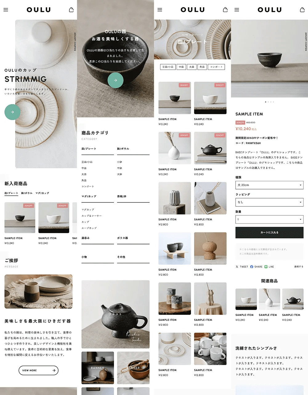 OULUはダークモードに対応したBASEデザインテーマです。 ダークモードに加えて、テーマカラー設定、デザインパターン、メインイメージのカスタム、コンテンツの並べ替え、YouTube背景動画、Instagramの埋め込みなど、多様な機能を網羅しています。 4つのメインイメージと角丸を使ったデザインタイプで北欧デザインや柔らかいイメージのデザイン、コンテンツを右寄せ配置にしたり、縦書きの見出しなどを使ったレイアウトで和風デザインにもおすすめです。 ============================================ ■ デモショップ1 https://oulu.base.shop/ https://oulu.base.shop/items/82937215 ■ デモショップ2 https://oulu2.base.shop/ https://oulu2.base.shop/items/82943698 ============================================ ■ 主な特徴 ・ダークモード対応 時間帯で自動でカラーが変わります。 夜間でも目に優しいデザインで、快適なショッピング体験を提供。 売上アップをサポートします。 ・選べるデザイン設定 配色パターンと見出しデザイン、ボタンデザイン、ヘッダーレイアウトの組み合わせにより、 自由度の高いサイト制作が可能です。 ・フォント設定 見出し、本文で別々の設定が可能。 フォントの太さや文字間、全体の文字サイズを調整できます。 ・メインイメージ スライドパターン、背景画像の上に乗せるテキスト(または画像)の設定、 全画面設定など自由度の高いメインイメージ。 ・TOPページに17のコンテンツ 全17コンテンツ(下記トップページ コンテンツリスト参照)を自由に並び替え可能。 表示のON/OFFと組み合わせることで自由なサイト制作を実現しました。 ・表示アニメーション スクロールに合わせて要素がフェードインで表示されるアニメーションを搭載。 ユーザーの視線を自然に誘導し、サイト全体のダイナミックな印象を強調します。 ・コンテンツサイズ 右寄せ(小さく)表示では、見出しとコンテンツを左右に振り分ける少し変わったデザインを搭載。 ・Instagram埋め込み Instagramの投稿を外部ツールを使って埋め込みできます。 外部ツールはSnapWidgetやSauceが簡単でおすすめです。 ・YouTube背景動画コンテンツ YouTube動画を背景で再生するコンテンツが作成できます。 ・クーポンApp用のコンテンツ クーポン設定専用のコンテンツを用意。 クーポン配布時にご利用ください。 ・商品ページの設定 商品画像はスライド・画像1列・画像2列から選択可能。 スクロールで左右のコンテンツを追従したり、画像をズームする機能も搭載。 商品ページにもTOPページの一部コンテンツを表示させることでユーザーの離脱を防止します。 ・独自CSS、headタグ設定 上級者向け機能。 独自のCSSやJavaScriptの埋め込みも可能です。 ============================================ ■ トップページ コンテンツリスト 1. ヘッダー 2. メインイメージ 3. コンセプト 4. カテゴリ別スライド 5. 画像背景バナー 6. カテゴリリスト 7. バナーリスト 8. お知らせ 9. メッセージ 10. セール 11. ピックアップ 12. 商品一覧 13. 新着商品 14. YouTube 15. Instagram 16. 閲覧履歴 17. 新着ブログ 18. クーポン 19. フッター ============================================ ■ ダークモードの確認方法 テーマ設定>ダークモード設定をライトモードのみ、 ダークモードのみと切り替えることでそれぞれのカラーを確認できます。 ============================================ ■ 対応Apps テーマ側で対応が必要なAppsは基本的に全てのAppsに対応しています。 ============================================ ■ マニュアル テーマの設定は以下のオンラインマニュアルを参照ください。 https://base.grayelinc.com/oulu ============================================ ■ 姉妹テーマ HERMANS / 変則的な見出しデザイン、シャドウとグラデを使ったデザイン https://design.thebase.com/detail/113 MONTANHA / ミニマル・シンプルデザイン、見出しやボタンの組み合わせ自由自在 https://design.thebase.com/detail/108
