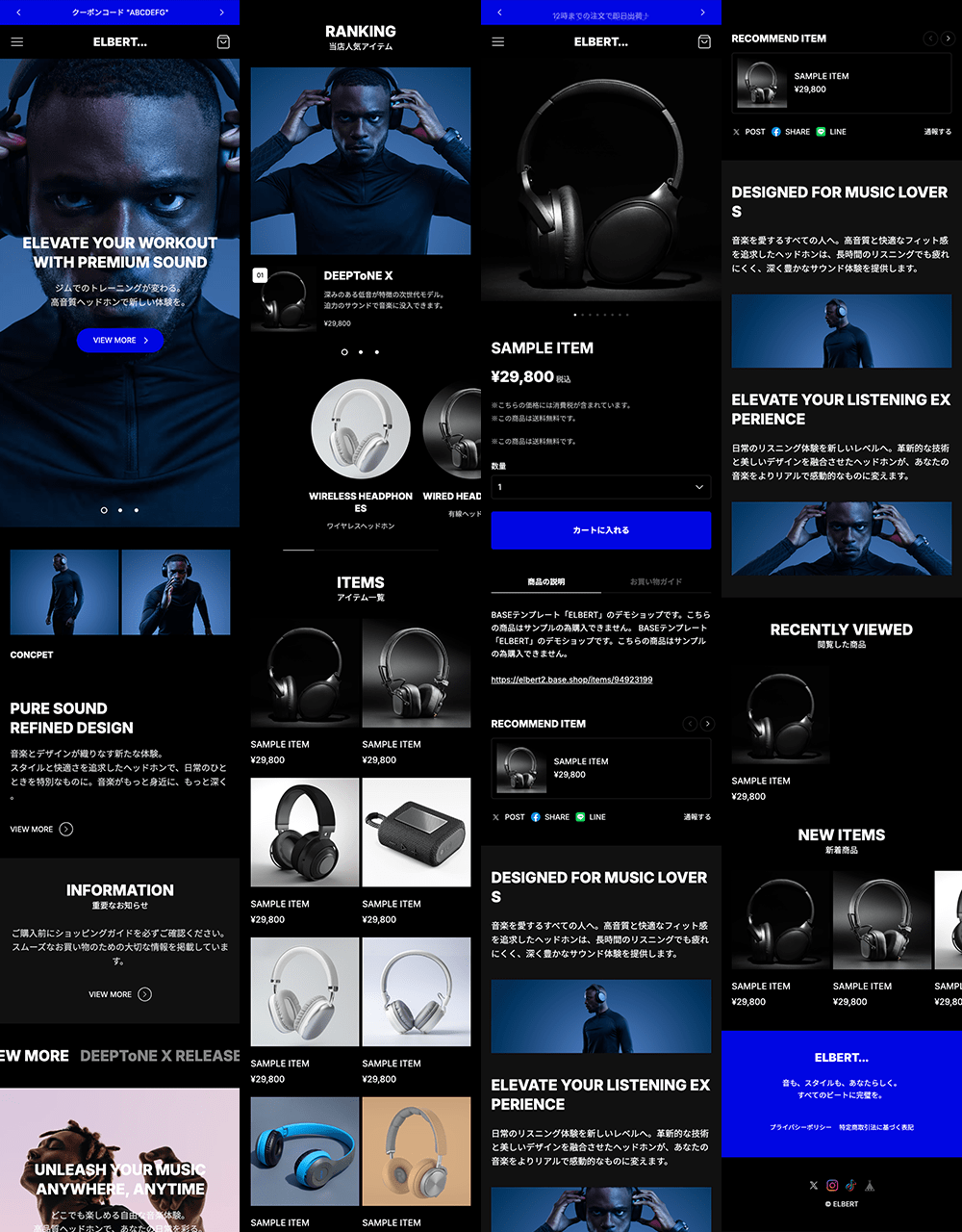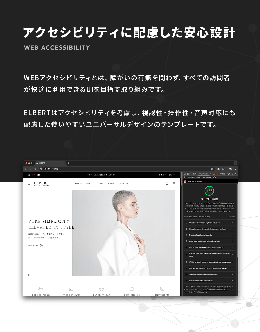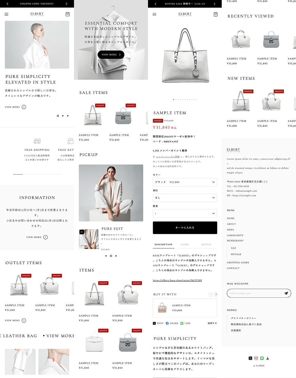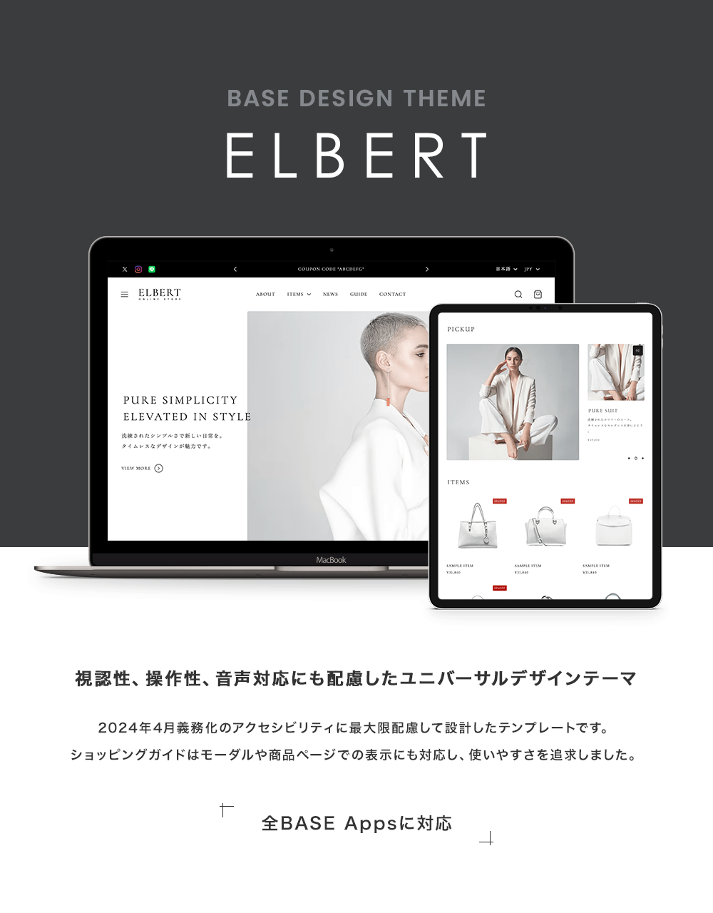 ELBERTはアクセシビリティを考慮し、視認性・操作性・音声対応に配慮した安心設計のユニバーサルデザインのBASEテーマです。 ショッピングガイドはモーダル表示や商品ページでの表示に対応しており、購入をスムーズにサポートします。 TOPページには16のコンテンツを配置、コンテンツの並び替え、YouTube背景設定、Instagramの埋め込みなど、多彩な機能が搭載されています。 ============================================ ■ デモショップ1 https://elbert.base.shop/ https://elbert.base.shop/items/94157303 ■ デモショップ2 https://elbert2.base.shop/ https://elbert2.base.shop/items/94923199 ============================================ ■ 主な特徴 ・アクセシビリティに配慮したテーマ設計 視認性・操作性・音声対応にも配慮した使いやすいユニバーサルデザインテーマです。 ・使いやすいショッピングガイド モーダル表示や商品ページの表示に対応したショッピングガイド。 ・全体の細かな調整 要素間の間隔やテキストの行間などが細かく調整可能で、 デモサイト1のようなすっきりしたデザインから、デモサイト2ようのな要素が詰まったようなデザインまで、 いろいろなデザインにご利用できるテーマです。 ・便利なサブヘッダー サブヘッダーを配置し、SNSや翻訳などサイトの必要な機能を配置。 非表示にすることも可能です。 ・ヘッダー設定 ヘッダーの追従タイプ、追従時のデザイン、高さ、レイアウトなど、 サイトに合わせて細かな調整が可能です。 ・自由なメインイメージ トップページはすべてのコンテンツが並び替え可能なため、 スライダーを使ったメインイメージのほか、コンセプトやYouTube動画など 好きなコンテンツをページ上部に設定できます。 ・TOPページに17のコンテンツ 全17コンテンツ(下記トップページ コンテンツリスト参照)を自由に並び替え可能。 表示のON/OFFと組み合わせることで自由なサイト制作を実現しました。 ・表示アニメーション スクロールに合わせて要素がフェードインで表示されるアニメーションを搭載。 ユーザーの視線を自然に誘導し、サイト全体のダイナミックな印象を強調します。 ・Instagram埋め込み Instagramの投稿を外部ツールを使って埋め込みできます。 外部ツールはSnapWidgetやSauceが簡単でおすすめです。 ・YouTube背景動画コンテンツ YouTube動画を背景で再生するコンテンツが作成できます。 ・Markdown記法の適用 上級者向けの機能となりますが、 商品説明、ショッピングガイドはMarkdown記法にも対応しています。 ・独自CSS、headタグ設定 上級者向け機能。 独自のCSSやJavaScriptの埋め込みも可能です。 ============================================ ■ トップページ コンテンツリスト 1. ヘッダー 2. メインイメージ 3. 固定ブログ 4. バナー 5. お知らせ 6. カテゴリスライド 7. ループテキスト 8. コンセプト 9. 画像背景バナー01 10. ピックアップ 11. 新着商品 12. セール 13. 閲覧履歴 14. 画像背景バナー02 15. 商品一覧 16. YouTube 17. Instagram 18. 新着ブログ/お知らせ 19. フッター ============================================ ■ 対応Apps テーマ側で対応が必要なAppsは基本的に全てのAppsに対応しています。 ============================================ ■ マニュアル テーマの設定は以下のオンラインマニュアルを参照ください。 https://base.grayelinc.com/elbert ============================================ ■ その他おすすめテーマ OULU / 角丸を使った柔らかいデザイン、北欧デザインにおすすめ https://design.thebase.com/detail/114 MCKENLEY / サイドバーデザイン、他と差をつけたい方におすすめ https://design.thebase.com/detail/121