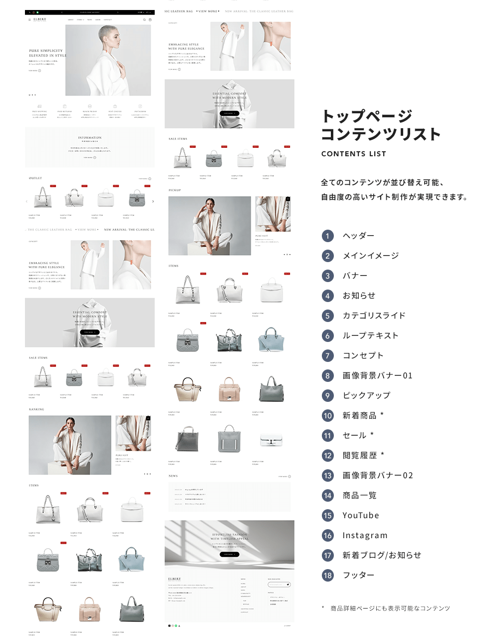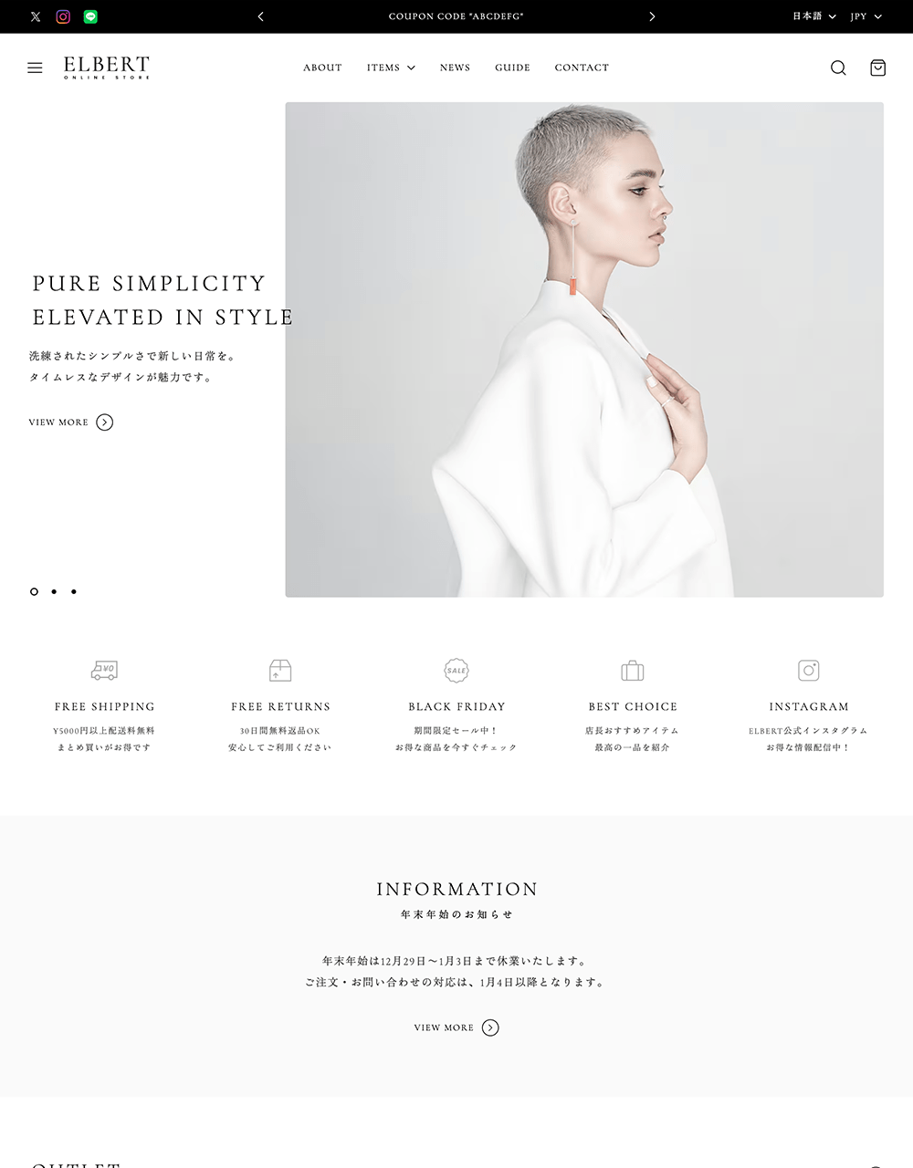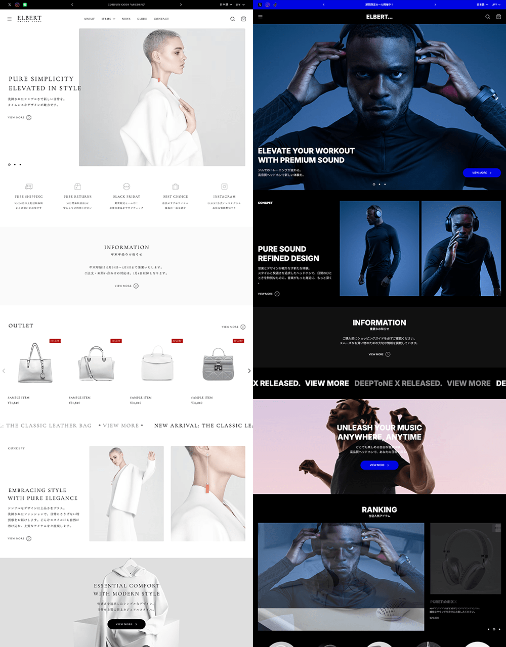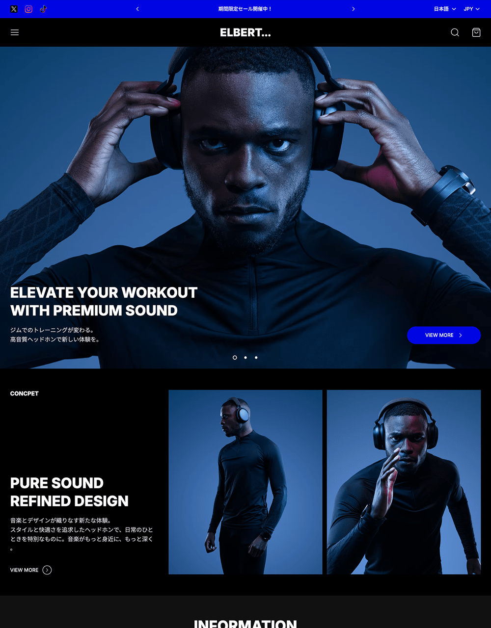 ELBERTはアクセシビリティを考慮し、視認性・操作性・音声対応に配慮した安心設計のユニバーサルデザインのBASEテーマです。 ショッピングガイドはモーダル表示や商品ページでの表示に対応しており、購入をスムーズにサポートします。 TOPページには16のコンテンツを配置、コンテンツの並び替え、YouTube背景設定、Instagramの埋め込みなど、多彩な機能が搭載されています。 ============================================ ■ デモショップ1 https://elbert.base.shop/ https://elbert.base.shop/items/94157303 ■ デモショップ2 https://elbert2.base.shop/ https://elbert2.base.shop/items/94923199 ============================================ ■ 主な特徴 ・アクセシビリティに配慮したテーマ設計 視認性・操作性・音声対応にも配慮した使いやすいユニバーサルデザインテーマです。 ・使いやすいショッピングガイド モーダル表示や商品ページの表示に対応したショッピングガイド。 ・全体の細かな調整 要素間の間隔やテキストの行間などが細かく調整可能で、 デモサイト1のようなすっきりしたデザインから、デモサイト2ようのな要素が詰まったようなデザインまで、 いろいろなデザインにご利用できるテーマです。 ・便利なサブヘッダー サブヘッダーを配置し、SNSや翻訳などサイトの必要な機能を配置。 非表示にすることも可能です。 ・ヘッダー設定 ヘッダーの追従タイプ、追従時のデザイン、高さ、レイアウトなど、 サイトに合わせて細かな調整が可能です。 ・自由なメインイメージ トップページはすべてのコンテンツが並び替え可能なため、 スライダーを使ったメインイメージのほか、コンセプトやYouTube動画など 好きなコンテンツをページ上部に設定できます。 ・TOPページに17のコンテンツ 全17コンテンツ(下記トップページ コンテンツリスト参照)を自由に並び替え可能。 表示のON/OFFと組み合わせることで自由なサイト制作を実現しました。 ・表示アニメーション スクロールに合わせて要素がフェードインで表示されるアニメーションを搭載。 ユーザーの視線を自然に誘導し、サイト全体のダイナミックな印象を強調します。 ・Instagram埋め込み Instagramの投稿を外部ツールを使って埋め込みできます。 外部ツールはSnapWidgetやSauceが簡単でおすすめです。 ・YouTube背景動画コンテンツ YouTube動画を背景で再生するコンテンツが作成できます。 ・Markdown記法の適用 上級者向けの機能となりますが、 商品説明、ショッピングガイドはMarkdown記法にも対応しています。 ・独自CSS、headタグ設定 上級者向け機能。 独自のCSSやJavaScriptの埋め込みも可能です。 ============================================ ■ トップページ コンテンツリスト 1. ヘッダー 2. メインイメージ 3. 固定ブログ 4. バナー 5. お知らせ 6. カテゴリスライド 7. ループテキスト 8. コンセプト 9. 画像背景バナー01 10. ピックアップ 11. 新着商品 12. セール 13. 閲覧履歴 14. 画像背景バナー02 15. 商品一覧 16. YouTube 17. Instagram 18. 新着ブログ/お知らせ 19. フッター ============================================ ■ 対応Apps テーマ側で対応が必要なAppsは基本的に全てのAppsに対応しています。 ============================================ ■ マニュアル テーマの設定は以下のオンラインマニュアルを参照ください。 https://base.grayelinc.com/elbert ============================================ ■ その他おすすめテーマ OULU / 角丸を使った柔らかいデザイン、北欧デザインにおすすめ https://design.thebase.com/detail/114 MCKENLEY / サイドバーデザイン、他と差をつけたい方におすすめ https://design.thebase.com/detail/121