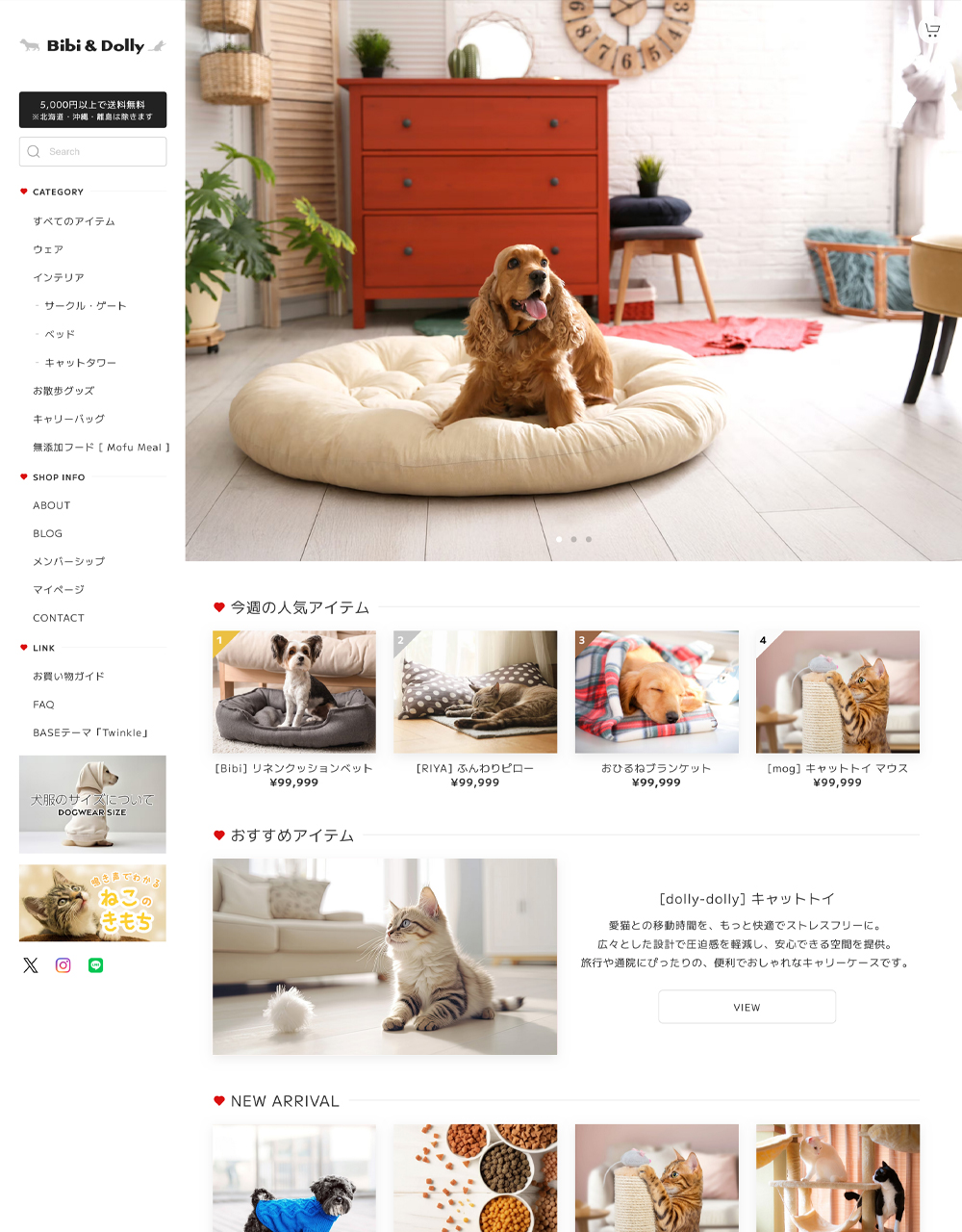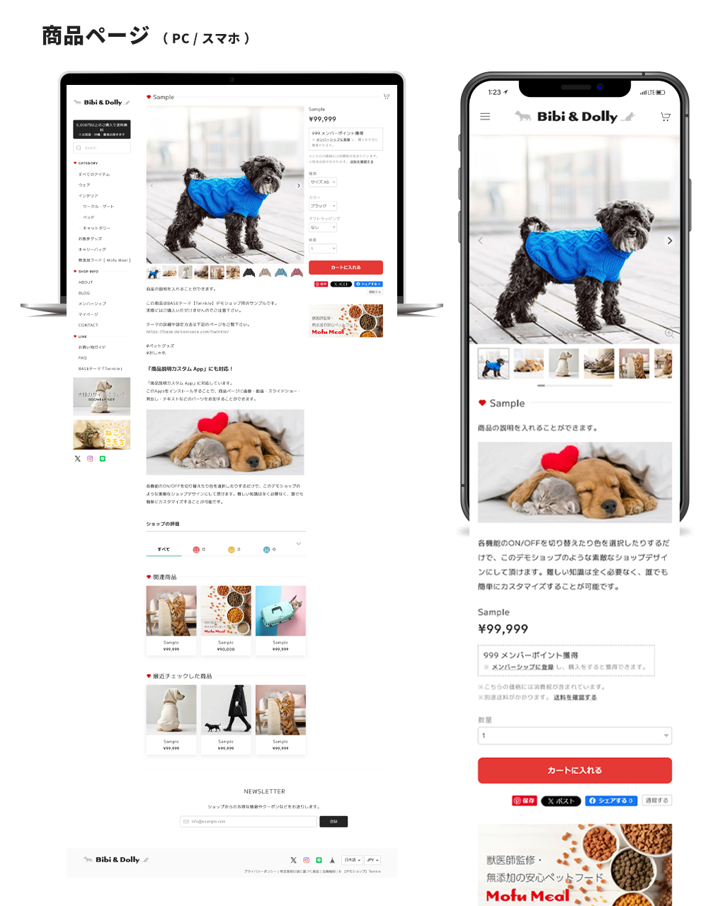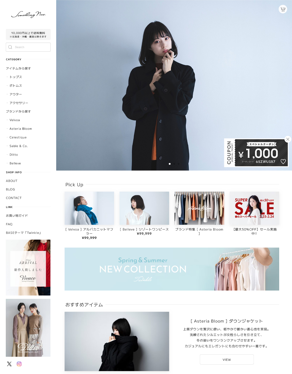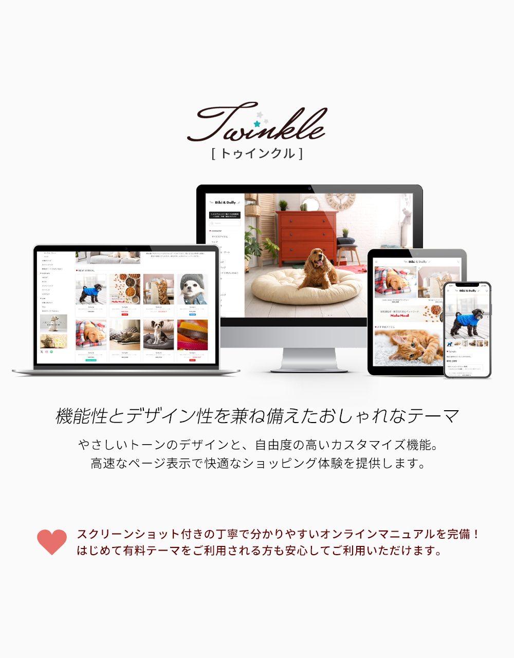 『Twinkle』は機能性とデザイン性を兼ね備えたおしゃれなテーマです。 やさしいトーンのデザインと、自由度の高いカスタマイズ機能。 高速なページ表示で快適なショッピング体験を提供します。 簡単な設定で自由にカスタマイズすることが可能となっており、 はじめて有料テーマをご利用される方にも最適なテーマとなっています。 --------------------------------------------------------------------------------------------------- 【 デモショップ1(可愛い / カジュアル)】 https://demosite.fashionstore.jp/ 【 デモショップ2(おしゃれ / クール)】 https://demosite2.fashionstore.jp/ 【 説明サイト(デザインや機能のご案内) 】 https://base.dolcevivace.com/twinkle/ 【 オンラインマニュアル 】 https://base.dolcevivace.com/twinkle/#manual --------------------------------------------------------------------------------------------------- 機能のON/OFFを切り替えたり、色や画像を選ぶだけの簡単操作で ショップを自由にカスタマイズすることが可能です。 画像付きのわかりやすいオンラインマニュアルもご用意しています。 ◆ ワンポイントアイコン デザインのアクセントになるアイコンを表示できます。 好みに応じてハートや星などのアイコンタイプを選択可能です。 アイコンのカラーは自由に変更することができます。 ◆ メインビジュアル PCではサイドバー以外の画面全体、スマホではファーストビュー全体を覆う印象的なスライダーです。どんな画面サイズでも最適化されて美しく表示されます。 画像はPC用/スマホ用にそれぞれ5枚まで設定可能です。 ◆ フローティングバナー トップページの固定位置に追従するバナーを設置することができます。 フローティングバナーは「毎回表示」と「10分後に再度表示」が選択可能です。 ◆ 送料表示 サイドバー/スライドメニューに送料を表示することができます。 送料のテキスト内容やカラーを自由に設定することが可能です。 ◆ 重要なお知らせ表示 お客様に伝えたい重要なお知らせを見やすく表示することができます。 お知らせのテキスト内容、カラー、背景色、リンク先を自由に設定可能です。 ◆ ピックアップ(ランキングとしても利用可能) ピックアップアイテムを4件まで表示することができます。 画像/テキスト/リンクを自由に設定可能です。 ランキングアイコンを表示することもできます。 PCでは最大4アイテムが1行で表示され、スマホでは横に2アイテム表示されます。 ◆ おすすめアイテム トップページに「おすすめアイテム」を表示することができます。 画像/見出し/テキスト/リンクボタンを設定することができます。 商品以外にも、ショップのコンセプトなどを紹介する目的にも利用可能です。 ◆ トップページバナー トップページにバナーを表示することができます。 バナーには自由なリンク先を設定することができます。 ◆ サイドバナー サイドバー/スライドメニューにバナーを2枚まで設定可能です。 各バナーには自由なリンク先を設定することができます。 ◆ ニュース / 新着情報表示 新着情報を3件まで表示することができます。 日付、内容、リンクを設定することができます。 ◆ ブログ最新記事 トップページに「ブログApps」の記事を4件まで自動的に取得して表示可能です。 ◆ Instagram表示 “SnapWidget” 等の外部サービスを利用してInstagramを埋め込み表示可能です。 ◆ 最近チェックした商品(閲覧履歴) トップページや商品ページに商品の閲覧履歴を表示することができます。 ◆ アバウトページカスタマイズ アバウトページにBASE管理画面で設定した「ショップの説明」に追加して、 画像やカスタムショップ情報を表示することができます。 ◆ 商品ページカスタマイズ 全ての商品ページに共通するバナーを表示することができます。 購入ボタンのカラーを変更することも可能です。 ◆ カラー設定 テーマカラーは暗い背景用と明るい背景用を簡単に切り替えることが可能です。 購入ボタンや各テーマ機能は個別に色を設定可能です。 ◆ メニュー設定 「Home」「About」「Blog」「Contact」などのナビゲーションテキストや、 「Category」「Information」などのタイトルを変更することが可能です。 ◆ アイテム設定 商品画像を正方形に自動トリミングすることが可能です。 1行の商品説明を表示したり、拡大エフェクトをつけることもできます。 ◆ BASE Apps設定 「メンバーシップ Apps」「コミュニティ Apps」「メールマガジン App」に関する設定をすることができます。 ◆ 独自スタイルシート(CSS)設定 知識のある上級者の方はCSSを追加記述していただくことも可能です。 --------------------------------------------------------------------------------------------------- 【 スマートフォン最適化 & レスポンシブデザイン 】 全デバイスで美しく表示されるよう最適化されたレスポンシブデザインを採用。 視認性や操作性を重視した設計が高いパフォーマンスを発揮します。 【 各種BASE Apps対応 】 有料テーマで利用可能な「全てのBASE Apps」に対応しています。 【 オンライン