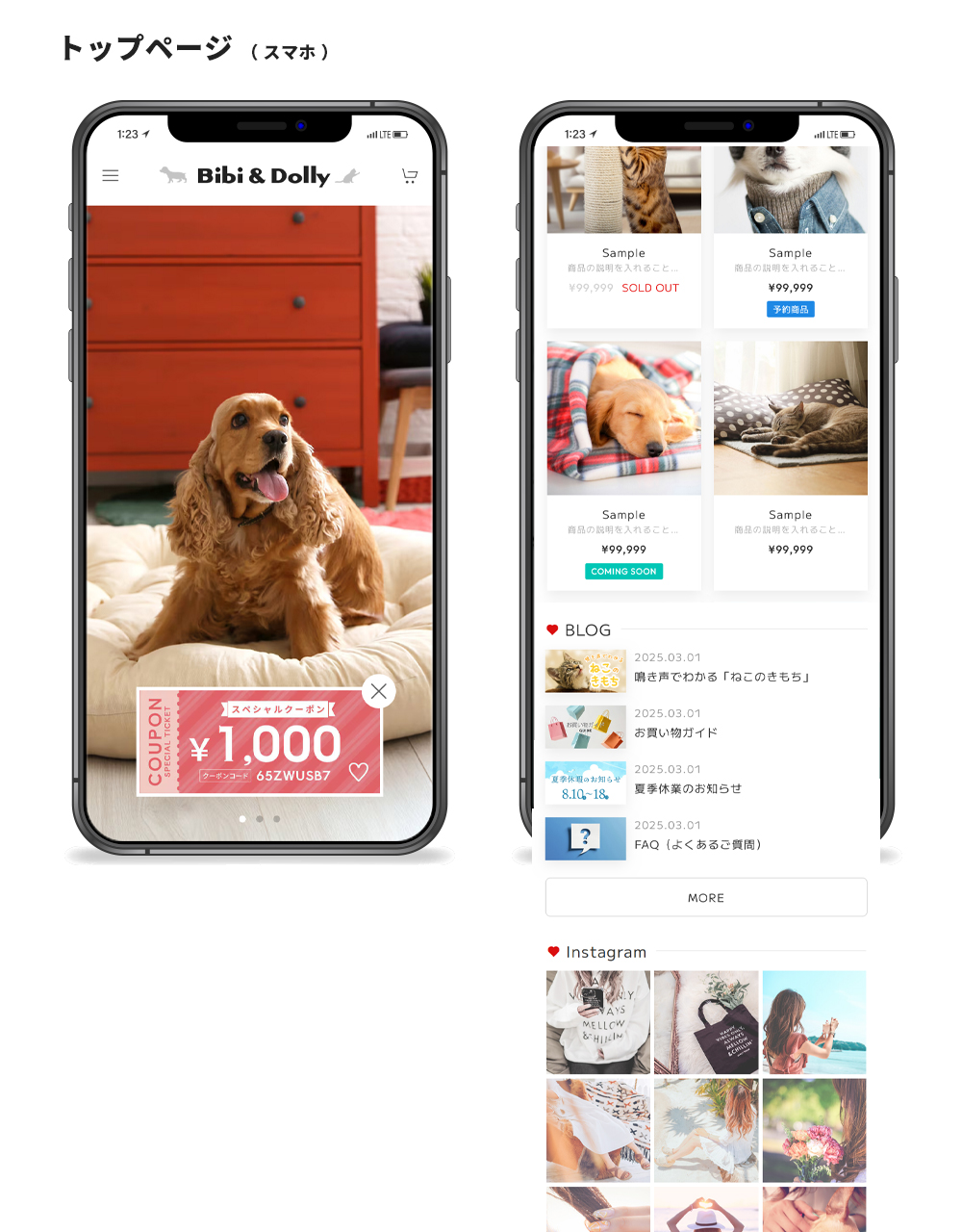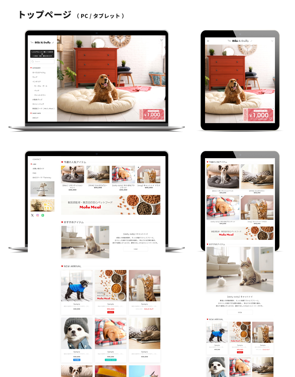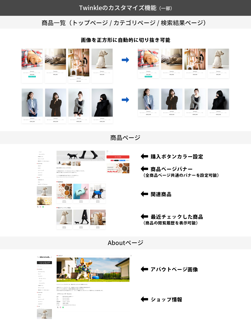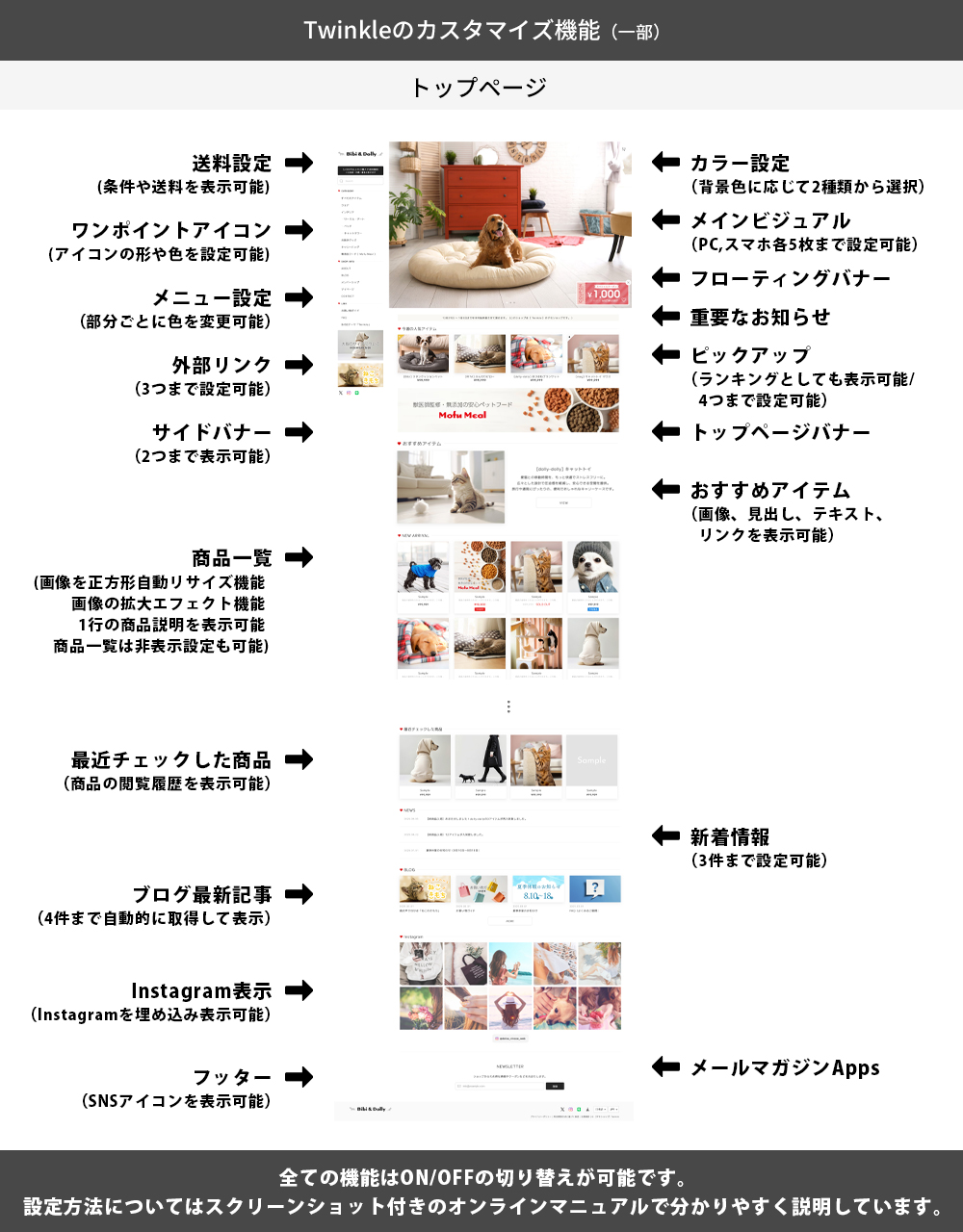 『Twinkle』は機能性とデザイン性を兼ね備えたおしゃれなテーマです。 やさしいトーンのデザインと、自由度の高いカスタマイズ機能。 高速なページ表示で快適なショッピング体験を提供します。 簡単な設定で自由にカスタマイズすることが可能となっており、 はじめて有料テーマをご利用される方にも最適なテーマとなっています。 --------------------------------------------------------------------------------------------------- 【 デモショップ1(可愛い / カジュアル)】 https://demosite.fashionstore.jp/ 【 デモショップ2(おしゃれ / クール)】 https://demosite2.fashionstore.jp/ 【 説明サイト(デザインや機能のご案内) 】 https://base.dolcevivace.com/twinkle/ 【 オンラインマニュアル 】 https://base.dolcevivace.com/twinkle/#manual --------------------------------------------------------------------------------------------------- 機能のON/OFFを切り替えたり、色や画像を選ぶだけの簡単操作で ショップを自由にカスタマイズすることが可能です。 画像付きのわかりやすいオンラインマニュアルもご用意しています。 ◆ ワンポイントアイコン デザインのアクセントになるアイコンを表示できます。 好みに応じてハートや星などのアイコンタイプを選択可能です。 アイコンのカラーは自由に変更することができます。 ◆ メインビジュアル PCではサイドバー以外の画面全体、スマホではファーストビュー全体を覆う印象的なスライダーです。どんな画面サイズでも最適化されて美しく表示されます。 画像はPC用/スマホ用にそれぞれ5枚まで設定可能です。 ◆ フローティングバナー トップページの固定位置に追従するバナーを設置することができます。 フローティングバナーは「毎回表示」と「10分後に再度表示」が選択可能です。 ◆ 送料表示 サイドバー/スライドメニューに送料を表示することができます。 送料のテキスト内容やカラーを自由に設定することが可能です。 ◆ 重要なお知らせ表示 お客様に伝えたい重要なお知らせを見やすく表示することができます。 お知らせのテキスト内容、カラー、背景色、リンク先を自由に設定可能です。 ◆ ピックアップ(ランキングとしても利用可能) ピックアップアイテムを4件まで表示することができます。 画像/テキスト/リンクを自由に設定可能です。 ランキングアイコンを表示することもできます。 PCでは最大4アイテムが1行で表示され、スマホでは横に2アイテム表示されます。 ◆ おすすめアイテム トップページに「おすすめアイテム」を表示することができます。 画像/見出し/テキスト/リンクボタンを設定することができます。 商品以外にも、ショップのコンセプトなどを紹介する目的にも利用可能です。 ◆ トップページバナー トップページにバナーを表示することができます。 バナーには自由なリンク先を設定することができます。 ◆ サイドバナー サイドバー/スライドメニューにバナーを2枚まで設定可能です。 各バナーには自由なリンク先を設定することができます。 ◆ ニュース / 新着情報表示 新着情報を3件まで表示することができます。 日付、内容、リンクを設定することができます。 ◆ ブログ最新記事 トップページに「ブログApps」の記事を4件まで自動的に取得して表示可能です。 ◆ Instagram表示 “SnapWidget” 等の外部サービスを利用してInstagramを埋め込み表示可能です。 ◆ 最近チェックした商品(閲覧履歴) トップページや商品ページに商品の閲覧履歴を表示することができます。 ◆ アバウトページカスタマイズ アバウトページにBASE管理画面で設定した「ショップの説明」に追加して、 画像やカスタムショップ情報を表示することができます。 ◆ 商品ページカスタマイズ 全ての商品ページに共通するバナーを表示することができます。 購入ボタンのカラーを変更することも可能です。 ◆ カラー設定 テーマカラーは暗い背景用と明るい背景用を簡単に切り替えることが可能です。 購入ボタンや各テーマ機能は個別に色を設定可能です。 ◆ メニュー設定 「Home」「About」「Blog」「Contact」などのナビゲーションテキストや、 「Category」「Information」などのタイトルを変更することが可能です。 ◆ アイテム設定 商品画像を正方形に自動トリミングすることが可能です。 1行の商品説明を表示したり、拡大エフェクトをつけることもできます。 ◆ BASE Apps設定 「メンバーシップ Apps」「コミュニティ Apps」「メールマガジン App」に関する設定をすることができます。 ◆ 独自スタイルシート(CSS)設定 知識のある上級者の方はCSSを追加記述していただくことも可能です。 --------------------------------------------------------------------------------------------------- 【 スマートフォン最適化 & レスポンシブデザイン 】 全デバイスで美しく表示されるよう最適化されたレスポンシブデザインを採用。 視認性や操作性を重視した設計が高いパフォーマンスを発揮します。 【 各種BASE Apps対応 】 有料テーマで利用可能な「全てのBASE Apps」に対応しています。 【 オンライン