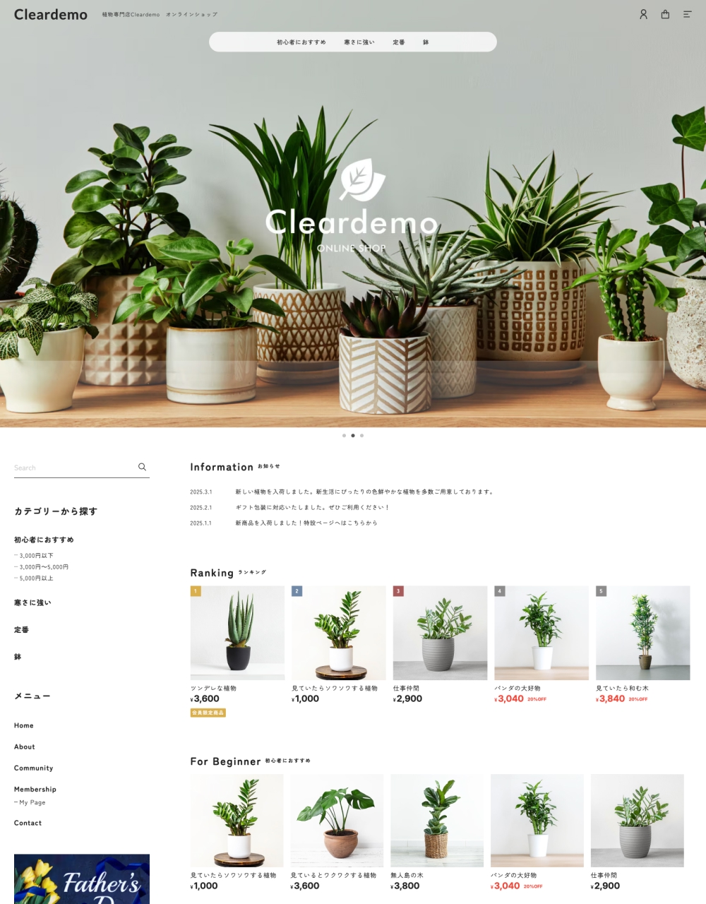 「Clear(クリアー)」は、購入へつながる導線設計にこだわった、販売重視型のデザインテーマです。 サイト全体が“思わず買いたくなる体験”を生み出せるよう、細部にまで販促の工夫を凝らしています。 レスポンシブにも対応しており、スマートフォンはもちろん、タブレット・PCまで、デバイス問わず美しいデザインを実現しました。 ■ こんな方におすすめ ・ショップの世界観やデザイン性よりも、ユーザーの使いやすさを優先したい ・取り扱い商品数が多く、効率よく整理・表示したい ・購入サポートやショップガイドを充実させ、ショップの信頼感を高めたい ======================== ◇デザインサンプル Clearを使用したデモショップ https://cleardemo.base.shop/ その他のデザインサンプル ※以下のデモサイトは実際のショップと一部動作が異なります。動作は上記のデモショップにてご確認ください。 https://hayakawajpn.com/base/clear/sweets/ https://hayakawajpn.com/base/clear/randoseru/ ◇使い方 https://hayakawajpn.com/base/clear/ ======================== デザインテーマ「Clear」では、様々な追加機能を設けています。 ■各メニューの名称変更 「About」「Blog」など、各メニューの名称を変更できます。 ■メインビジュアル(スライダー) TOPページのメインビジュアルとして最大5件まで画像とリンクを登録できる、大型の画像スライダーを設定しています。 ■トピックス表示(Information) TOPページに、トピックを最大3件登録することが可能です。更新情報や、新商品のお知らせなど、自由に登録できます。 ■人気ランキング表示 商品をランキング形式で紹介できます。ランキング形式を採用することで、人気やおすすめ度が明確になるので、 「まずはこれを見ておけばOK」という目安ができ、意思決定が早くなります。 ■ピックアップ表示 特定のカテゴリや商品をTOPページに掲載できます。ピックアップ商品として注目アイテムをトップに掲載することで、ユーザーの目に留まりやすくなり、購入機会の創出につながります。 見出しは自由に変更でき、季節やキャンペーンに合わせた柔軟な訴求が可能です。 ■ABOUTページのカスタマイズ デザインテーマ「Clear」は、ABOUTページを柔軟にカスタマイズできます。 ヘッダー画像を設定できるだけでなく、店舗情報、Q&A(最大10件)の登録が可能です。 ■ショップガイドの登録 ABOUTページにはショップガイドを登録できます。 ショップガイドを充実させることで、ユーザーは安心してショップを利用でき、購入率や満足度の向上につながります。 ショップガイドへはナビゲーションや、フッターメニューから直接アクセスできるように設計しています。 ■商品詳細ページのカスタマイズ 商品詳細ページはカスタマイズ可能です。メインエリアの文字色や背景色、購入ボタンの色などを変更できます。 また、お客様への購入後のサポート内容は4つまで登録できます。サポート内容を明確に記載することで、初めての方でも安心して利用でき、商品選びの不安を軽減。信頼感を高め、納得のいく買い物を後押しします。 ■フッターメニューの追加 各ページの下部に表示されるフッターメニューに、独自メニュー(1件)を追加表示することができます。「ショップガイド」や「よくあるご質問」の追加等、ユーザビリティの改善にお役立てください。 上記以外にも様々な機能をご用意しております。カスタマイズ可能な箇所の詳細は、下記をご確認ください。 https://hayakawajpn.com/base/clear/ 〈対応App〉 メールマガジン / お知らせバナー / 再入荷自動通知 / コミュニティ / 商品オプション / テイクアウト / 抽選販売 / 商品説明カスタム / 予約販売 / 販売期間設定 / セール / レビュー / カテゴリ管理 / Blog / 英語・外貨対応 / デジタルコンテンツ販売 / ラベル / BASEロゴ非表示 / 商品検索 / 送料詳細設定 / 数量制限 / 定期便 / メッセージ / メンバーシップ / 年齢制限 /かんたん海外販売 / 定期便 ■ 機能追加及び修正のお知らせ [2026.1] ・ランキングを非表示にするとピックアップが表示されなくなる不具合の修正を行いました。 ・その他軽微な修正を行いました。 [2025.11] ・かんたん海外販売App、定期便Appへの対応いたしました。 ・表示上の軽微な修正を行いました。