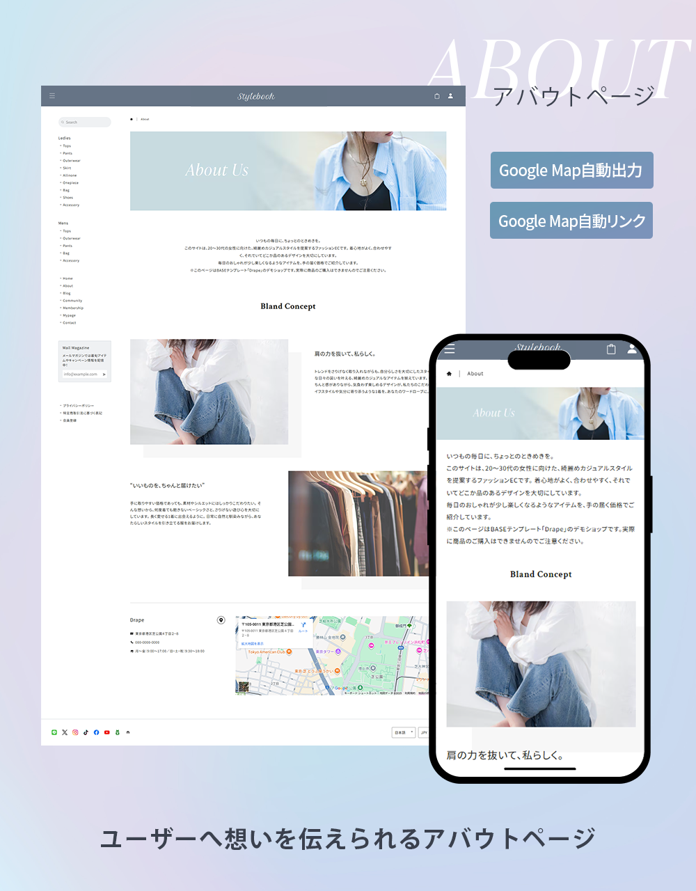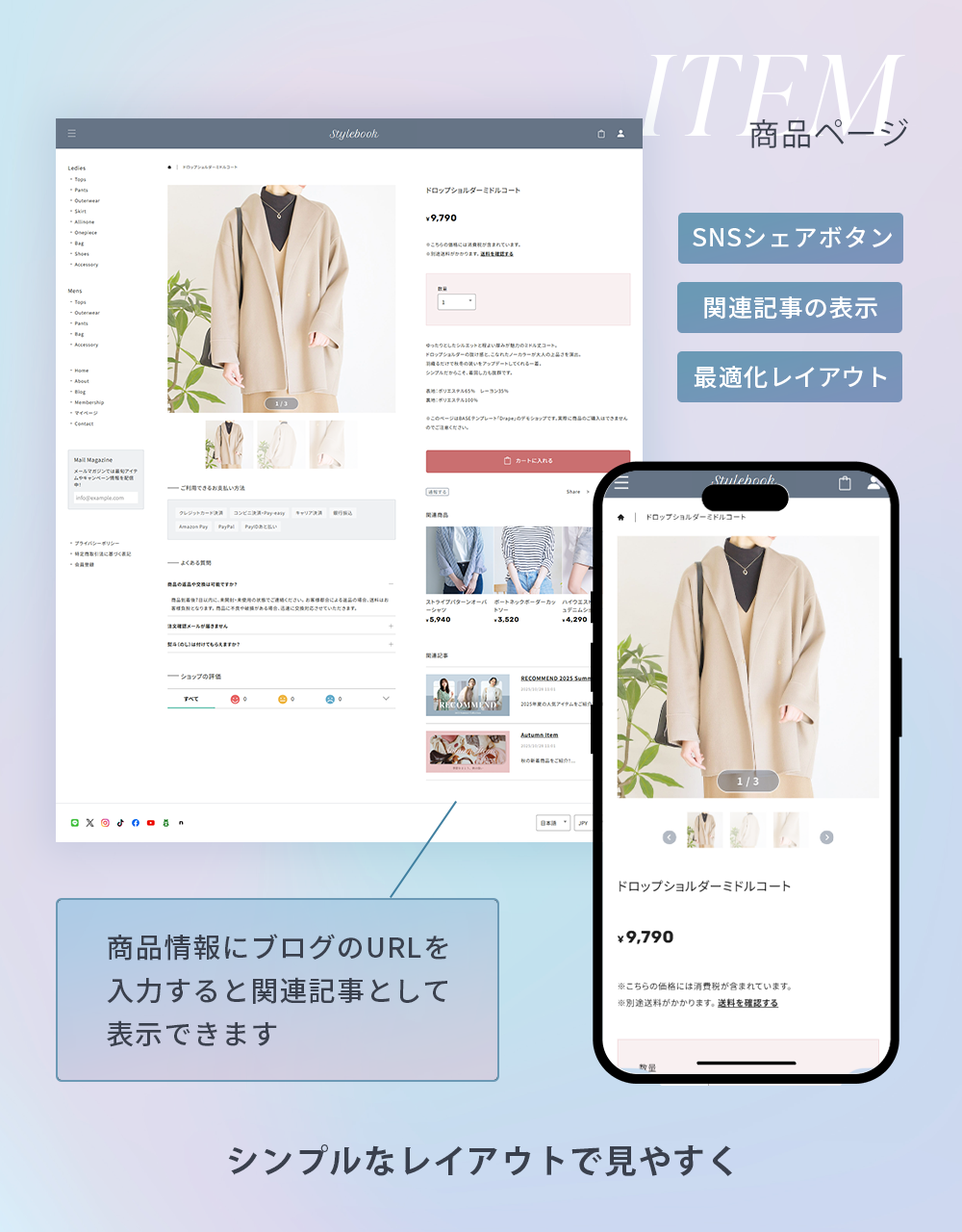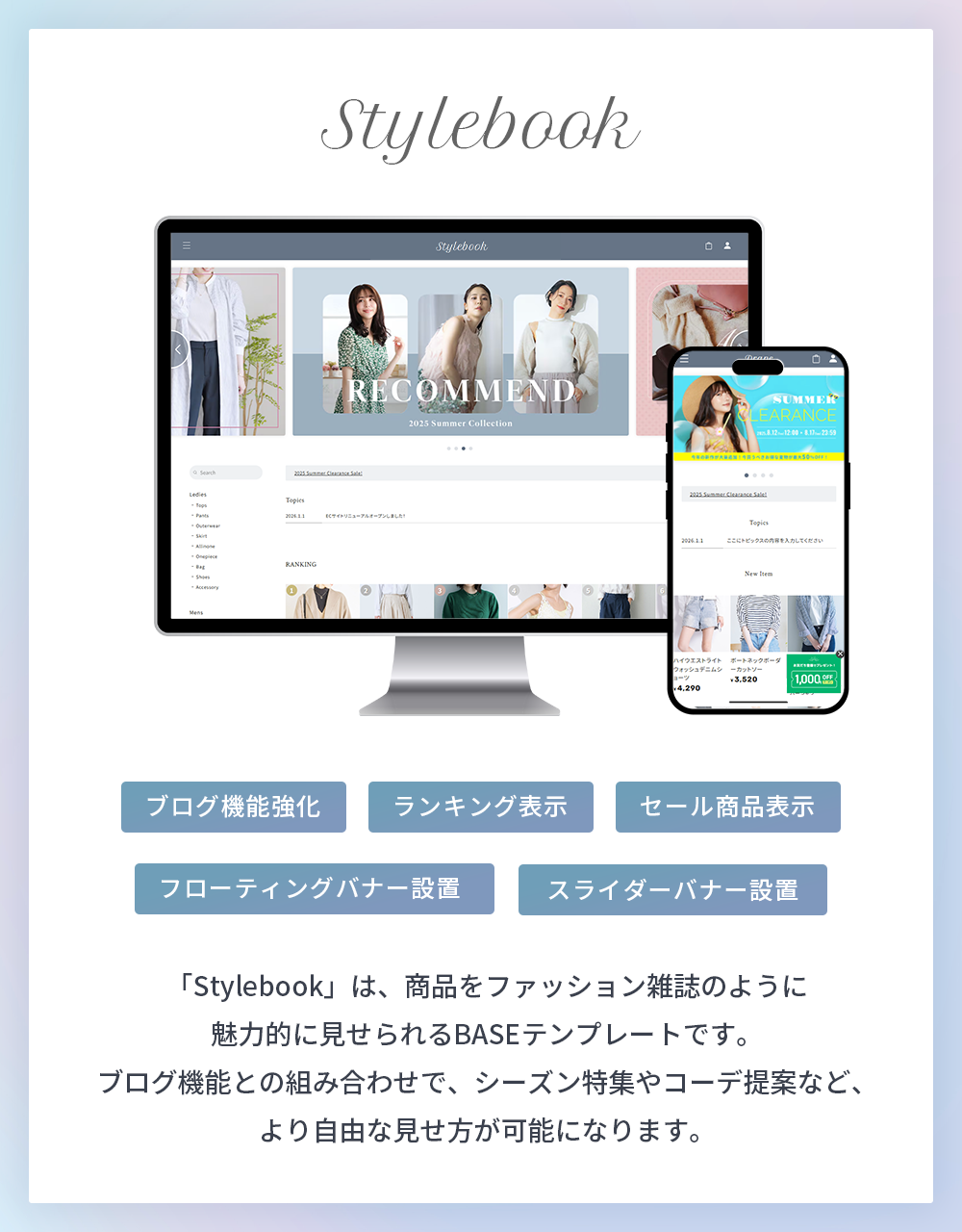「Stylebook(スタイルブック)」は、ファッション雑誌やカタログのようなレイアウトで、商品を視覚的に美しく魅せることができるBASEデザインテーマです。 ブログ機能と連携することで、商品ページに関連する記事を表示したり、特集ページのような構成にすることも可能。ファッション系ブランドにぴったりのテンプレートです。 また、レスポンシブにも対応しており、スマートフォンはもちろん、タブレット・PCまで、デバイス問わず美しいデザインを実現しました。 ■ こんな方におすすめ ・特集ページのようなコンテンツを作り、商品ページと繋げたい ・シンプルなレイアウトで多くの商品を掲載したい ・商品ページにショップガイドや注意事項を掲載し、ユーザーの不安を解消したい ======================== ■Stylebookを使用したデモショップ https://stylebook.base.ec/ ■使い方 https://note.com/ermine_hayakawa/n/neaa60c72465a ======================== ■Stylebookのカスタマイズ機能 デザインテーマ「Stylebookでは、様々なカスタマイズ機能を設けています。 ◇◇◇ Pickup!①「商品ページにブログ記事を「関連記事」として表示」◇◇◇ Stylebookでは、商品ページにブログ記事のリンクを「関連記事」として表示することができます。 特集ページやコーディネート提案記事などと商品を結びつけることで、ユーザーに対してより深く商品の魅力を伝えることが可能になります。 ◇◇◇ Pickup!②「HOMEに商品ランキングを掲載」◇◇◇ HOMEに商品人気ランキングを最大10件まで掲載することができます ◇◇◇Stylebookのカスタマイズ機能の紹介◇◇◇ 〇ショップ全体のデザインカスタマイズ機能 ・文字色の変更 ・注意色の変更(エラーや注意書きの文字色) ・ヘッダー背景色/文字色の変更 ・ボタン背景色/ボタン文字色の変更 ・ドロワーメニュー背景色/ドロワーメニュー文字色の変更 ・本文フォントの変更(ゴシック・明朝) ・ロゴフォントの変更(6種類) ・見出しフォントの変更(6種類) ・数字フォントの変更(3種類) ・メニュー名称の変更 ・アイテム一覧の表示絡む数の変更 ・アイテム一覧の画像サイズ比率の変更(5種類) ・メールマガジン案内文の変更 ・サイドメニューバナーの登録 〇TOPページのカスタマイズ機能 ・スライダー画像の登録(最大10件) ・人気ランキングの追加(最大10件) ・トピックス表示(最大3件) ・アイテム一覧見出しの変更 〇ABOUTページのカスタマイズ機能 ・ヘッダー画像の登録 ・コンセプトチャプターの追加(最大3件) ・店舗情報の追加 〇商品ページのカスタマイズ機能 ・お支払い方法の表示追加 ・よくある質問の追加(最大10件) ・フリーの入力欄の追加(最大2件) 〇その他のカスタマイズ機能 ・フローティングバナーの追加 ・セールAppと連携したアイテム表示 ■ 対応App メールマガジン / お知らせバナー / 再入荷自動通知 /コミュニティ /メンバーシップ / 商品オプション / テイクアウト / 抽選販売 / 商品説明カスタム / 予約販売 / 販売期間設定 / セール / レビュー / カテゴリ管理 / Blog / 英語・外貨対応 / デジタルコンテンツ販売 / ラベル / BASEロゴ非表示 / 商品検索 / 送料詳細設定 / 年齢制限 / 定期便 / メッセージ / かんたん海外販売