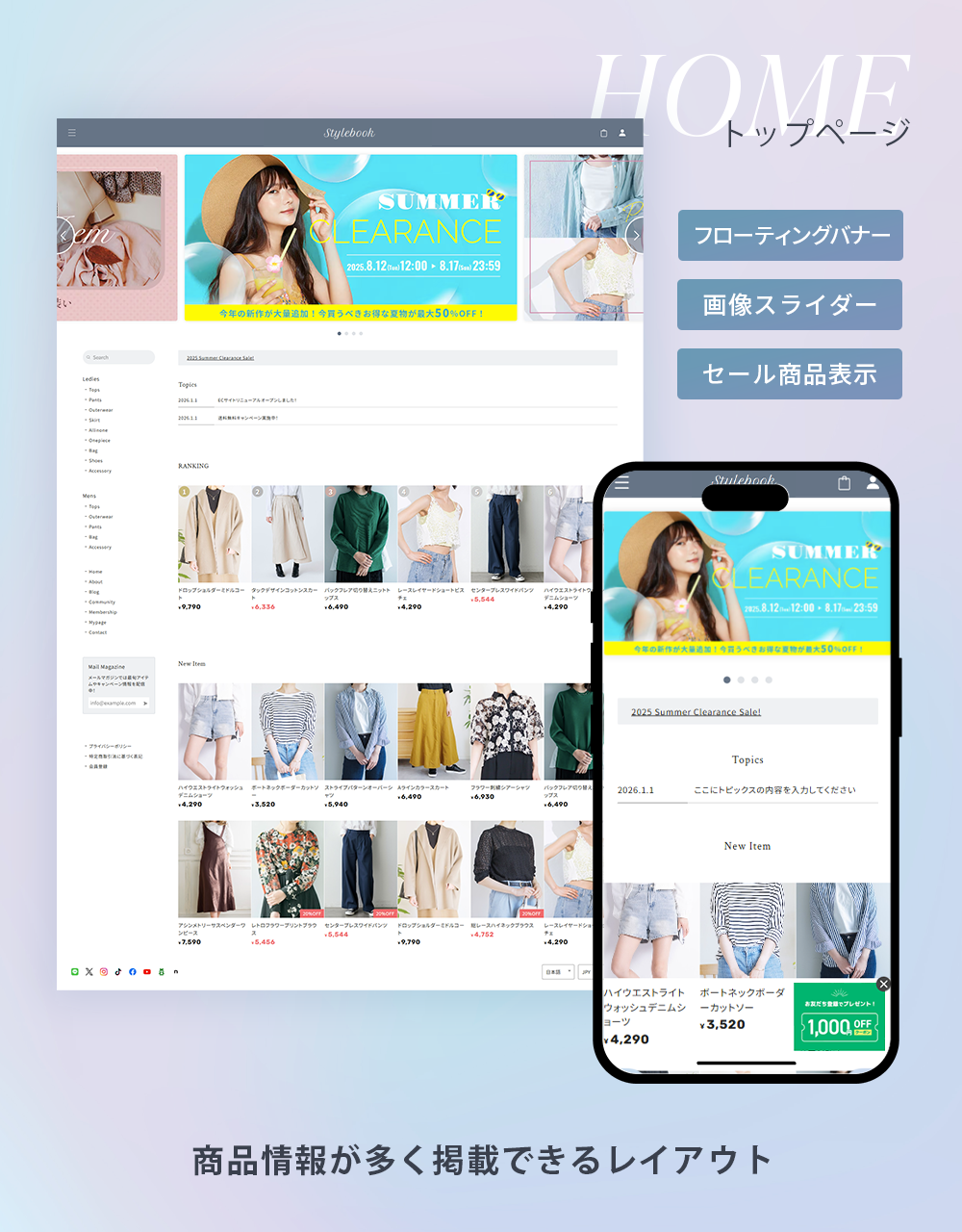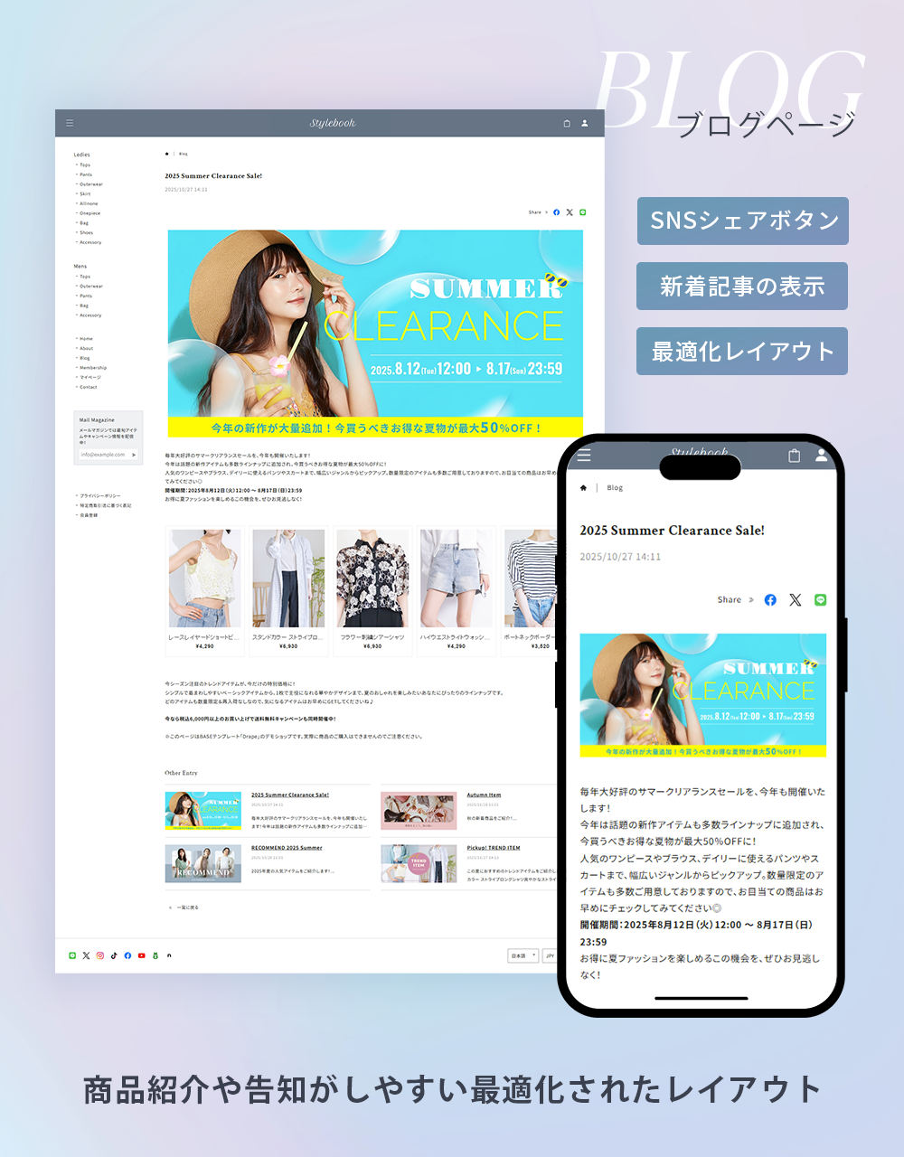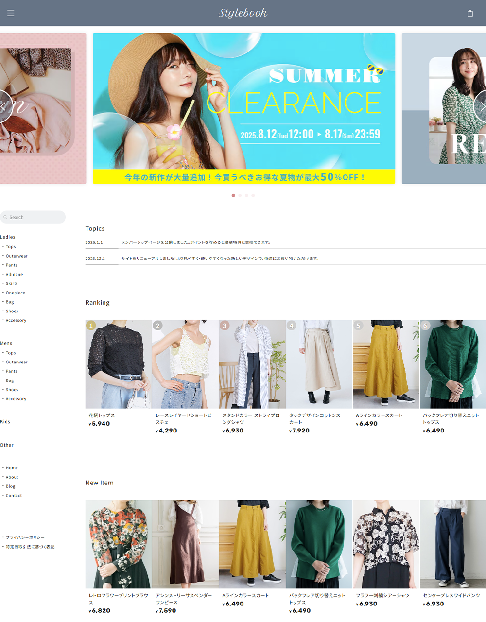 「Stylebook(スタイルブック)」は、ファッション雑誌やカタログのようなレイアウトで、商品を視覚的に美しく魅せることができるBASEデザインテーマです。 ブログ機能と連携することで、商品ページに関連する記事を表示したり、特集ページのような構成にすることも可能。ファッション系ブランドにぴったりのテンプレートです。 また、レスポンシブにも対応しており、スマートフォンはもちろん、タブレット・PCまで、デバイス問わず美しいデザインを実現しました。 ■ こんな方におすすめ ・特集ページのようなコンテンツを作り、商品ページと繋げたい ・シンプルなレイアウトで多くの商品を掲載したい ・商品ページにショップガイドや注意事項を掲載し、ユーザーの不安を解消したい ======================== ■Stylebookを使用したデモショップ https://stylebook.base.ec/ ■使い方 https://note.com/ermine_hayakawa/n/neaa60c72465a ======================== ■Stylebookのカスタマイズ機能 デザインテーマ「Stylebookでは、様々なカスタマイズ機能を設けています。 ◇◇◇ Pickup!①「商品ページにブログ記事を「関連記事」として表示」◇◇◇ Stylebookでは、商品ページにブログ記事のリンクを「関連記事」として表示することができます。 特集ページやコーディネート提案記事などと商品を結びつけることで、ユーザーに対してより深く商品の魅力を伝えることが可能になります。 ◇◇◇ Pickup!②「HOMEに商品ランキングを掲載」◇◇◇ HOMEに商品人気ランキングを最大10件まで掲載することができます ◇◇◇Stylebookのカスタマイズ機能の紹介◇◇◇ 〇ショップ全体のデザインカスタマイズ機能 ・文字色の変更 ・注意色の変更(エラーや注意書きの文字色) ・ヘッダー背景色/文字色の変更 ・ボタン背景色/ボタン文字色の変更 ・ドロワーメニュー背景色/ドロワーメニュー文字色の変更 ・本文フォントの変更(ゴシック・明朝) ・ロゴフォントの変更(6種類) ・見出しフォントの変更(6種類) ・数字フォントの変更(3種類) ・メニュー名称の変更 ・アイテム一覧の表示絡む数の変更 ・アイテム一覧の画像サイズ比率の変更(5種類) ・メールマガジン案内文の変更 ・サイドメニューバナーの登録 〇TOPページのカスタマイズ機能 ・スライダー画像の登録(最大10件) ・人気ランキングの追加(最大10件) ・トピックス表示(最大3件) ・アイテム一覧見出しの変更 〇ABOUTページのカスタマイズ機能 ・ヘッダー画像の登録 ・コンセプトチャプターの追加(最大3件) ・店舗情報の追加 〇商品ページのカスタマイズ機能 ・お支払い方法の表示追加 ・よくある質問の追加(最大10件) ・フリーの入力欄の追加(最大2件) 〇その他のカスタマイズ機能 ・フローティングバナーの追加 ・セールAppと連携したアイテム表示 ■ 対応App メールマガジン / お知らせバナー / 再入荷自動通知 /コミュニティ /メンバーシップ / 商品オプション / テイクアウト / 抽選販売 / 商品説明カスタム / 予約販売 / 販売期間設定 / セール / レビュー / カテゴリ管理 / Blog / 英語・外貨対応 / デジタルコンテンツ販売 / ラベル / BASEロゴ非表示 / 商品検索 / 送料詳細設定 / 年齢制限 / 定期便 / メッセージ / かんたん海外販売