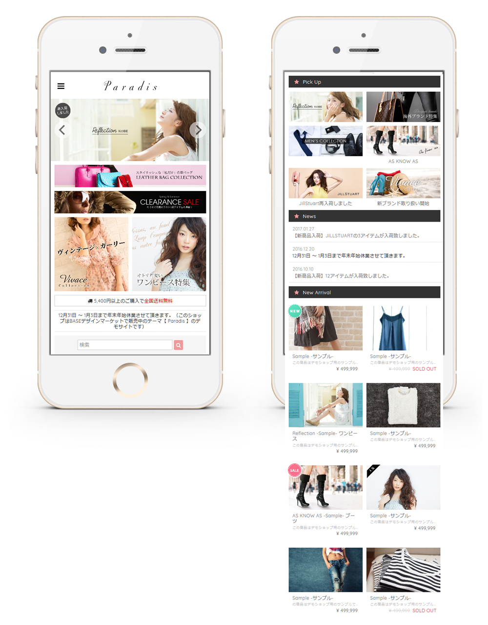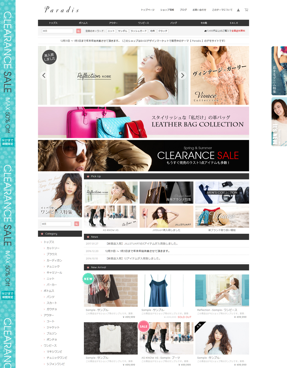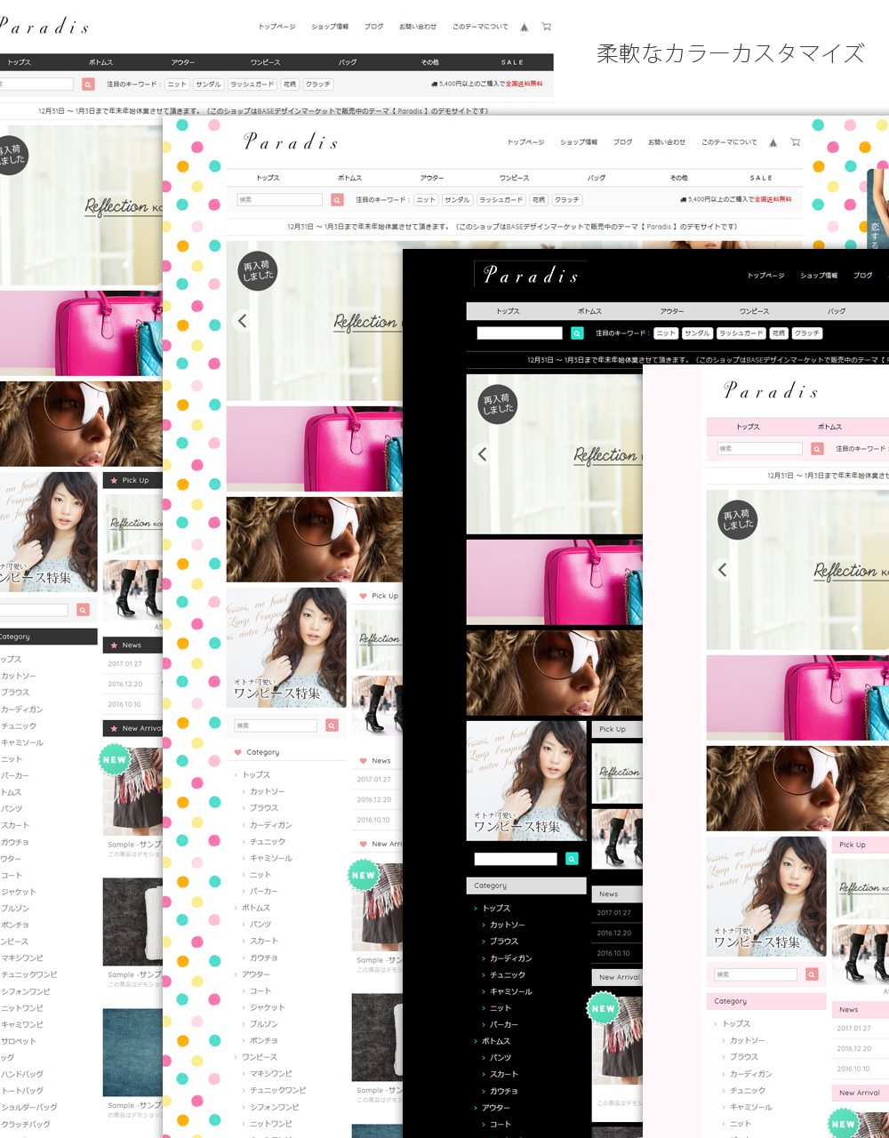 最新のデザインに柔軟なカスタマイズオプションを搭載。 『本当に売れているオンラインショップ』の機能をぎゅっと詰め込みました。 多彩な商品を扱うショップに最適なプレミアムデザインテーマ。 ---------------------------------------------------------------------------- 【 Paradisの特長や機能を知りたい 】 → 特設サイト: https://base.dolcevivace.com/paradis/ 【 Paradisのデザインを体感したい 】 → デモショップ: https://dolcevivace.base.ec/ ---------------------------------------------------------------------------- 各種のバナーで多数の商品を効果的にアピールすることが可能です。 ピックアップ / 新着情報 / ホットワード等の便利な機能も充実しています。 イメージスライダーや商品ページの画像はドラッグ操作/スワイプ操作対応で、お客様にストレスのない快適なショッピングを楽しんで頂けます。 スマートフォンにも最適化したレスポンシブデザインなので、 ビジュアルだけでなくショップとしての機能性も向上します。 全てのオリジナルカスタマイズ機能はON/OFFが切替可能です。 不要な機能をOFFにすることでオリジナルのカスタマイズが可能です。 ◯ 基本設定 商品アイテムのデザインや各機能の表示ON/OFFを設定することができます。 スライダー / バナー / 重要なお知らせ / ピックアップは「トップページのみに表示」と「カテゴリページや商品ページにも表示」が選択できます。 ◯ イメージスライダー ドラッグ操作/スワイプ操作対応の機能的なレスポンシブスライダーです。 画像は4枚まで設定可能で、商品ページ / カテゴリページ / 検索結果 / 外部サイトなど自由なリンク先を設定することができます。 ◯ イメージバナー 画像によるリンクバナーを4つまで設定することができます。 各バナーには自由なリンク先を設定することができ、リンクを設定せずに告知エリアとしても利用することも可能です。 ◯ タブバナー タブバナーは画面をスクロールしても常にサイト右部分に固定表示され、マウスを乗せるとスライドして展開表示されるリンクバナーです。 タブバナーは2つまで設定可能で、表示位置やスライド幅も個別に設定することができます。 (PC閲覧時に全てのページで表示されます。) ◯ スカイスクレイパーイメージ スカイスクレイパーイメージはサイト左部分の縦幅いっぱいに表示されます。画像が自動的に縦方向に繰り返して表示されるため、画面をスクロールしても常に見える位置に配置されます。画像をスクロールさせずに固定表示させることも可能です。 (PC閲覧時に全てのページで表示されます。) ◯ ホットワード 検索ボックスの横に「検索結果ページへのリンク付きのキーワード」を9つまで表示することができます。 人気ブランドやおすすめカテゴリ等を効果的にアピールすることができ、お客様の潜在的なニーズを引き出すことが可能です。 ◯ 送料表示 2箇所の表示位置から選択して送料を表示することができます。 テキスト内容やカラーを自由に設定することが可能です。 ◯ 重要なお知らせ表示 重要なお知らせのテキストを表示することができます。 テキスト、カラーを自由に設定することが可能です。 ◯ ニュース / 新着情報表示 新着情報を3件まで表示することができます。 日付orタイトル、内容、リンクを設定することができます。 タイトルに「人気No.1」などのテキストを入れることでランキングとして利用することも可能です。 ◯ ピックアップ表示 ピックアップ情報を6件まで表示することができます。 画像、テキスト、リンクを自由に設定することができ、リンクを設定せずに告知エリアとしても利用することも可能です。 〇 モーダルポップアップ ショップを開いた際に、キャンペーン/セール/イベント等の告知に便利なポップアップ画像を表示する事ができます。 モーダルポップアップは「毎回表示」と「6時間後に再度表示」が選択可能です。 ◯ 外部リンク設定 ショップ公式サイトなどの外部サイトへのリンクを2つまで表示可能です。テキスト、リンクを設定することができます。 ◯ ロゴ設定 ロゴをテキスト表示する場合のフォント、サイズ、カラーを設定できます。 ◯ ナビゲーションテキスト / タイトル設定 「Home」「About」「Blog」「Contact」などのナビゲーションテキストや、「Category」「Information」などのタイトルを変更することが可能です。 ◯ カラー設定 背景色、メインエリアの背景色、フッターの背景色、テキスト、リンク、カートに入れるボタン、カテゴリメニュー、アイコン、セール価格などのカラーを自由に変更することが可能です。 ◯ ワンポイントアイコン デザインのアクセントになるアイコンを表示できます。 好みに応じてハートや星などのアイコンタイプを選択可能です。 アイコンのカラーは自由に変更することができます。 ◯ カスタムショップ情報設定 ショップ情報をアバウトページやページ下部に表示することができます。 住所、TEL、FAX、営業時間、定休日、E-mailを設