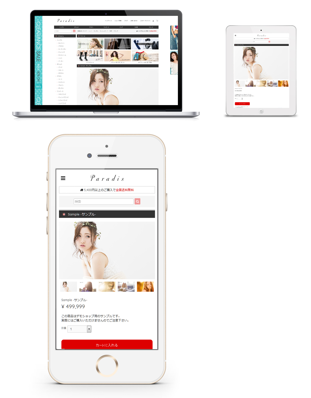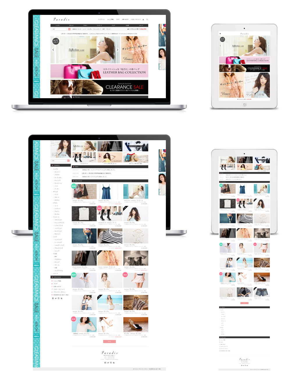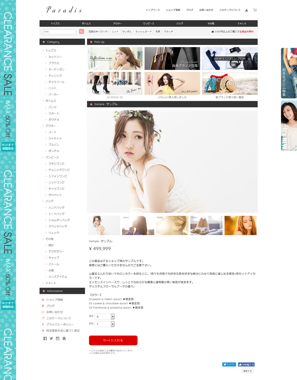 最新のデザインに柔軟なカスタマイズオプションを搭載。 『本当に売れているオンラインショップ』の機能をぎゅっと詰め込みました。 多彩な商品を扱うショップに最適なプレミアムデザインテーマ。 ---------------------------------------------------------------------------- 【 Paradisの特長や機能を知りたい 】 → 特設サイト: https://base.dolcevivace.com/paradis/ 【 Paradisのデザインを体感したい 】 → デモショップ: https://dolcevivace.base.ec/ ---------------------------------------------------------------------------- 各種のバナーで多数の商品を効果的にアピールすることが可能です。 ピックアップ / 新着情報 / ホットワード等の便利な機能も充実しています。 イメージスライダーや商品ページの画像はドラッグ操作/スワイプ操作対応で、お客様にストレスのない快適なショッピングを楽しんで頂けます。 スマートフォンにも最適化したレスポンシブデザインなので、 ビジュアルだけでなくショップとしての機能性も向上します。 全てのオリジナルカスタマイズ機能はON/OFFが切替可能です。 不要な機能をOFFにすることでオリジナルのカスタマイズが可能です。 ◯ 基本設定 商品アイテムのデザインや各機能の表示ON/OFFを設定することができます。 スライダー / バナー / 重要なお知らせ / ピックアップは「トップページのみに表示」と「カテゴリページや商品ページにも表示」が選択できます。 ◯ イメージスライダー ドラッグ操作/スワイプ操作対応の機能的なレスポンシブスライダーです。 画像は4枚まで設定可能で、商品ページ / カテゴリページ / 検索結果 / 外部サイトなど自由なリンク先を設定することができます。 ◯ イメージバナー 画像によるリンクバナーを4つまで設定することができます。 各バナーには自由なリンク先を設定することができ、リンクを設定せずに告知エリアとしても利用することも可能です。 ◯ タブバナー タブバナーは画面をスクロールしても常にサイト右部分に固定表示され、マウスを乗せるとスライドして展開表示されるリンクバナーです。 タブバナーは2つまで設定可能で、表示位置やスライド幅も個別に設定することができます。 (PC閲覧時に全てのページで表示されます。) ◯ スカイスクレイパーイメージ スカイスクレイパーイメージはサイト左部分の縦幅いっぱいに表示されます。画像が自動的に縦方向に繰り返して表示されるため、画面をスクロールしても常に見える位置に配置されます。画像をスクロールさせずに固定表示させることも可能です。 (PC閲覧時に全てのページで表示されます。) ◯ ホットワード 検索ボックスの横に「検索結果ページへのリンク付きのキーワード」を9つまで表示することができます。 人気ブランドやおすすめカテゴリ等を効果的にアピールすることができ、お客様の潜在的なニーズを引き出すことが可能です。 ◯ 送料表示 2箇所の表示位置から選択して送料を表示することができます。 テキスト内容やカラーを自由に設定することが可能です。 ◯ 重要なお知らせ表示 重要なお知らせのテキストを表示することができます。 テキスト、カラーを自由に設定することが可能です。 ◯ ニュース / 新着情報表示 新着情報を3件まで表示することができます。 日付orタイトル、内容、リンクを設定することができます。 タイトルに「人気No.1」などのテキストを入れることでランキングとして利用することも可能です。 ◯ ピックアップ表示 ピックアップ情報を6件まで表示することができます。 画像、テキスト、リンクを自由に設定することができ、リンクを設定せずに告知エリアとしても利用することも可能です。 〇 モーダルポップアップ ショップを開いた際に、キャンペーン/セール/イベント等の告知に便利なポップアップ画像を表示する事ができます。 モーダルポップアップは「毎回表示」と「6時間後に再度表示」が選択可能です。 ◯ 外部リンク設定 ショップ公式サイトなどの外部サイトへのリンクを2つまで表示可能です。テキスト、リンクを設定することができます。 ◯ ロゴ設定 ロゴをテキスト表示する場合のフォント、サイズ、カラーを設定できます。 ◯ ナビゲーションテキスト / タイトル設定 「Home」「About」「Blog」「Contact」などのナビゲーションテキストや、「Category」「Information」などのタイトルを変更することが可能です。 ◯ カラー設定 背景色、メインエリアの背景色、フッターの背景色、テキスト、リンク、カートに入れるボタン、カテゴリメニュー、アイコン、セール価格などのカラーを自由に変更することが可能です。 ◯ ワンポイントアイコン デザインのアクセントになるアイコンを表示できます。 好みに応じてハートや星などのアイコンタイプを選択可能です。 アイコンのカラーは自由に変更することができます。 ◯ カスタムショップ情報設定 ショップ情報をアバウトページやページ下部に表示することができます。 住所、TEL、FAX、営業時間、定休日、E-mailを設