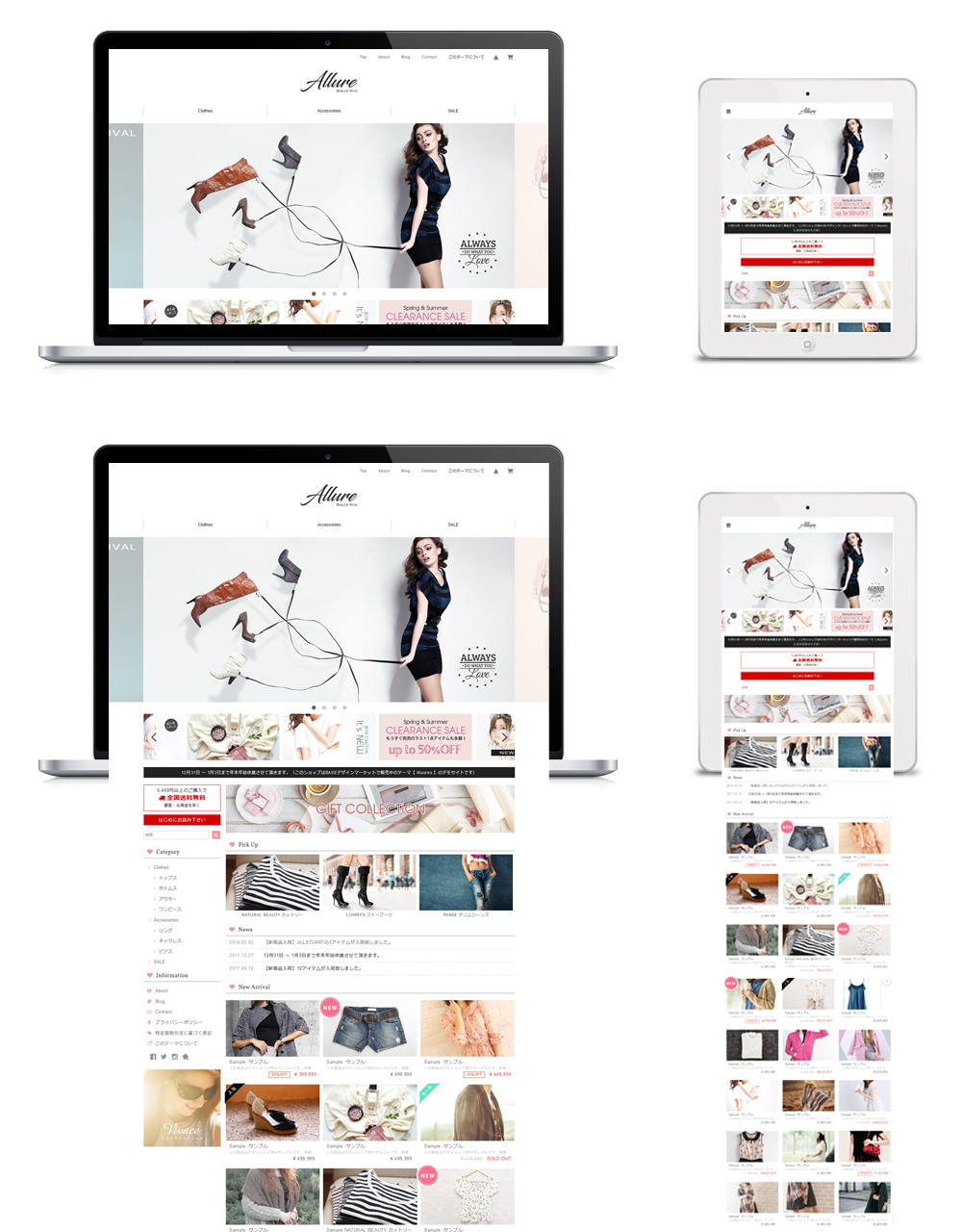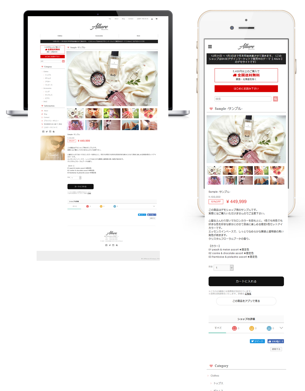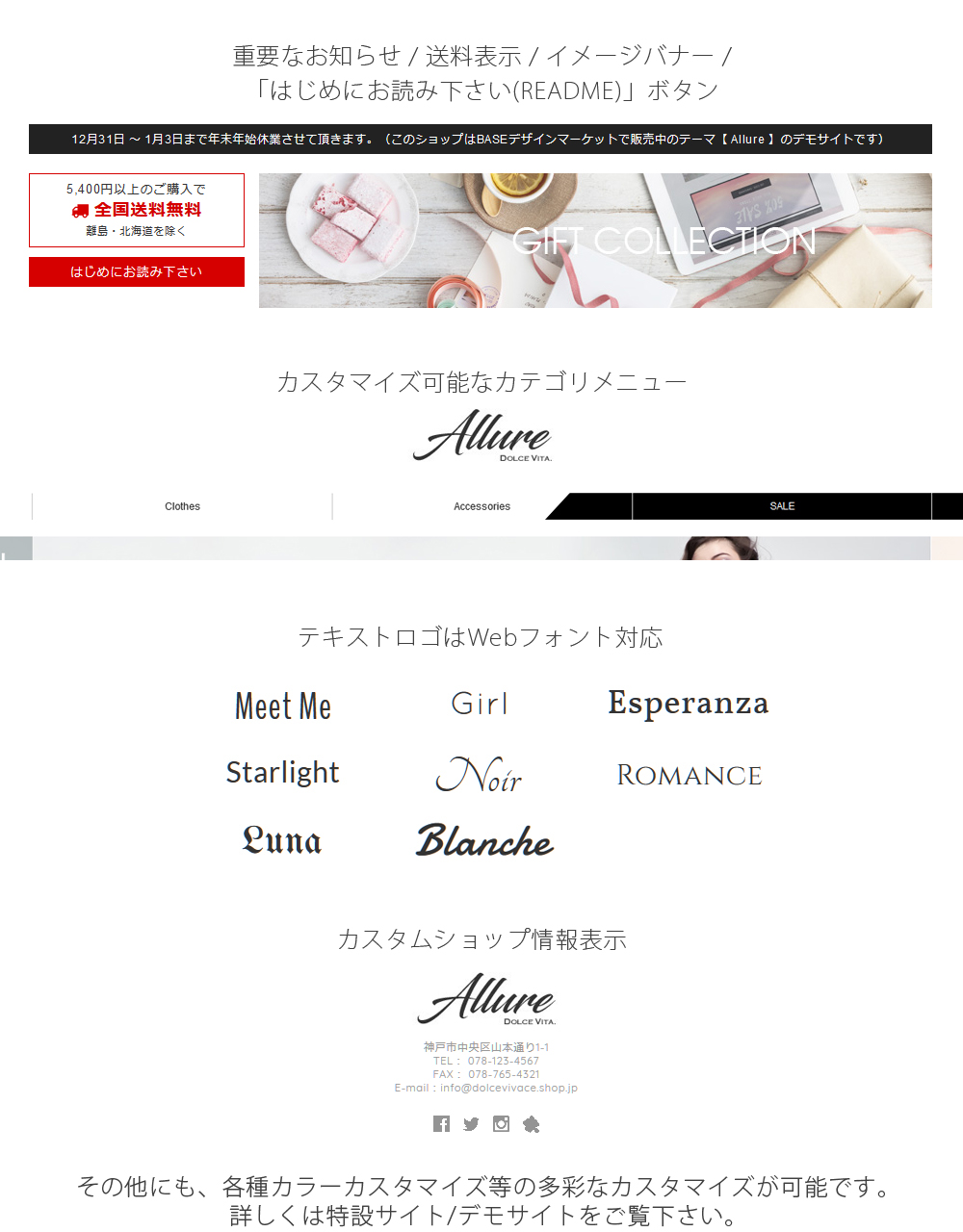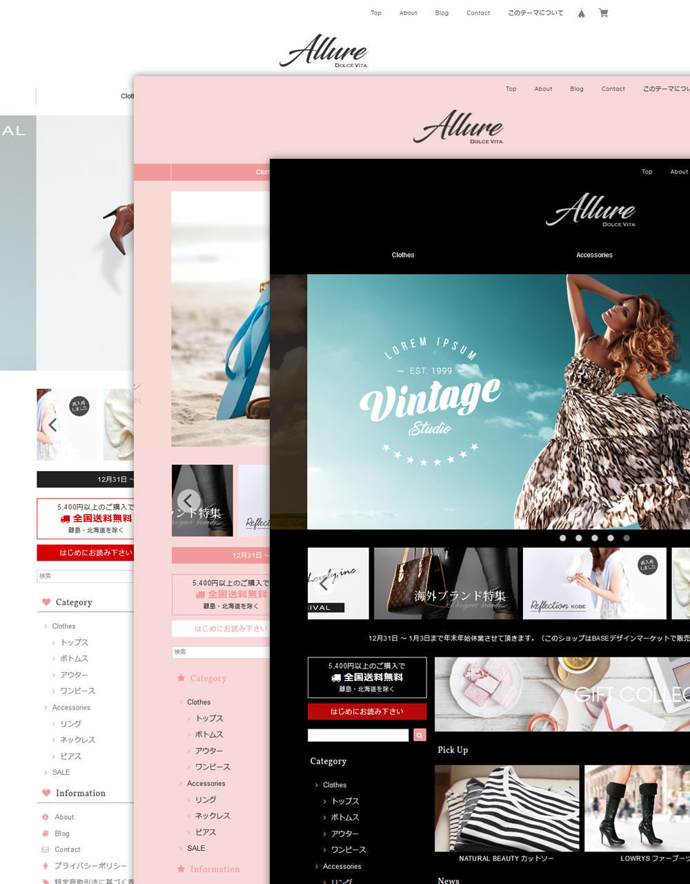 ※当テーマは、2025年10月31日(金)をもって販売を終了いたします。 ※購入済のテンプレートは、販売終了後も引き続きご使用いただけます。 ※今後、対応Appsの追加はございません。 =============================================================== ■ おすすめテーマ 『Girl』 機能性とデザイン性を兼ね備えたおしゃれなテーマ https://design.thebase.com/detail/133 ショップの売上をさらに向上させたいあなたへの、美しく洗練されたBASEテーマ https://base.dolcevivace.com/ =============================================================== 機能的なレイアウトと細部まで洗練されたデザイン。 理想のショップイメージを実現する豊富なカスタマイズ機能を備えたテーマです。 ---------------------------------------------------------------------------- 【 Allureの特長や機能を知りたい 】 → 特設サイト: https://base.dolcevivace.com/allure/ 【 Allureのデザインを体感したい 】 → デモショップ: https://dolcevivace.fashionstore.jp/ ---------------------------------------------------------------------------- 2つのイメージスライダー・READMEボタン・新着情報・送料表示・ピックアップ表示等の便利な機能が充実しています。 全てのカスタマイズ機能は必要に応じてON/OFFの切り替えが可能です。 スマートフォンにも最適化したレスポンシブデザインなので、 ビジュアルだけでなくショップとしての機能性も向上します。 ◯ 基本設定 商品アイテムのデザインや各機能の表示ON/OFFを設定することができます。READMEボタン / 重要なお知らせ / 送料表示は「トップページのみに表示」または「全てのページに表示」が選択可能です。 ◯ イメージスライダー(2つまで設置可能) ドラッグ操作/スワイプ操作対応の機能的なレスポンシブスライダーです。 画像は各スライダー6枚まで設定可能で、商品ページ / カテゴリページ / 検索結果ページ / 外部サイトなど自由なリンク先を設定することができます。 ◯ イメージバナー 画像によるリンクバナーを2つまで設定することができます。 各バナーには自由なリンク先を設定することができ、リンクを設定せずに告知エリアとしても利用することも可能です。 ◯ カテゴリメニュー サイト上部に商品カテゴリのメニューを表示できます。 背景色やテキストカラーは自由に設定することが可能です。 ◯ 「はじめにお読み下さい(README)」ボタン サイドバーに「はじめにお読み下さい」ボタンを設置することができます。テキスト内容、カラー、リンクを自由に設定することが可能です。 ブログApps等を利用したページにリンクさせることで、ショップを利用されるお客様に対してのご注意等を伝えることができます。 ◯ 送料表示 サイドバーに送料を表示することができます。 送料のテキスト内容やカラーを自由に設定することが可能です。 ◯ 重要なお知らせ表示 重要なお知らせのテキストを表示することができます。 お知らせのテキスト内容やカラーを自由に設定することが可能です。 ◯ ニュース / 新着情報表示 新着情報を3件まで表示することができます。 日付orタイトル、内容、リンクを設定することができます。 タイトルに「人気No.1」などのテキストを入れることでランキングとして利用することも可能です。 ◯ ピックアップ表示 ピックアップ情報を3件まで表示することができます。 画像、テキスト、リンクを自由に設定することができ、リンクを設定せずに告知エリアとしても利用することも可能です。 ◯ ワンポイントアイコン デザインのアクセントになるアイコンを表示できます。 好みに応じてハートや星などのアイコンタイプを選択可能です。 アイコンのカラーは自由に変更することができます。 ◯ 外部リンク設定 ショップ公式サイトなどの外部サイトへのリンクを2つまで表示可能です。テキスト、リンクを設定することができます。 ◯ ロゴ設定 ロゴをテキスト表示する場合のフォント、サイズ、カラーを設定できます。 ◯ ナビゲーションテキスト / タイトル設定 「Home」「About」「Blog」「Contact」などのナビゲーションテキストや、「Category」「Information」などのタイトルを変更することが可能です。 ◯ カラー設定 背景色、フッター、テキスト、リンク、カートに入れるボタン、見出し、アイコン、カテゴリメニューなどのカラーを自由に変更することが可能です。 ◯ カスタムショップ情報設定 ショップ情報をアバウトページやページ下部に表示することができます。 住所、TEL、FAX、営業時間、定休日、E-mailを設定できます。 必要なものだけを選択して設定することが可能です。 ◯ アバウトページカスタマイズ アバウトページにBASE管理画面で設定した「ショップの説明」に追加して、画像、キャッチコピー、カスタムショップ情報を表示することができます。 ◯ BASEアプリ連携 スマホサイトの商品ページに「この商品をアプリで見る」ボタンを表示することができます。 ◯ 独自スタイルシート(CSS)設定 知識のある上級者の方はCSSを追加記述することが可能です。 【 各種BASE Apps対