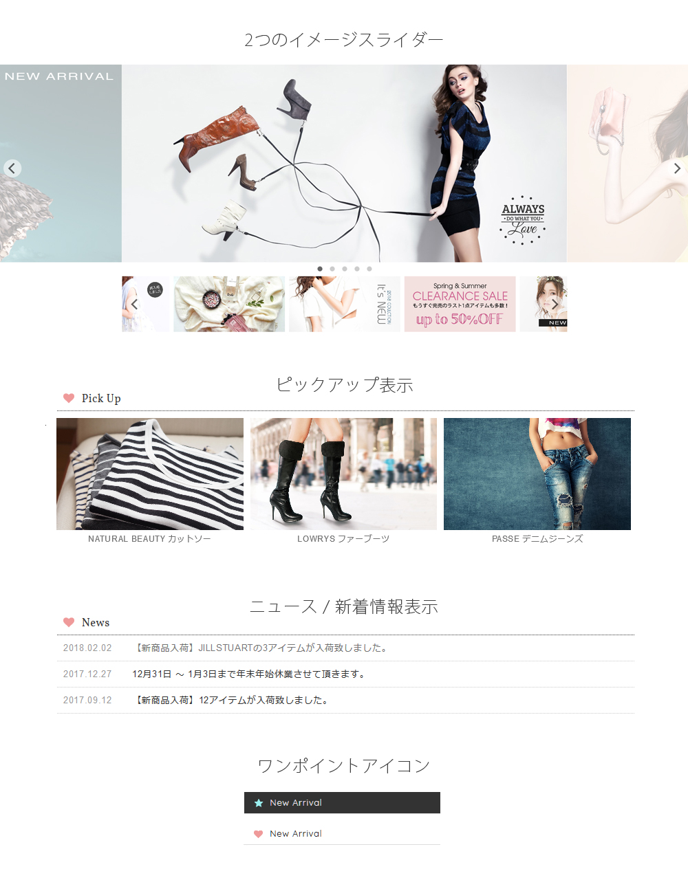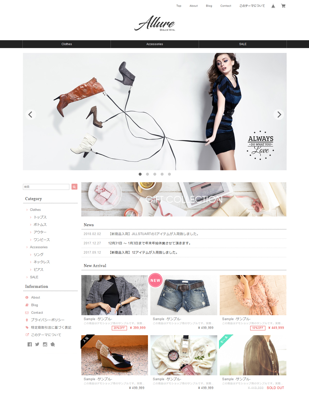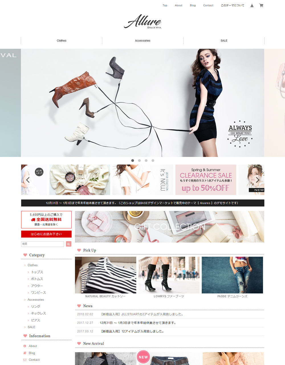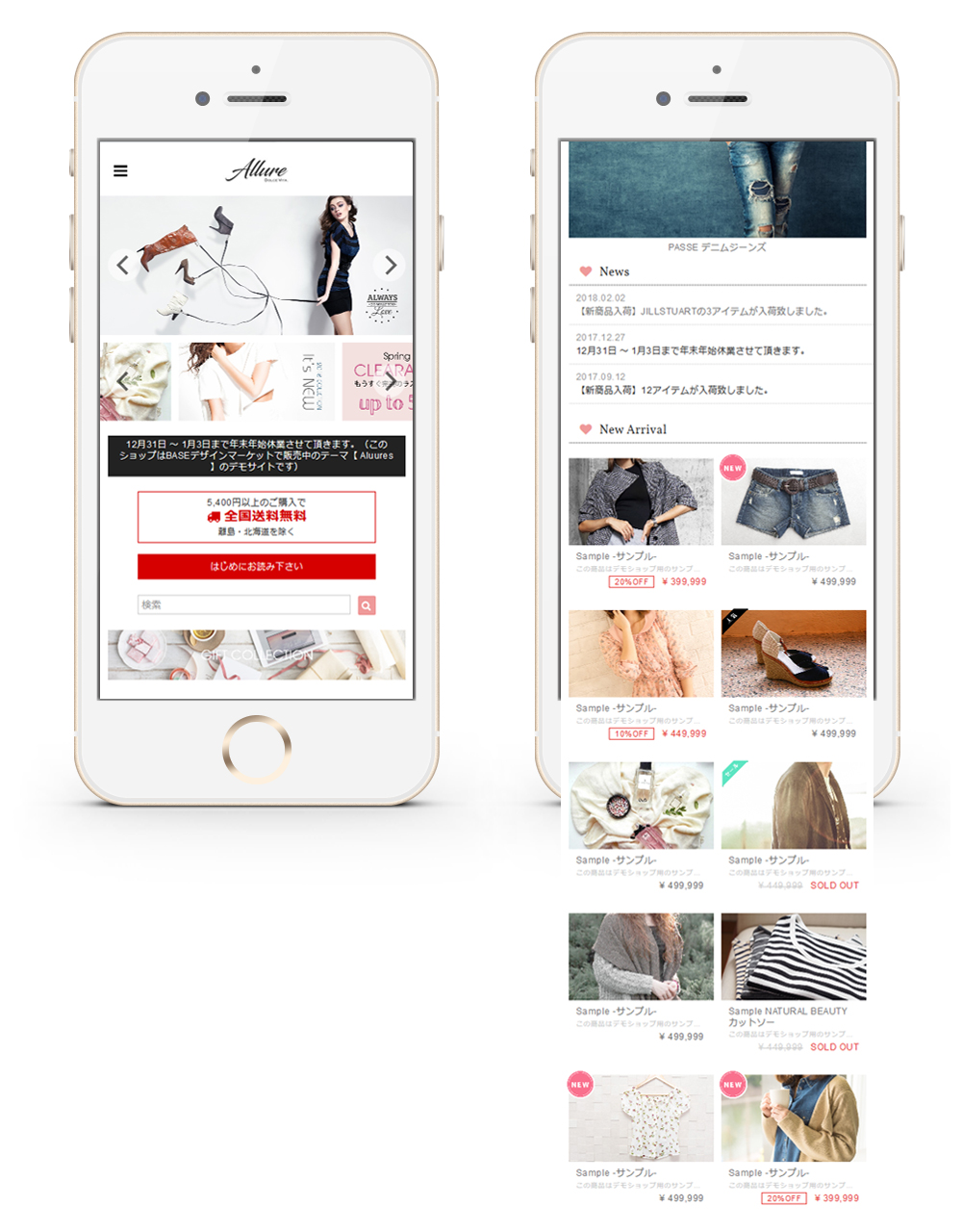 ※当テーマは、2025年10月31日(金)をもって販売を終了いたします。 ※購入済のテンプレートは、販売終了後も引き続きご使用いただけます。 ※今後、対応Appsの追加はございません。 =============================================================== ■ おすすめテーマ 『Girl』 機能性とデザイン性を兼ね備えたおしゃれなテーマ https://design.thebase.com/detail/133 ショップの売上をさらに向上させたいあなたへの、美しく洗練されたBASEテーマ https://base.dolcevivace.com/ =============================================================== 機能的なレイアウトと細部まで洗練されたデザイン。 理想のショップイメージを実現する豊富なカスタマイズ機能を備えたテーマです。 ---------------------------------------------------------------------------- 【 Allureの特長や機能を知りたい 】 → 特設サイト: https://base.dolcevivace.com/allure/ 【 Allureのデザインを体感したい 】 → デモショップ: https://dolcevivace.fashionstore.jp/ ---------------------------------------------------------------------------- 2つのイメージスライダー・READMEボタン・新着情報・送料表示・ピックアップ表示等の便利な機能が充実しています。 全てのカスタマイズ機能は必要に応じてON/OFFの切り替えが可能です。 スマートフォンにも最適化したレスポンシブデザインなので、 ビジュアルだけでなくショップとしての機能性も向上します。 ◯ 基本設定 商品アイテムのデザインや各機能の表示ON/OFFを設定することができます。READMEボタン / 重要なお知らせ / 送料表示は「トップページのみに表示」または「全てのページに表示」が選択可能です。 ◯ イメージスライダー(2つまで設置可能) ドラッグ操作/スワイプ操作対応の機能的なレスポンシブスライダーです。 画像は各スライダー6枚まで設定可能で、商品ページ / カテゴリページ / 検索結果ページ / 外部サイトなど自由なリンク先を設定することができます。 ◯ イメージバナー 画像によるリンクバナーを2つまで設定することができます。 各バナーには自由なリンク先を設定することができ、リンクを設定せずに告知エリアとしても利用することも可能です。 ◯ カテゴリメニュー サイト上部に商品カテゴリのメニューを表示できます。 背景色やテキストカラーは自由に設定することが可能です。 ◯ 「はじめにお読み下さい(README)」ボタン サイドバーに「はじめにお読み下さい」ボタンを設置することができます。テキスト内容、カラー、リンクを自由に設定することが可能です。 ブログApps等を利用したページにリンクさせることで、ショップを利用されるお客様に対してのご注意等を伝えることができます。 ◯ 送料表示 サイドバーに送料を表示することができます。 送料のテキスト内容やカラーを自由に設定することが可能です。 ◯ 重要なお知らせ表示 重要なお知らせのテキストを表示することができます。 お知らせのテキスト内容やカラーを自由に設定することが可能です。 ◯ ニュース / 新着情報表示 新着情報を3件まで表示することができます。 日付orタイトル、内容、リンクを設定することができます。 タイトルに「人気No.1」などのテキストを入れることでランキングとして利用することも可能です。 ◯ ピックアップ表示 ピックアップ情報を3件まで表示することができます。 画像、テキスト、リンクを自由に設定することができ、リンクを設定せずに告知エリアとしても利用することも可能です。 ◯ ワンポイントアイコン デザインのアクセントになるアイコンを表示できます。 好みに応じてハートや星などのアイコンタイプを選択可能です。 アイコンのカラーは自由に変更することができます。 ◯ 外部リンク設定 ショップ公式サイトなどの外部サイトへのリンクを2つまで表示可能です。テキスト、リンクを設定することができます。 ◯ ロゴ設定 ロゴをテキスト表示する場合のフォント、サイズ、カラーを設定できます。 ◯ ナビゲーションテキスト / タイトル設定 「Home」「About」「Blog」「Contact」などのナビゲーションテキストや、「Category」「Information」などのタイトルを変更することが可能です。 ◯ カラー設定 背景色、フッター、テキスト、リンク、カートに入れるボタン、見出し、アイコン、カテゴリメニューなどのカラーを自由に変更することが可能です。 ◯ カスタムショップ情報設定 ショップ情報をアバウトページやページ下部に表示することができます。 住所、TEL、FAX、営業時間、定休日、E-mailを設定できます。 必要なものだけを選択して設定することが可能です。 ◯ アバウトページカスタマイズ アバウトページにBASE管理画面で設定した「ショップの説明」に追加して、画像、キャッチコピー、カスタムショップ情報を表示することができます。 ◯ BASEアプリ連携 スマホサイトの商品ページに「この商品をアプリで見る」ボタンを表示することができます。 ◯ 独自スタイルシート(CSS)設定 知識のある上級者の方はCSSを追加記述することが可能です。 【 各種BASE Apps対