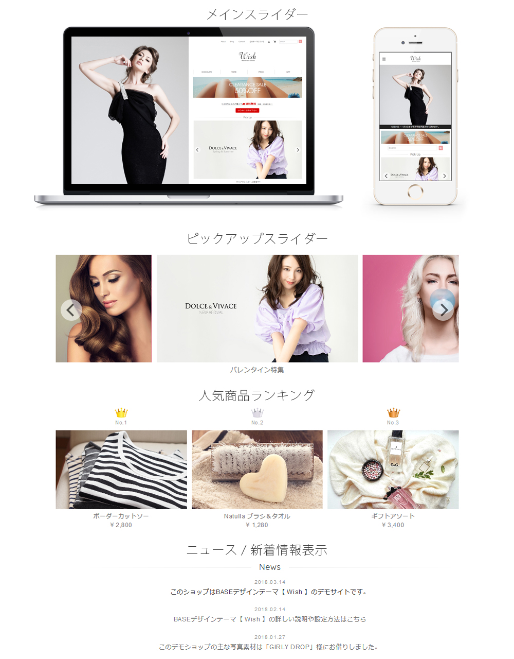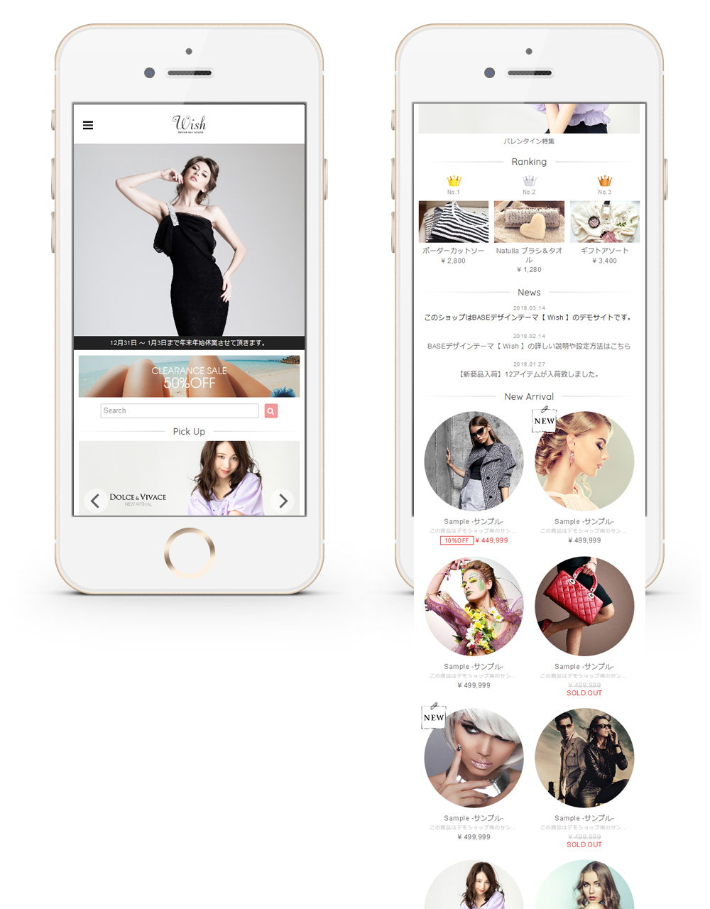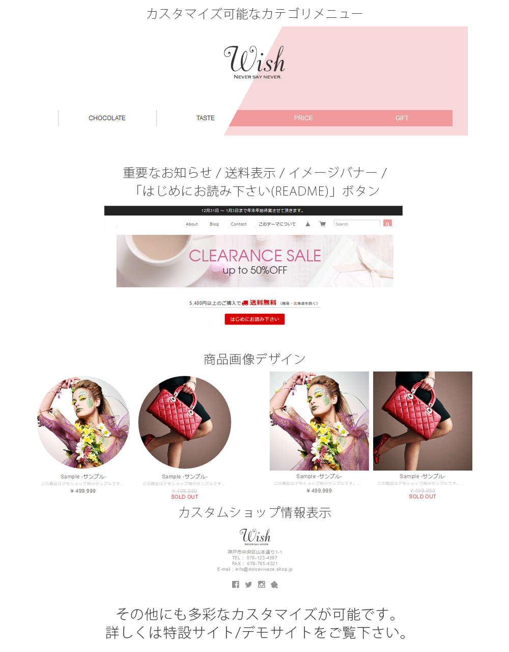 おしゃれで可愛くてスタイリッシュ。 簡単なのに多彩なカスタマイズ機能。 あなたのWish(希望)を叶える理想のデザインテーマです。 まずはデモショップで実際のテーマの雰囲気をご覧下さい。 特設サイトでは各機能の詳しい説明や設定方法をご案内します。 ---------------------------------------------------------------------------- 【 Wishのデザインを体感したい 】 → デモショップ: https://dolcevivace.base.shop/ 【 Wishの特長や機能を知りたい 】 → 特設サイト: https://base.dolcevivace.com/wish/ ---------------------------------------------------------------------------- PCサイトでは画面サイズの半分に広がる大胆なイメージスライダーがショップのイメージを鮮やかに印象付けます。 スマホサイトではレスポンシブスライダーとして美しく表示されます。 ピックアップスライダー・人気商品ランキング・新着情報・送料表示・README等の便利な機能が充実しています。 全てのオリジナルカスタマイズ機能はON/OFFが切替可能です。 不要な機能をOFFにすることでミニマルなデザインにする事も可能です。 スマートフォンにも最適化したレスポンシブデザインなので、 ビジュアルだけでなくショップとしての機能性も向上します。 ◯ 基本設定 商品アイテムのデザインや各機能の表示ON/OFFを設定することができます。各機能は「トップページのみに表示」または「全てのページに表示」が選択できます。 トップページの商品画像を丸く切り抜くデザインも可能です。 ◯ メインスライダー PCサイトでは画面サイズの半分を覆い、スマホサイトでは横幅いっぱいに広がるドラッグ操作/スワイプ操作対応の機能的なレスポンシブスライダーです。 画像は4枚まで設定可能で、自由なリンク先を設定することができます。 PCサイトで画像が自動的に切り抜かれる際の基点を選択することもできます。下層ページ専用の画像を別途1枚まで設定することも可能です。 ◯ カテゴリメニュー サイト上部に商品カテゴリのメニューを表示できます。 背景色やテキストカラーを自由に設定することが可能です。 ◯ ピックアップスライダー ピックアップ情報をスライダー形式で6件まで表示することができます。 画像、テキスト、リンクを自由に設定することができ、リンクを設定せずに告知エリアとしても利用することも可能です。 ◯ 人気商品ランキング ランキング形式で3件まで画像、商品名、価格、リンクを自由に設定することができます。 また、王冠アイコンの表示ON/OFFも切り替えることが可能です。 (データを自動取得して実際の販売数ランキングを表示するものではなく、手動で設定してランキング形式で商品を表示する機能となります。) ◯ 「はじめにお読み下さい(README)」ボタン 「はじめにお読み下さい」ボタンを設置することが可能です。 テキスト内容、カラー、リンクを自由に設定可能です。 ブログApps等を利用したページにリンクさせることで、ショップを利用されるお客様へのご注意等を伝えることができます。 ◯ 送料表示 サイト上部に送料を表示することができます。送料、条件、補足のテキスト内容やカラーを自由に設定することが可能です。 ◯ 重要なお知らせ表示 重要なお知らせのテキストを表示することができます。 お知らせのテキスト内容やカラーを自由に設定することが可能です。 ◯ ニュース / 新着情報表示 新着情報を3件まで表示することができます。 日付orタイトル、内容、リンクを設定することができます。 ◯ トップバナー サイト上部にバナーを表示することができます。 バナーには自由なリンク先を設定可能で、リンクを設定せずに告知エリアとして利用することもできます。 ◯ フッターバナー サイト下部にバナーを表示することができます。 バナーには自由なリンク先を設定可能で、リンクを設定せずに告知エリアとして利用することもできます。 〇 モーダルポップアップ ショップを開いた際に、キャンペーン/セール/イベント等の告知に便利なポップアップ画像を表示する事ができます。 モーダルポップアップは「毎回表示」と「6時間後に再度表示」が選択可能です。 ◯ 外部リンク設定 ショップ公式サイトなどの外部サイトへのリンクを2つまで表示可能です。テキスト、リンクを設定することができます。 ◯ ロゴ設定 ロゴをテキスト表示する場合のフォント、サイズ、カラーを設定できます。 PCサイト閲覧時の画像/テキストロゴの余白も設定することが可能です。 ◯ ナビゲーションテキスト / タイトル設定 「Home」「About」「Blog」「Contact」などのナビゲーションテキストや、「Category」「Information」などのタイトルを変更することが可能です。 ◯ カラー設定 背景色、フッター、テキスト、リンク、カートに入れるボタン、見出し、アイコン、カテゴリメニューなどのカラーを自由に変更することが可能です。 ◯ カスタムショップ情報設定 ショップ情報をアバウトページやページ下部に表示することができます。 住所、TEL、FAX、営業