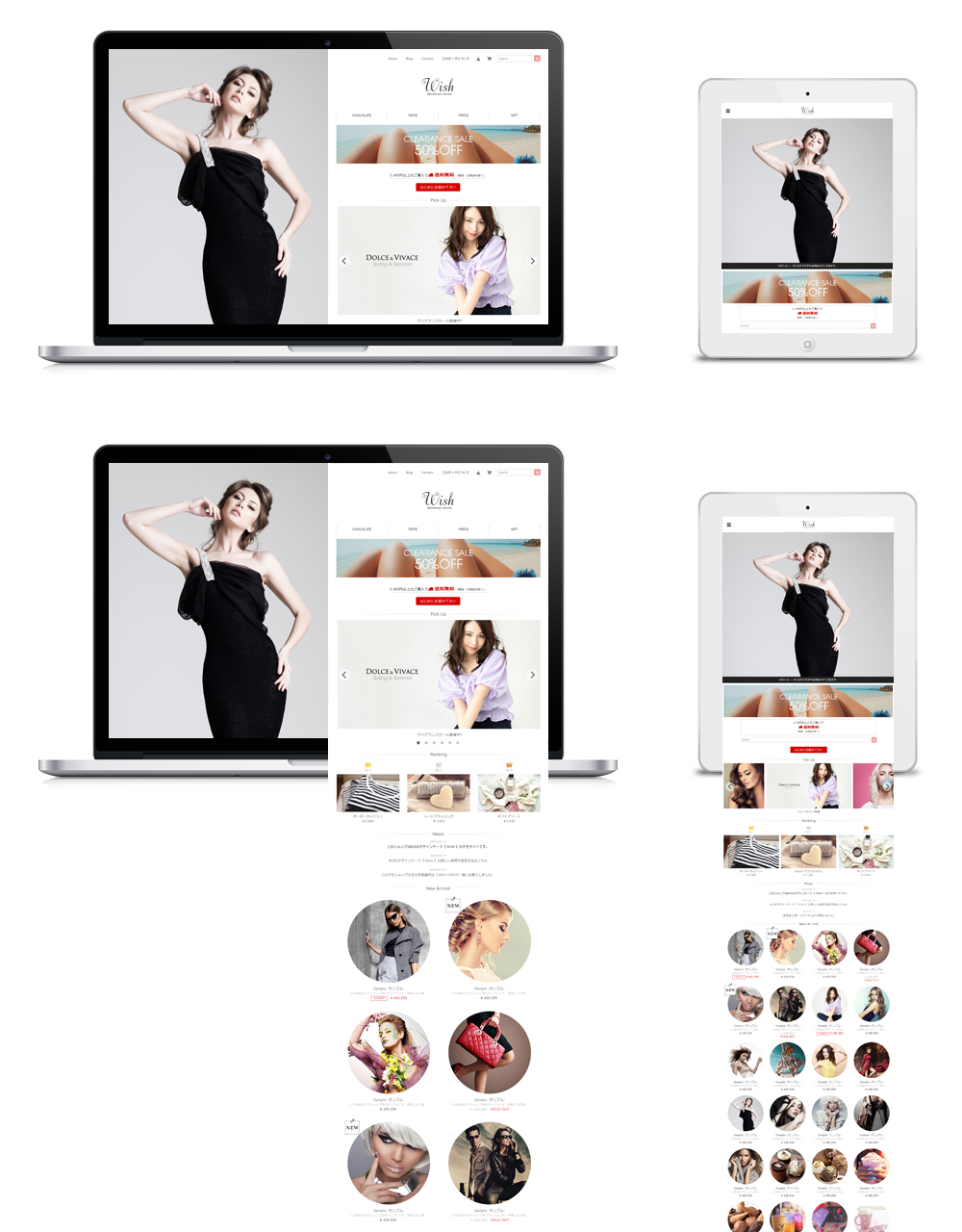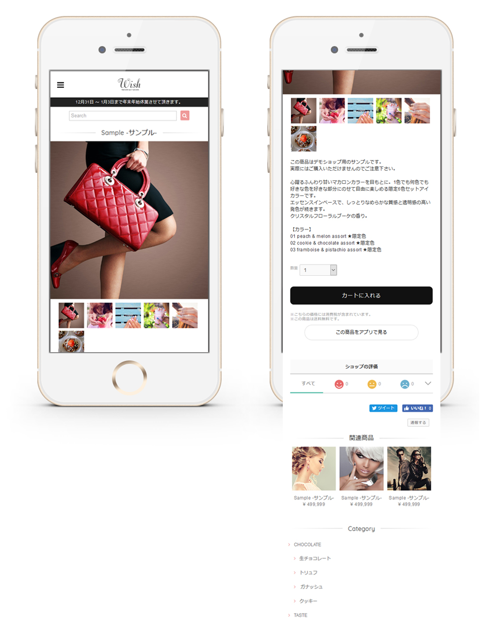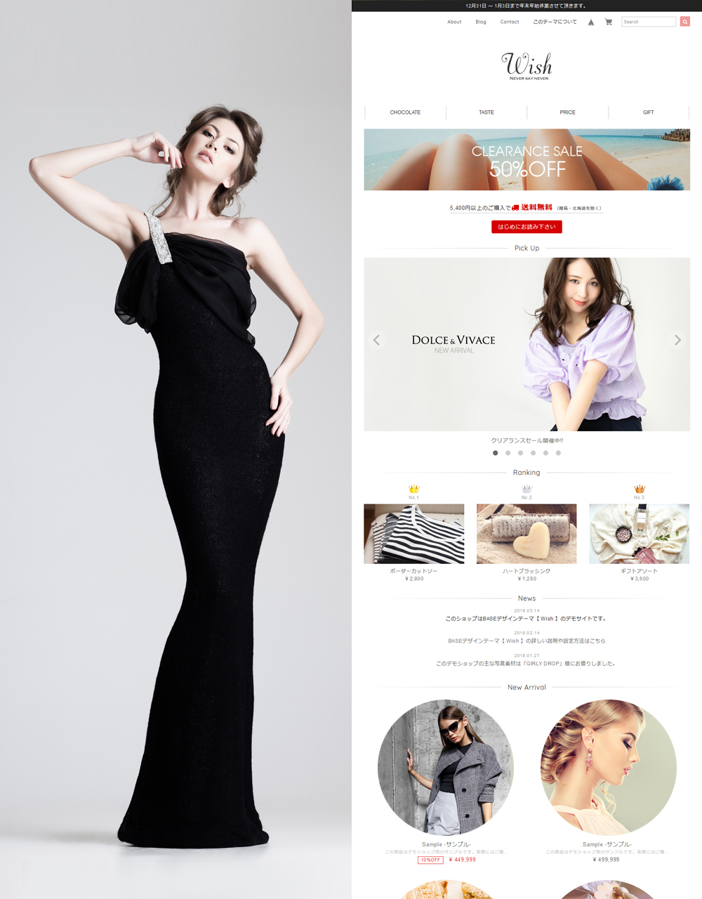 おしゃれで可愛くてスタイリッシュ。 簡単なのに多彩なカスタマイズ機能。 あなたのWish(希望)を叶える理想のデザインテーマです。 まずはデモショップで実際のテーマの雰囲気をご覧下さい。 特設サイトでは各機能の詳しい説明や設定方法をご案内します。 ---------------------------------------------------------------------------- 【 Wishのデザインを体感したい 】 → デモショップ: https://dolcevivace.base.shop/ 【 Wishの特長や機能を知りたい 】 → 特設サイト: https://base.dolcevivace.com/wish/ ---------------------------------------------------------------------------- PCサイトでは画面サイズの半分に広がる大胆なイメージスライダーがショップのイメージを鮮やかに印象付けます。 スマホサイトではレスポンシブスライダーとして美しく表示されます。 ピックアップスライダー・人気商品ランキング・新着情報・送料表示・README等の便利な機能が充実しています。 全てのオリジナルカスタマイズ機能はON/OFFが切替可能です。 不要な機能をOFFにすることでミニマルなデザインにする事も可能です。 スマートフォンにも最適化したレスポンシブデザインなので、 ビジュアルだけでなくショップとしての機能性も向上します。 ◯ 基本設定 商品アイテムのデザインや各機能の表示ON/OFFを設定することができます。各機能は「トップページのみに表示」または「全てのページに表示」が選択できます。 トップページの商品画像を丸く切り抜くデザインも可能です。 ◯ メインスライダー PCサイトでは画面サイズの半分を覆い、スマホサイトでは横幅いっぱいに広がるドラッグ操作/スワイプ操作対応の機能的なレスポンシブスライダーです。 画像は4枚まで設定可能で、自由なリンク先を設定することができます。 PCサイトで画像が自動的に切り抜かれる際の基点を選択することもできます。下層ページ専用の画像を別途1枚まで設定することも可能です。 ◯ カテゴリメニュー サイト上部に商品カテゴリのメニューを表示できます。 背景色やテキストカラーを自由に設定することが可能です。 ◯ ピックアップスライダー ピックアップ情報をスライダー形式で6件まで表示することができます。 画像、テキスト、リンクを自由に設定することができ、リンクを設定せずに告知エリアとしても利用することも可能です。 ◯ 人気商品ランキング ランキング形式で3件まで画像、商品名、価格、リンクを自由に設定することができます。 また、王冠アイコンの表示ON/OFFも切り替えることが可能です。 (データを自動取得して実際の販売数ランキングを表示するものではなく、手動で設定してランキング形式で商品を表示する機能となります。) ◯ 「はじめにお読み下さい(README)」ボタン 「はじめにお読み下さい」ボタンを設置することが可能です。 テキスト内容、カラー、リンクを自由に設定可能です。 ブログApps等を利用したページにリンクさせることで、ショップを利用されるお客様へのご注意等を伝えることができます。 ◯ 送料表示 サイト上部に送料を表示することができます。送料、条件、補足のテキスト内容やカラーを自由に設定することが可能です。 ◯ 重要なお知らせ表示 重要なお知らせのテキストを表示することができます。 お知らせのテキスト内容やカラーを自由に設定することが可能です。 ◯ ニュース / 新着情報表示 新着情報を3件まで表示することができます。 日付orタイトル、内容、リンクを設定することができます。 ◯ トップバナー サイト上部にバナーを表示することができます。 バナーには自由なリンク先を設定可能で、リンクを設定せずに告知エリアとして利用することもできます。 ◯ フッターバナー サイト下部にバナーを表示することができます。 バナーには自由なリンク先を設定可能で、リンクを設定せずに告知エリアとして利用することもできます。 〇 モーダルポップアップ ショップを開いた際に、キャンペーン/セール/イベント等の告知に便利なポップアップ画像を表示する事ができます。 モーダルポップアップは「毎回表示」と「6時間後に再度表示」が選択可能です。 ◯ 外部リンク設定 ショップ公式サイトなどの外部サイトへのリンクを2つまで表示可能です。テキスト、リンクを設定することができます。 ◯ ロゴ設定 ロゴをテキスト表示する場合のフォント、サイズ、カラーを設定できます。 PCサイト閲覧時の画像/テキストロゴの余白も設定することが可能です。 ◯ ナビゲーションテキスト / タイトル設定 「Home」「About」「Blog」「Contact」などのナビゲーションテキストや、「Category」「Information」などのタイトルを変更することが可能です。 ◯ カラー設定 背景色、フッター、テキスト、リンク、カートに入れるボタン、見出し、アイコン、カテゴリメニューなどのカラーを自由に変更することが可能です。 ◯ カスタムショップ情報設定 ショップ情報をアバウトページやページ下部に表示することができます。 住所、TEL、FAX、営業