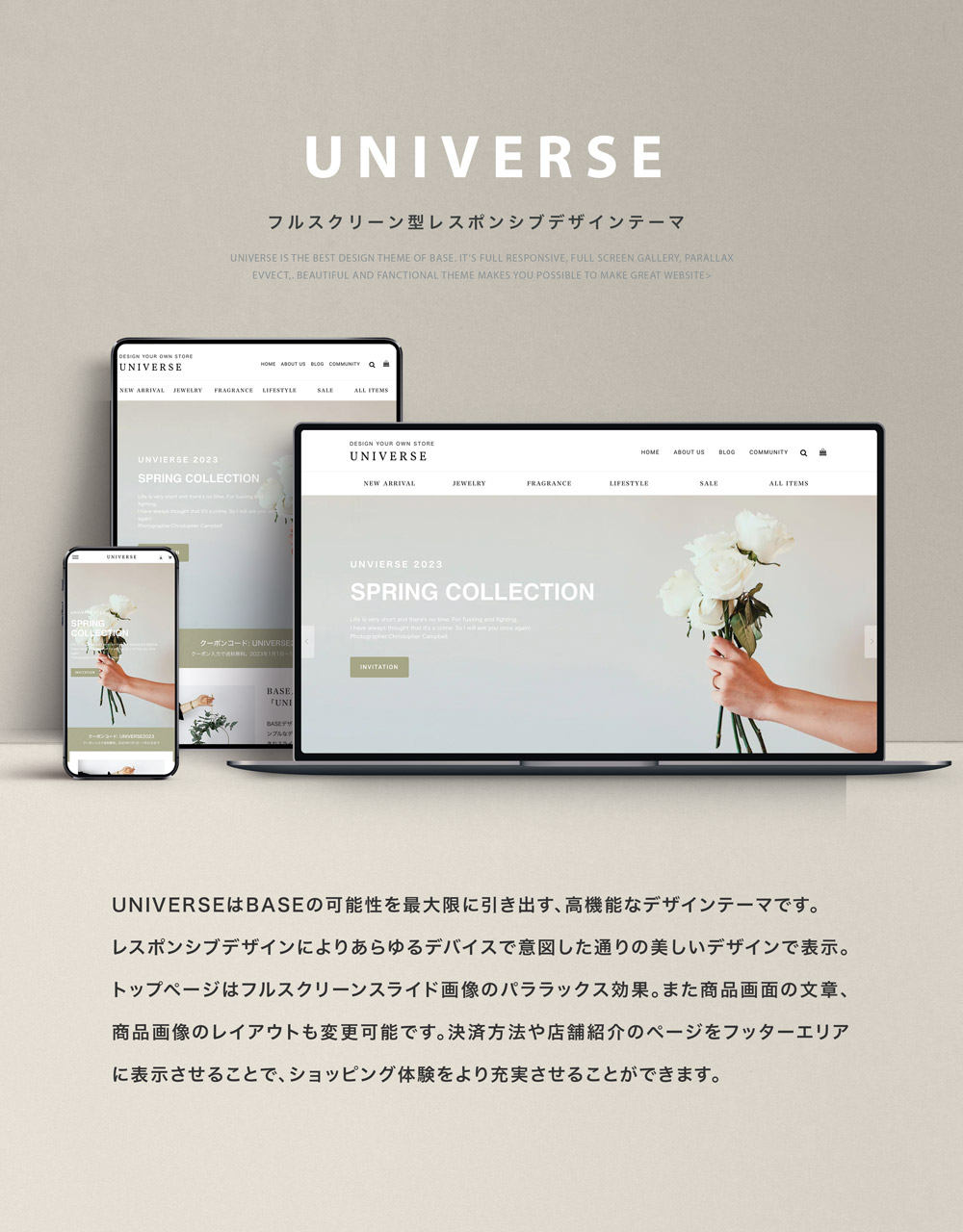 UNIVERSEはスライド&パララックススクロールが印象的なトップページ、決済方法などを表示できるお店情報拡張機能、写真の数や商品説明の長さによって商品ページレイアウトも柔軟にカスタマイズができる高機能デザインテーマです。