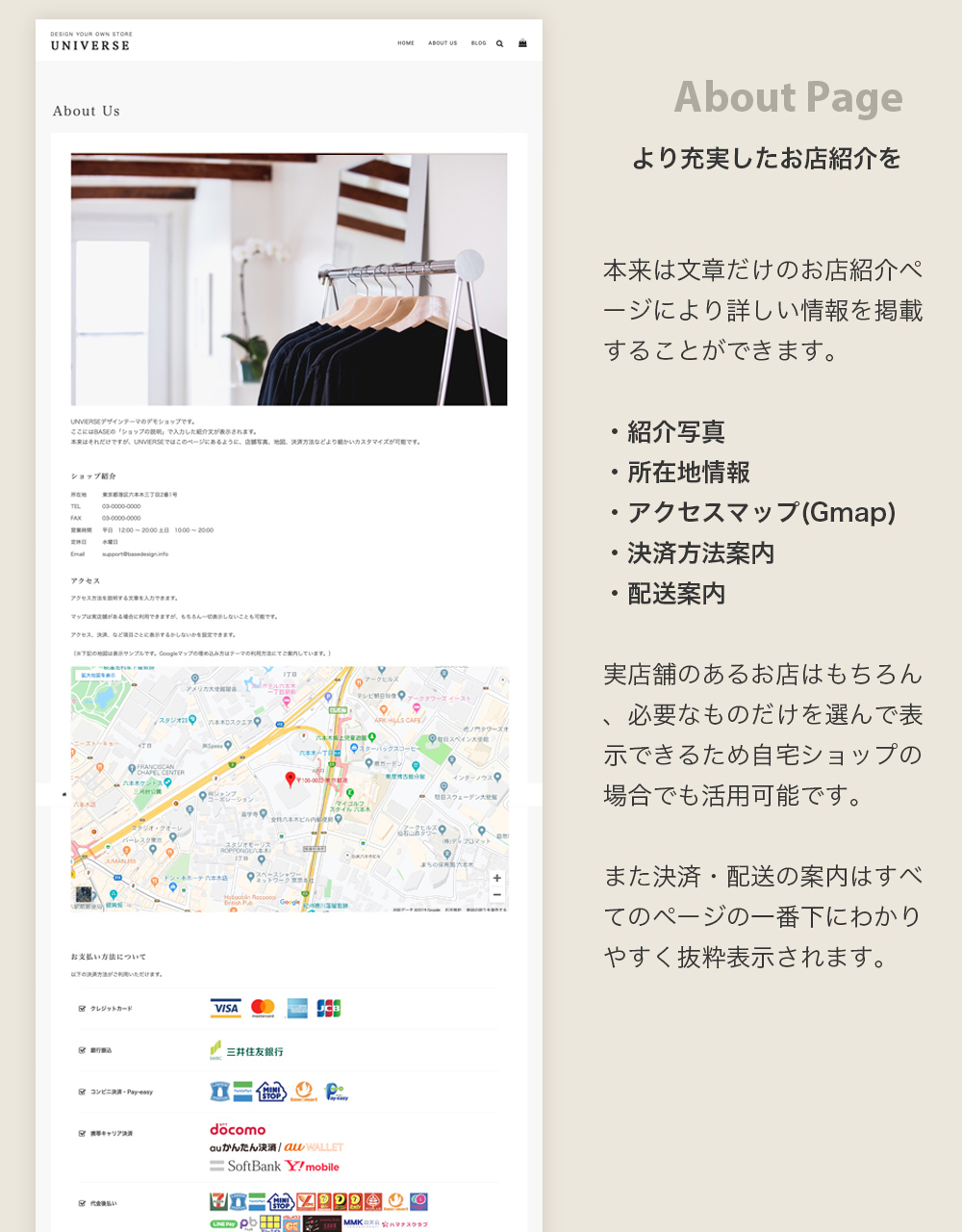 ・Aboutページの拡張機能(お店写真、送料、決済など)
