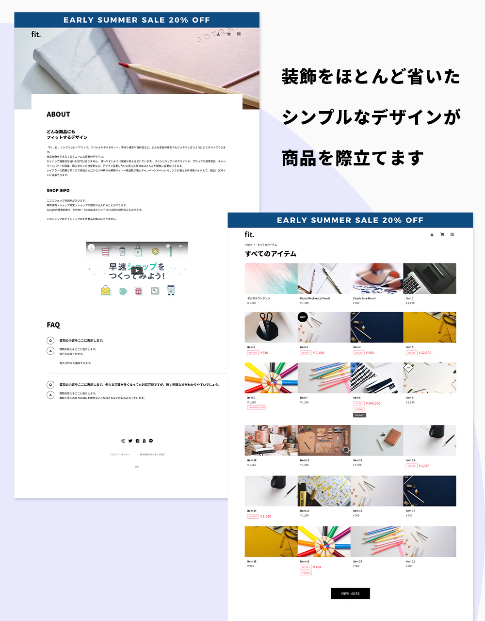 ・ABOUTページにサイトの説明、ショップ情報、YouTube動画、FAQを設置可能