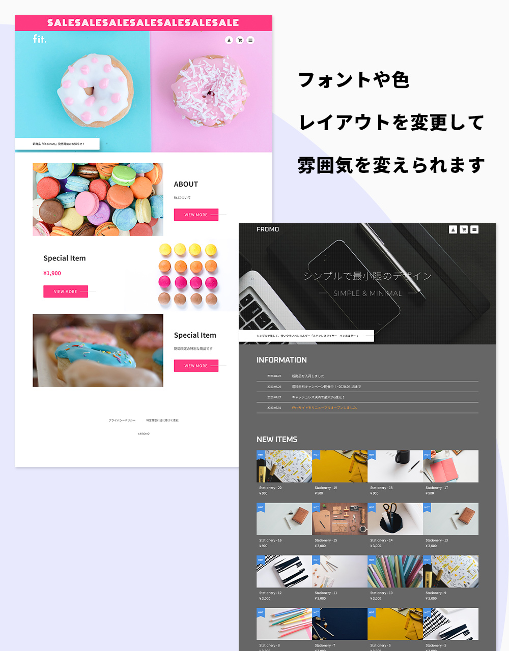 テキストロゴや購入ボタン、キャンペーンバナー、CTAエリア、商品一覧・商品詳細ページに表示される「SOLD OUT」「COMING SOON」「予約販売」「抽選販売」タグは色変更可能です。