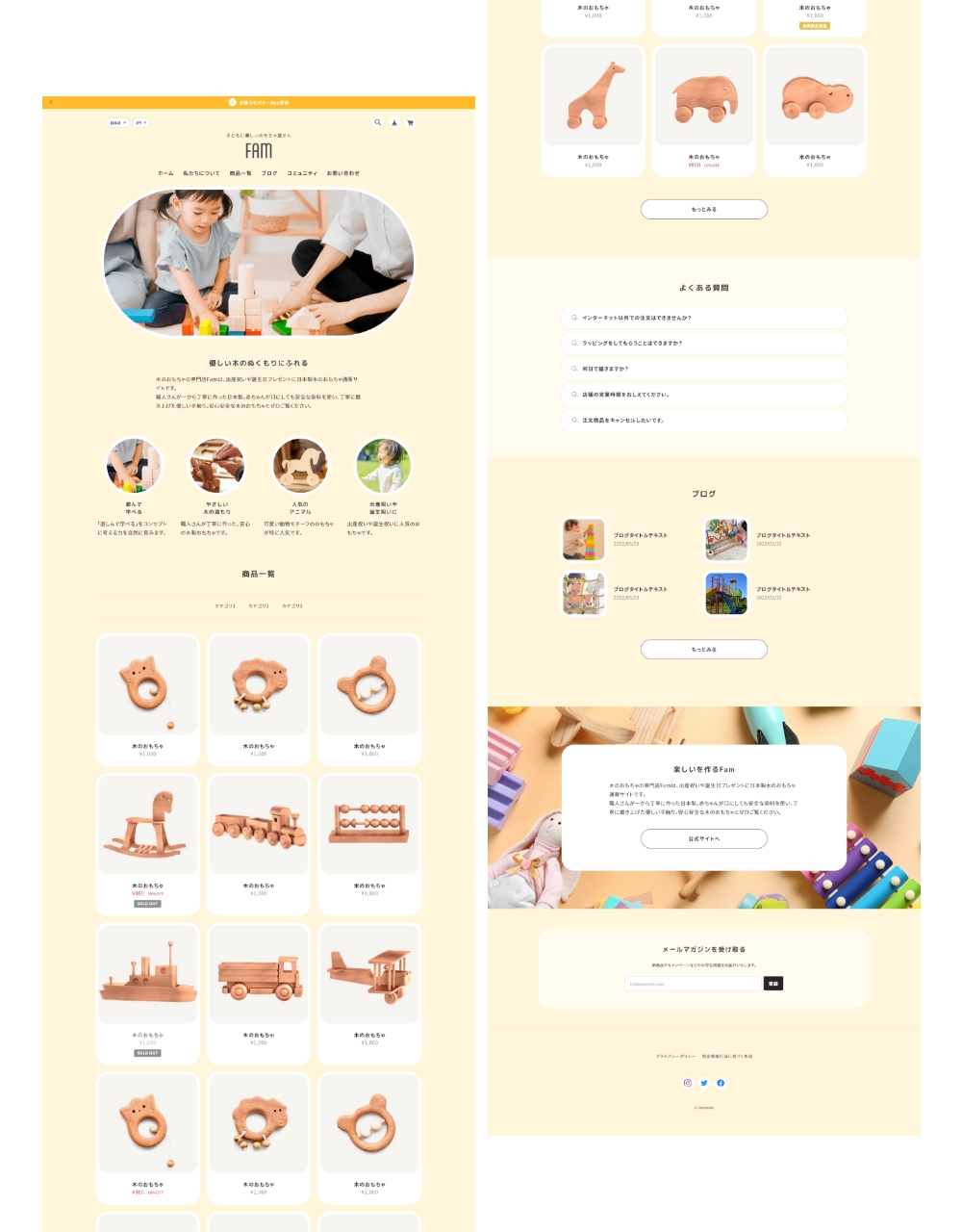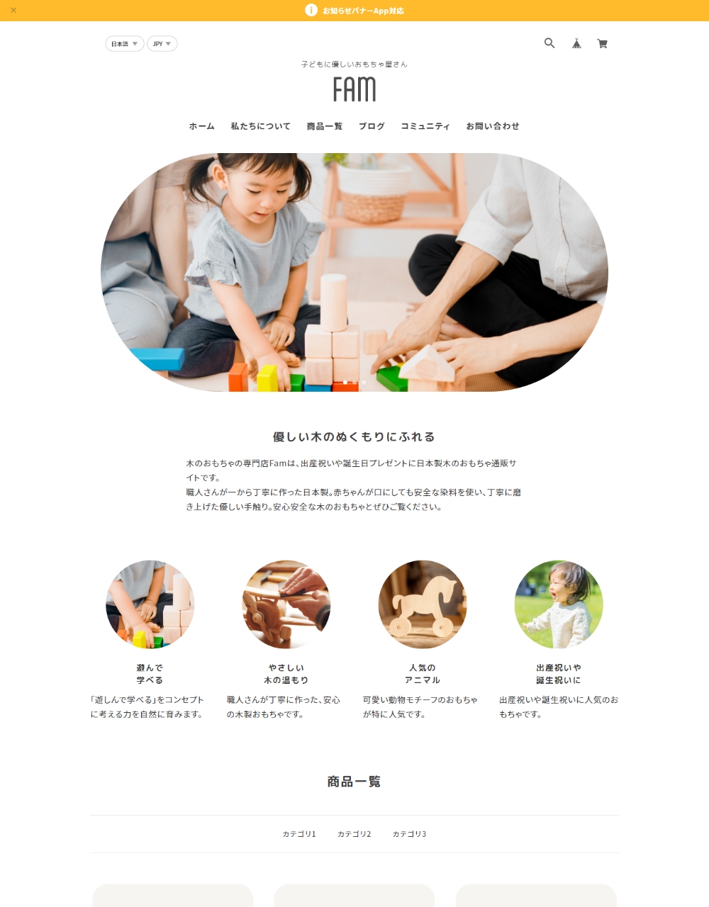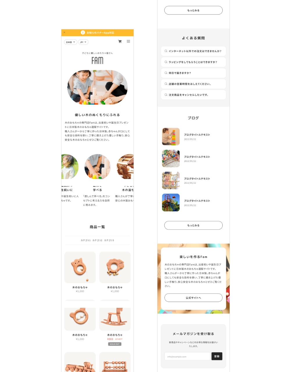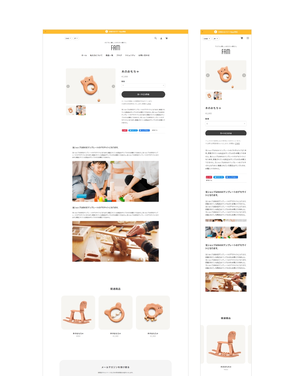 Famは、親しみやすいイメージのサイトを作成するのに最適なデザインテーマです。 ファッション、雑貨、美容、飲食、家具など様々な種類の通販サイトで使用することができます。 ■ こんな方におすすめ ・親しみやすい丸いデザインのサイトを作りたい方 ・子ども向け / 女性向け / ファミリー向けの製品を販売したい方 -------------------------------------------------------- 【当テーマを使用したデモサイト】 ■ デモサイト① https://famdemo.base.shop/ ■ デモサイト② https://famdemo02.base.shop 【テーマの使い方などはこちらから】 https://thebase.web-creates.com/template/fam/setting/ -------------------------------------------------------- パソコン・スマホ・タブレットに対応したレスポンシブデザインです。 ■ スライド画像 (TOPページ) トップページに最大3枚まで登録可能なスライドショーです。 丸型の特徴的なキービジュアルにすることができます。 各画像にリンクをつけることができます。 ※表示ON/OFF可能 ■ ABOUT (TOPページ) お客様がサイトに初めて来た時に、どのようなサイトかがわかるように、ショップやブランドなどの説明文を自由に記載できるエリアです。 ※表示ON/OFF可能 ■ PICKUP (TOPページ) 商品の特徴や、おすすめしたい商品カテゴリなどを4つまで表示することが可能です。 ※表示ON/OFF可能 ■ 商品一覧 (TOPページ) 商品一覧が表示されます。 またカテゴリを設定している場合、商品一覧の上部分に、カテゴリ一覧も表示されます。 ※Appsページから「カテゴリ管理App」をインストールしてください ■ FAQ (TOPページ) よくある質問を最大5つまで表示します。 ※表示ON/OFF可能 ■ BLOG (TOPページ) 最大4件までブログ一覧を表示します。 ※Appsページから「Blog App」をインストールしてください ■ SHOP (TOPページ) TOPページ下部にフリーエリアを設定できます。店舗の概要や公式サイトへの動線など自由にご使用ください。 ※表示ON/OFF可能 ■ ABOUTページ ABOUTページでは、BASE管理画面の「ショップ情報」ページの「ショップの説明」で設定されている文章が表示されます。 また、サブセクションを1つ用意しており、会社概要やメッセージ、ショッピングガイドなど自由にご使用ください。 ■ フォントを3種類選択 フォントの種類をゴシック、明朝体、丸ゴシックから選ぶことができます。 ■ アニメーション フェードインアニメーションのON/OFFを選ぶことができます。 ■ 対応App ・商品検索 ・カテゴリ管理 ・ラベル ・Blog ・セール ・英語・外貨対応 ・デジタルコンテンツ ・レビュー ・販売期間設定 ・予約販売 ・メッセージ ・送料詳細設定 ・商品説明カスタム ・抽選販売 ・テイクアウト ・商品オプション ・コミュニティ ・再入荷自動通知 ・年齢制限 ・お知らせバナー ・メールマガジン ============================================ 【当テーマをご利用の際の注意事項】 ・「デフォルトのモバイルテーマを使用」を必ずOFFにして下さい。 ============================================ ■ 更新情報 / 機能追加のお知らせ (2025.11.24) ・定期便 App対応 (2024.11.17) ・Pay ID あと払いウィジェット対応 (2024.09.09) ・デザイン設定ページのグルーピング設定追加 (2023.05.30) ・TOPページPICKUP スマホカルーセル修正および機能追加 ・関連商品 スマホカルーセル修正および機能追加 ・メンバーシップApp対応 (2023.04.21) ・ショップコインApp終了に伴う対応 ・その他微修正 (2022.11.11) ・スライド画像の各画像にリンクを設定できるようにしました ・ABOUT/PICKUP/SHOP/ABOUTページの説明文の文字揃えの設定ができるように機能追加しました テーマに関するご質問、改善のご要望はこちら https://forms.gle/YJJFh92mw83UNRQ98