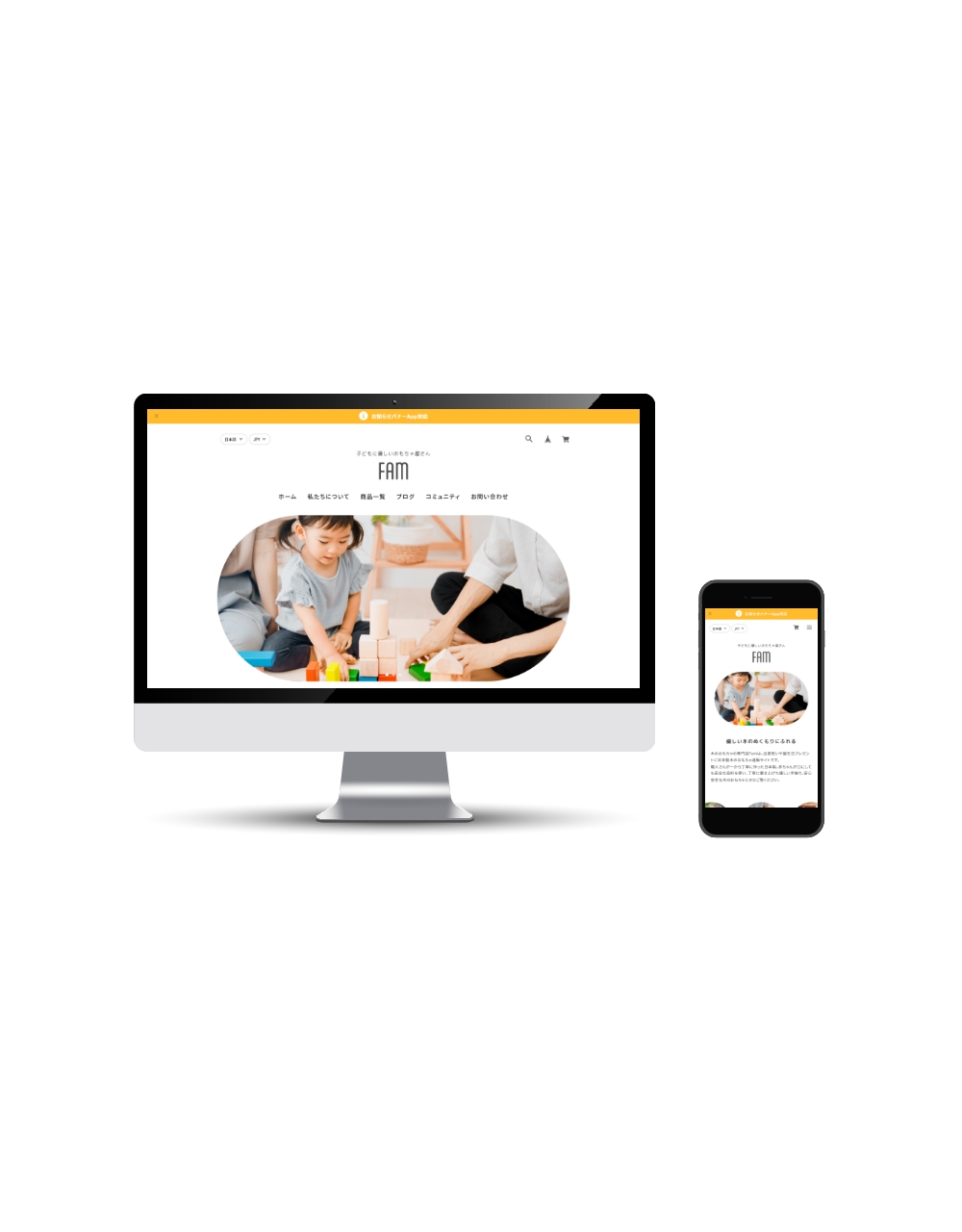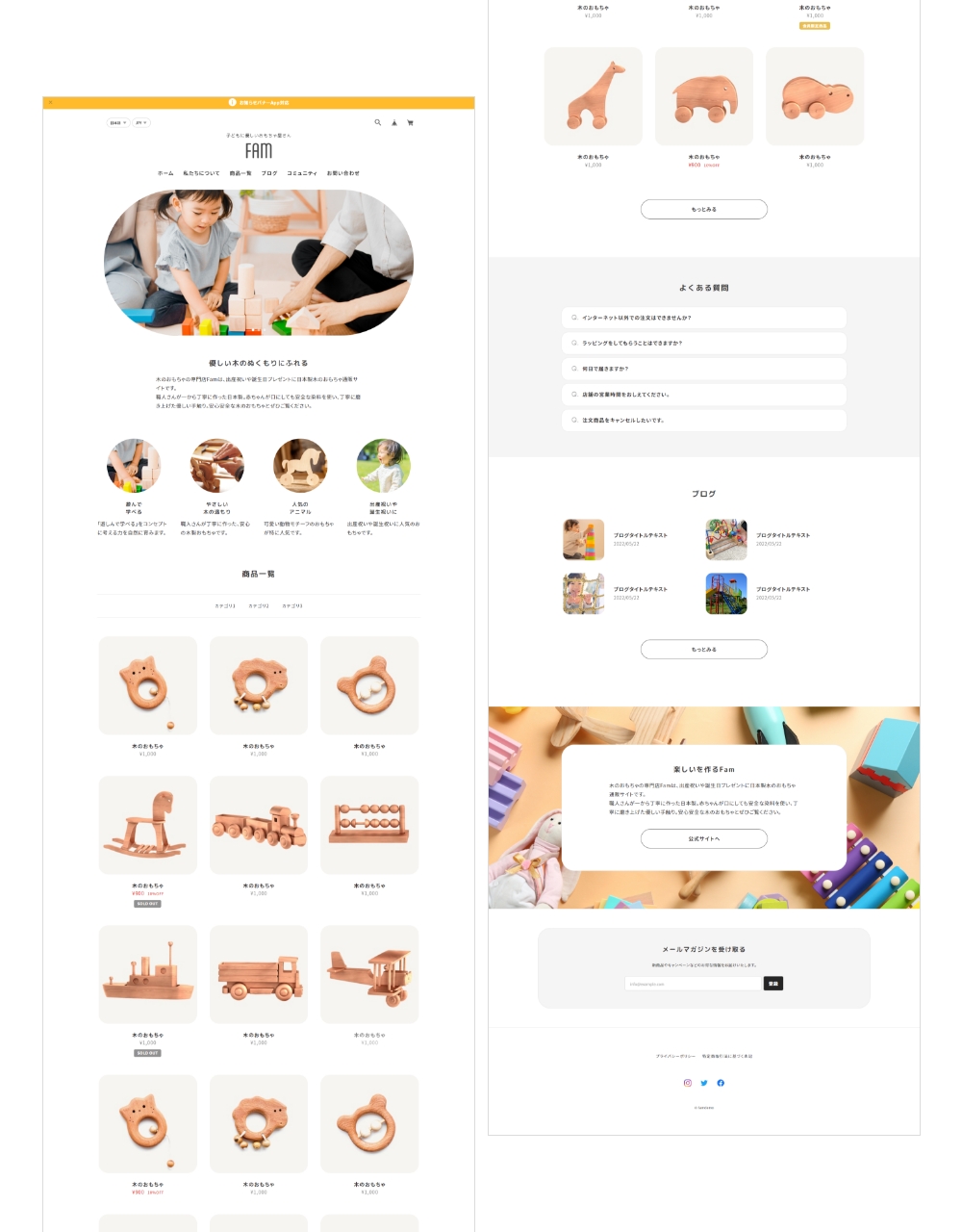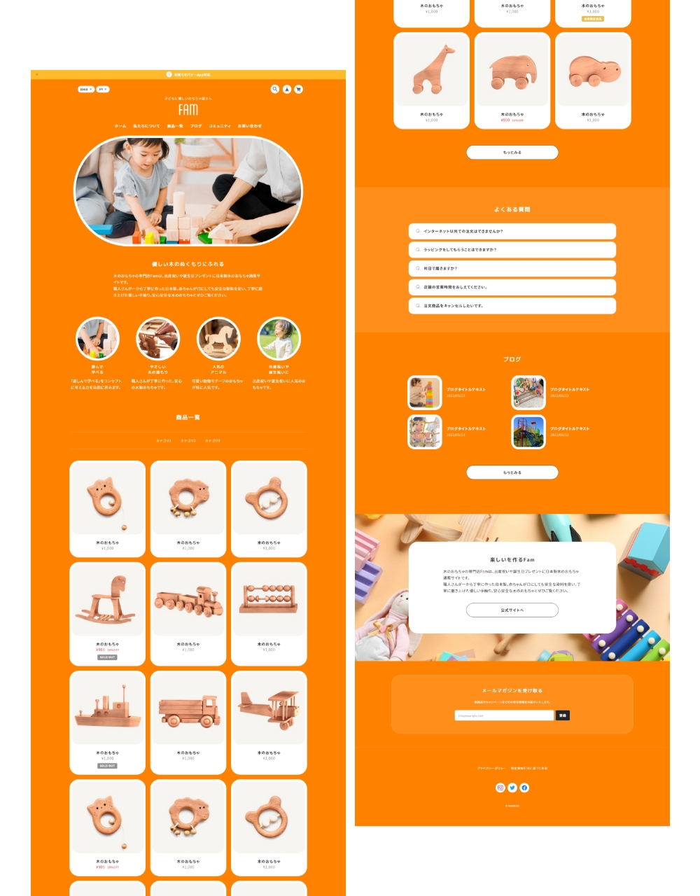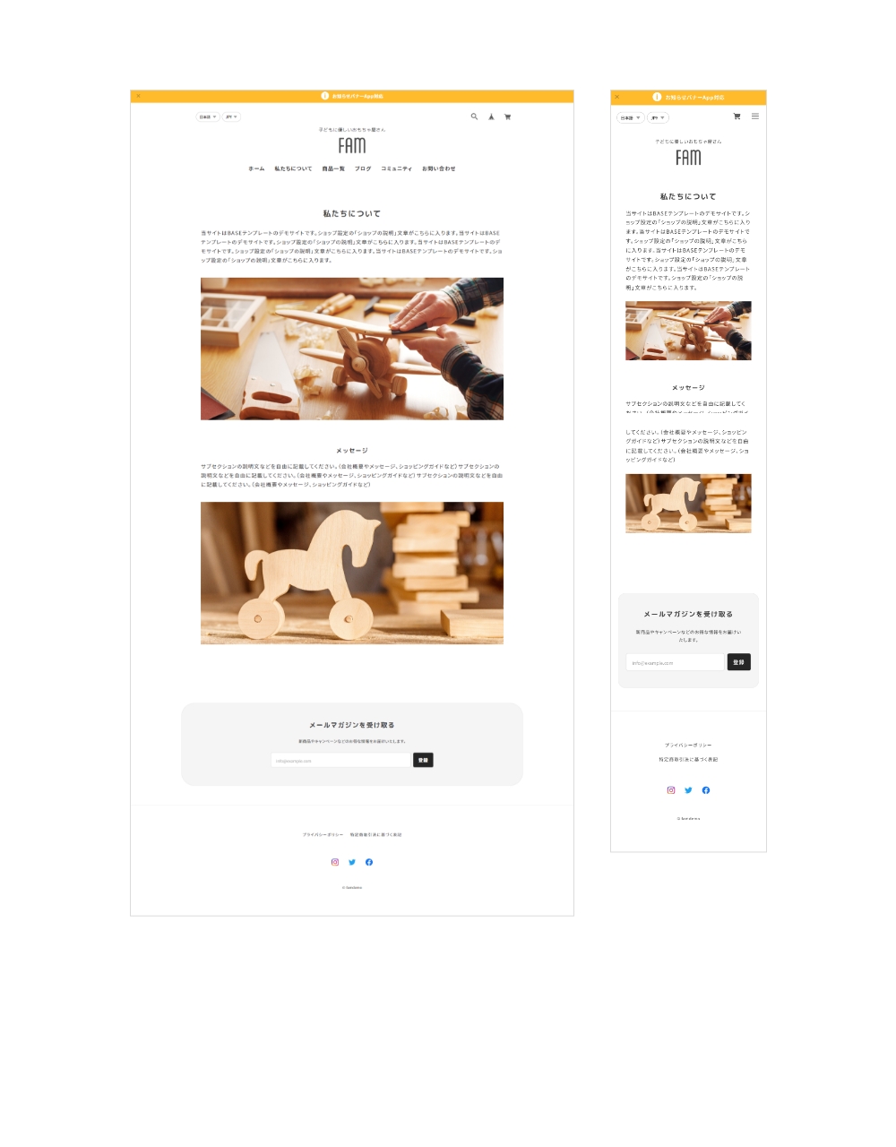 Famは、親しみやすいイメージのサイトを作成するのに最適なデザインテーマです。 ファッション、雑貨、美容、飲食、家具など様々な種類の通販サイトで使用することができます。 ■ こんな方におすすめ ・親しみやすい丸いデザインのサイトを作りたい方 ・子ども向け / 女性向け / ファミリー向けの製品を販売したい方 -------------------------------------------------------- 【当テーマを使用したデモサイト】 ■ デモサイト① https://famdemo.base.shop/ ■ デモサイト② https://famdemo02.base.shop 【テーマの使い方などはこちらから】 https://thebase.web-creates.com/template/fam/setting/ -------------------------------------------------------- パソコン・スマホ・タブレットに対応したレスポンシブデザインです。 ■ スライド画像 (TOPページ) トップページに最大3枚まで登録可能なスライドショーです。 丸型の特徴的なキービジュアルにすることができます。 各画像にリンクをつけることができます。 ※表示ON/OFF可能 ■ ABOUT (TOPページ) お客様がサイトに初めて来た時に、どのようなサイトかがわかるように、ショップやブランドなどの説明文を自由に記載できるエリアです。 ※表示ON/OFF可能 ■ PICKUP (TOPページ) 商品の特徴や、おすすめしたい商品カテゴリなどを4つまで表示することが可能です。 ※表示ON/OFF可能 ■ 商品一覧 (TOPページ) 商品一覧が表示されます。 またカテゴリを設定している場合、商品一覧の上部分に、カテゴリ一覧も表示されます。 ※Appsページから「カテゴリ管理App」をインストールしてください ■ FAQ (TOPページ) よくある質問を最大5つまで表示します。 ※表示ON/OFF可能 ■ BLOG (TOPページ) 最大4件までブログ一覧を表示します。 ※Appsページから「Blog App」をインストールしてください ■ SHOP (TOPページ) TOPページ下部にフリーエリアを設定できます。店舗の概要や公式サイトへの動線など自由にご使用ください。 ※表示ON/OFF可能 ■ ABOUTページ ABOUTページでは、BASE管理画面の「ショップ情報」ページの「ショップの説明」で設定されている文章が表示されます。 また、サブセクションを1つ用意しており、会社概要やメッセージ、ショッピングガイドなど自由にご使用ください。 ■ フォントを3種類選択 フォントの種類をゴシック、明朝体、丸ゴシックから選ぶことができます。 ■ アニメーション フェードインアニメーションのON/OFFを選ぶことができます。 ■ 対応App ・商品検索 ・カテゴリ管理 ・ラベル ・Blog ・セール ・英語・外貨対応 ・デジタルコンテンツ ・レビュー ・販売期間設定 ・予約販売 ・メッセージ ・送料詳細設定 ・商品説明カスタム ・抽選販売 ・テイクアウト ・商品オプション ・コミュニティ ・再入荷自動通知 ・年齢制限 ・お知らせバナー ・メールマガジン ============================================ 【当テーマをご利用の際の注意事項】 ・「デフォルトのモバイルテーマを使用」を必ずOFFにして下さい。 ============================================ ■ 更新情報 / 機能追加のお知らせ (2025.11.24) ・定期便 App対応 (2024.11.17) ・Pay ID あと払いウィジェット対応 (2024.09.09) ・デザイン設定ページのグルーピング設定追加 (2023.05.30) ・TOPページPICKUP スマホカルーセル修正および機能追加 ・関連商品 スマホカルーセル修正および機能追加 ・メンバーシップApp対応 (2023.04.21) ・ショップコインApp終了に伴う対応 ・その他微修正 (2022.11.11) ・スライド画像の各画像にリンクを設定できるようにしました ・ABOUT/PICKUP/SHOP/ABOUTページの説明文の文字揃えの設定ができるように機能追加しました テーマに関するご質問、改善のご要望はこちら https://forms.gle/YJJFh92mw83UNRQ98