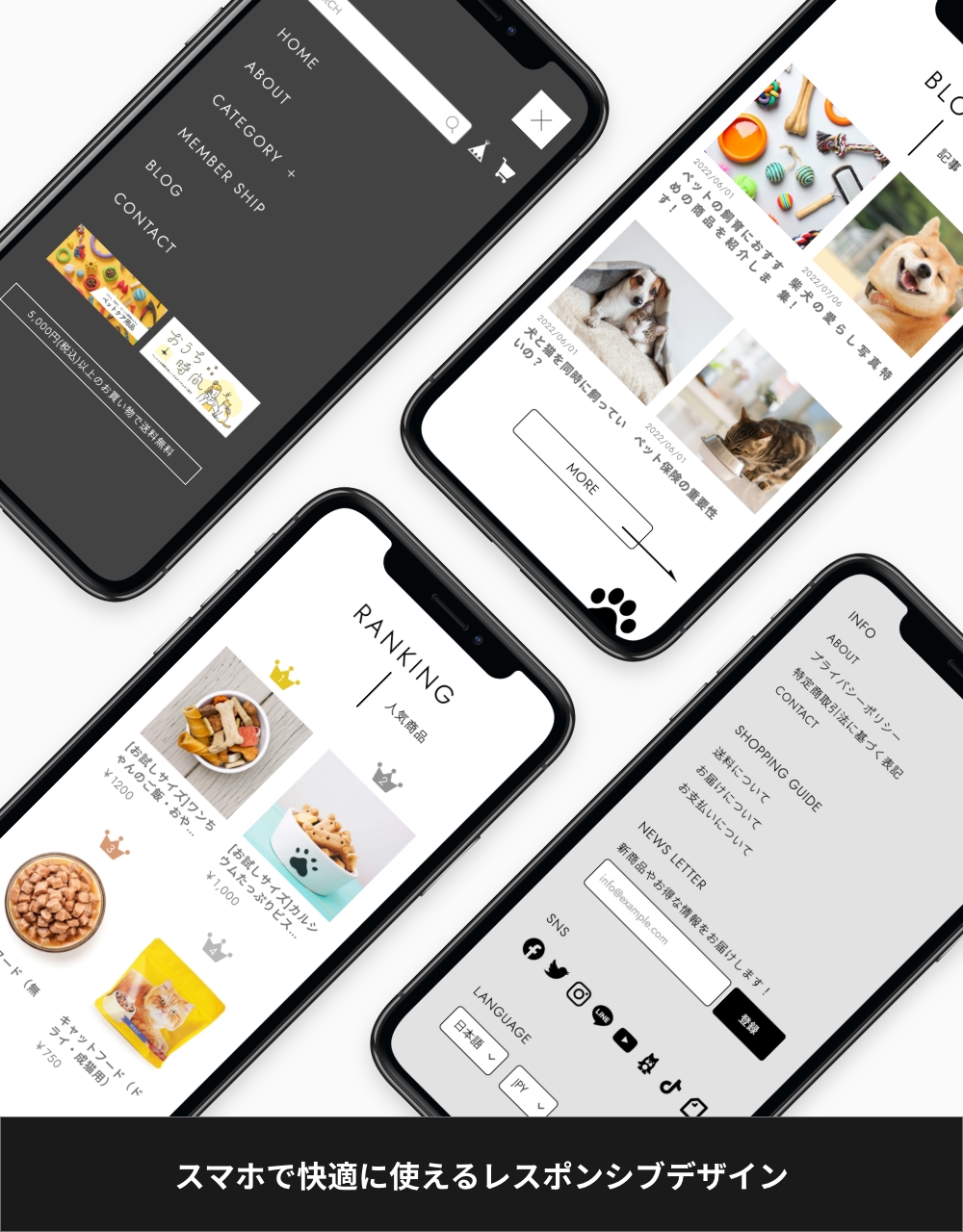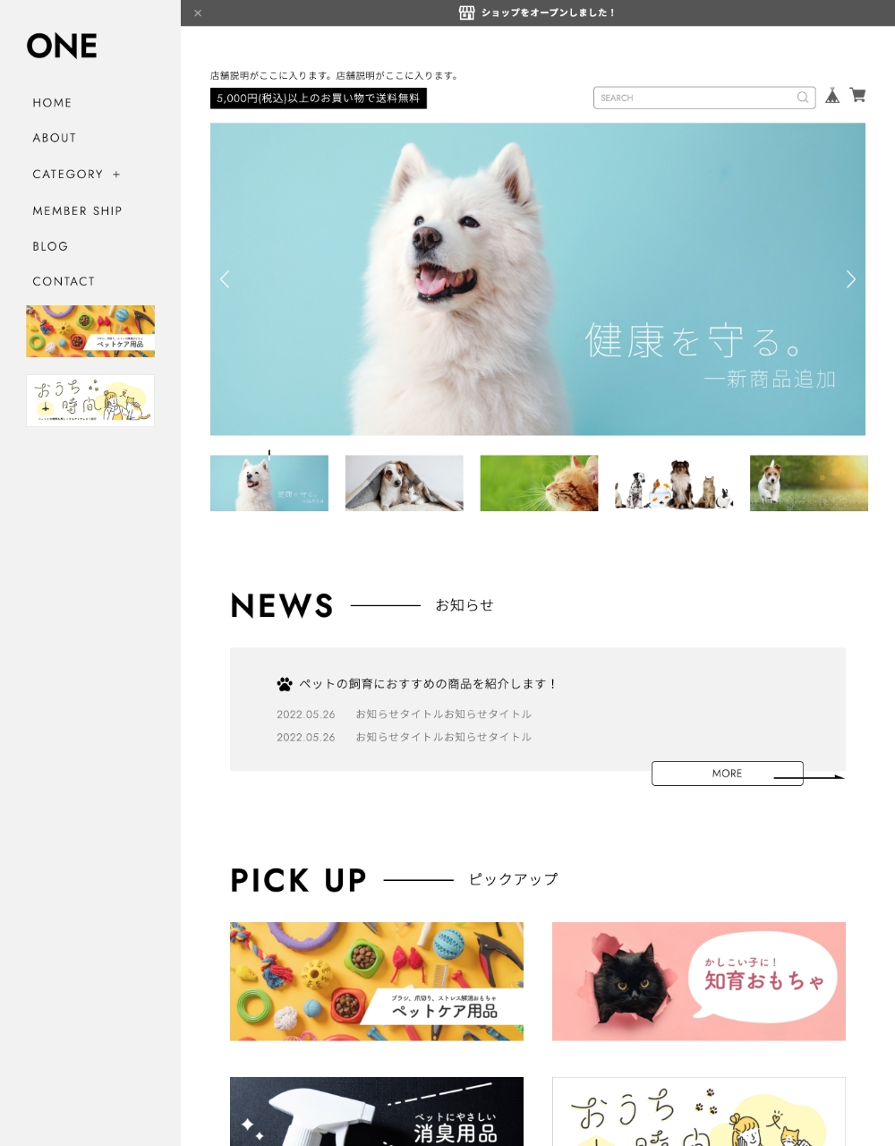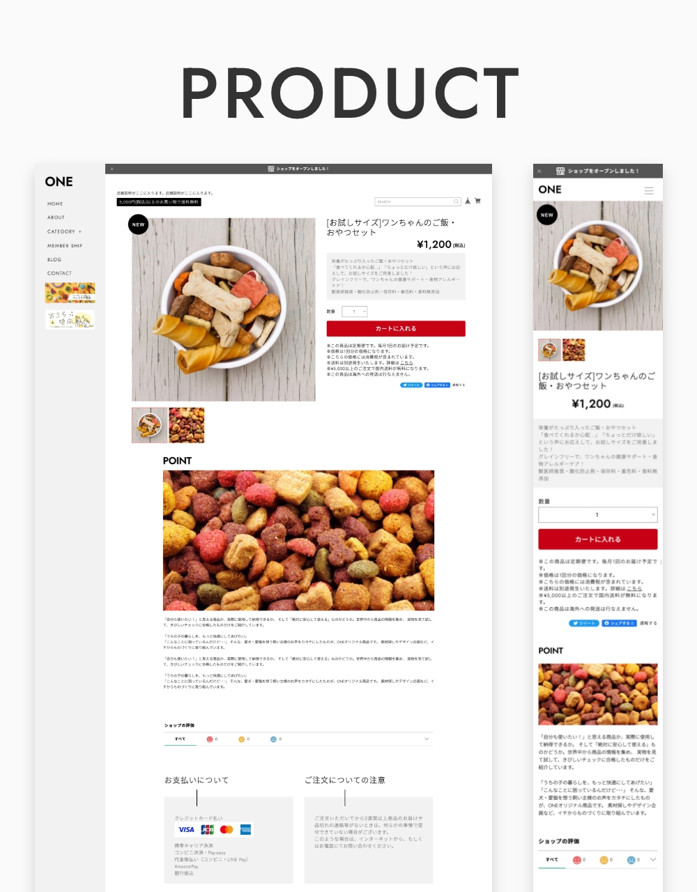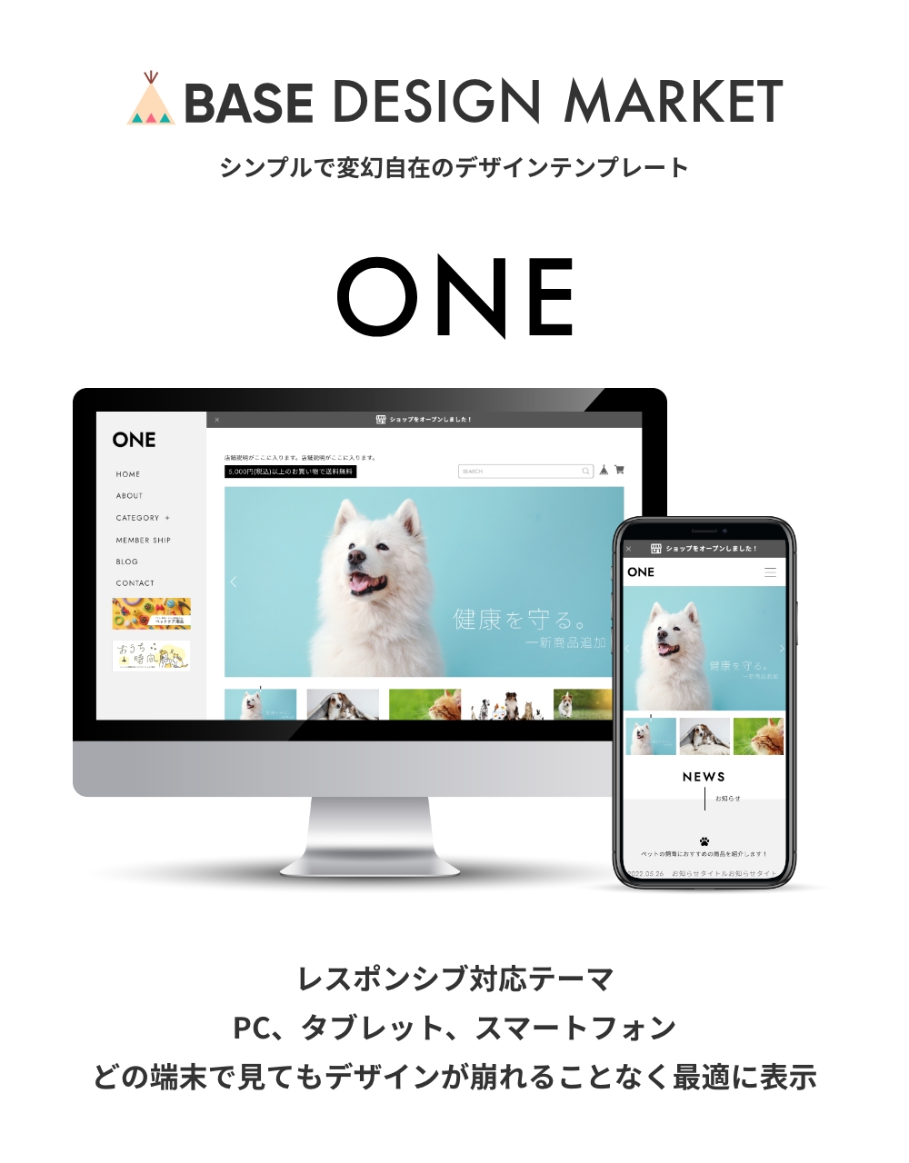 BASEデザインテンプレート「ONE(ワン)」は、豊富なカスタマイズ項目でオリジナルショップを作れるテンプレートです。 ペット用品、食料品、家具、雑貨など、あらゆる商材にお使いいただけます。 TOPページのお知らせを手動更新・自動更新どちらでも対応可能。 ABOUTページではGoogle mapを設置できます(iframeコードを入力)。 レスポンシブに対応していますので、PC、タブレット、スマホなど、どの端末で見てもデザインが崩れることなく最適に表示されます。 ─────────────────── ■デモショップ https://hameedemo04.base.shop/ ■テーマの詳細 https://hamee-consulting.co.jp/base/one ■よくあるご質問 https://hamee-consulting.co.jp/base/one#other_01 ─────────────────── 【主な機能】 ■フォントサイズ・ロゴ フォントは「Noto Sans JP」「Noto Serif JP」「Zen Maru Gothic」の3種類から選べます。 ■各カラー メニュー部分やボタンカラーなど細かく色を設定することができます。 ■スライド トップページ上部にスライド画像を5枚まで設定できます。 ■NEWS 日付、見出し、リンクを1つずつ最大3つまで設定できます。 ブログの最新記事を自動で表示することも可能です。 ※Appsページから「Blog App」をインストールする必要があります。 ■PICK UP 画像、リンクを1つずつ最大4つまで設定できます。 ■RANKING アピールしたい商品の画像、リンク、商品名、価格を1つずつ最大4つまで設定できます。 ■お得商品 お得商品だけでなく、アピールしたいカテゴリなどを表示できます。 ■特集 画像、リンクを1つずつ最大6つまで設定できます。 PICK UPでは紹介しきれなかったバナー画像などを設置していただけます。 【対応Apps】 ・メンバーシップ ・送料詳細設定 ・メッセージ ・カテゴリ管理 ・再入荷自動通知 ・BASEロゴ非表示 ・デジタルコンテンツ ・英語・外貨対応 ・メールマガジン ・年齢制限 ・Blog ・ラベル ・商品検索 ・定期便 ・レビュー ・セール ・販売期間設定 ・予約販売 ・抽選販売 ・商品説明カスタム ・商品オプション ・コミュニティ ・テイクアウト ・お知らせバナー ■ 更新履歴 ・2025.12 ご利用可能クレジットカード変更に伴い画像を修正いたしました。 ・2025.06 Pay ID あと払いウィジェットが商品ページに表示されるようになりました。 ・2024.08 テーマの説明URLを変更いたしました。 ・2024.06 「《TOP》ブログ一覧を表示する」設定で非表示されるように修正しました。SNSアイコンを各ブランド色のものに変更しました。 ・2023.11 フッターのtwitterアイコンをXに変更しました。 ・2023.06 メンバーシップAppに対応しました。 ・2023.05 ABOUTページの送料部分を細かく設定できるように機能を追加しました。 ・2023.02 検索画面で商品数が多い場合「MORE」ボタンが出るように修正しました。 ・2022.11 デザインオプションのカスタマイズ項目追加と、登録画像の推奨サイズを記載しました。 ・2022.10 スライダーの挙動修正と、ガイドのテキストの一部仕様を変更しました。 ・2022.10 英単語が多い場合でも自動翻訳が表示されないようにしました。 ・2022.10 商品説明文に入力したURLがリンクにならない不具合を修正しました。 ・2022.10 固定お知らせアイコンの種類を追加しました。 ・2022.09 一部リンクが適用されない不具合を修正しました。