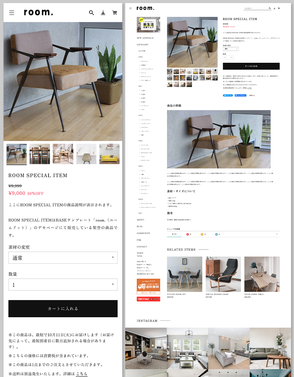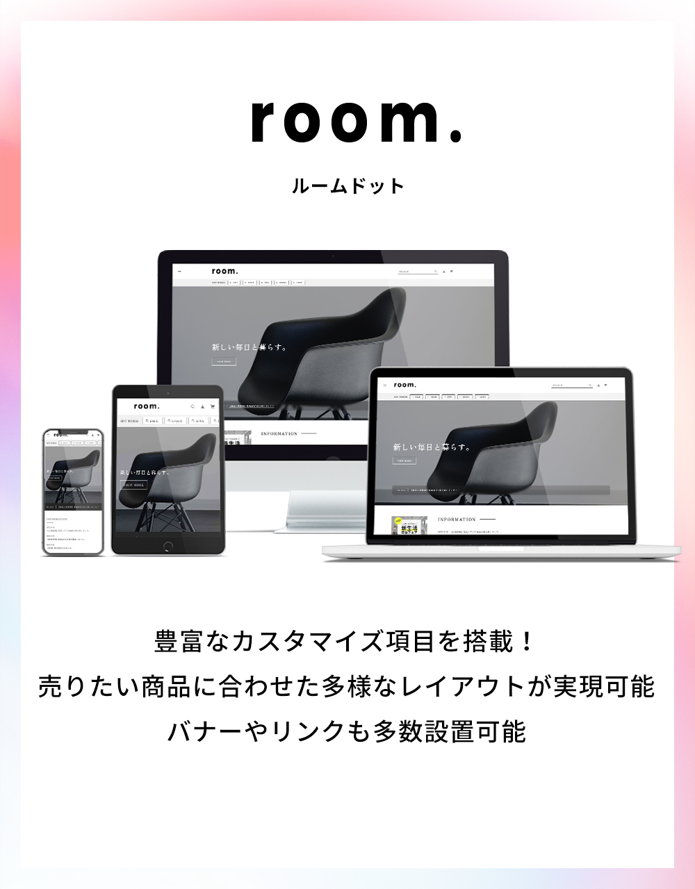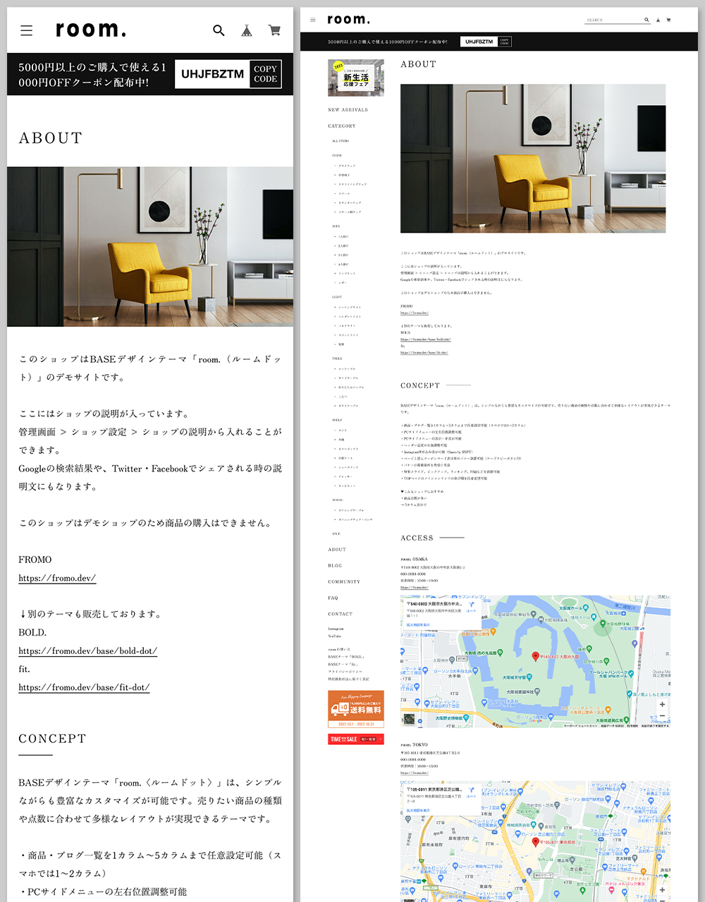 「room.〈 ルームドット 〉」はシンプルながらも豊富なカスタマイズが可能です。 売りたい商品の種類や点数に合わせて多様なレイアウトが実現できるテーマです。 インテリア、アパレル、雑貨、化粧品、など様々な種類のECサイトとしてお使いいただけます。 ▼こんなショップにおすすめ ・ショップのイベント時にバナーやリンクをいろんな箇所に配置したい ・Instagramの埋め込み機能が欲しい ・ランキング表示機能が欲しい → 豊富なテーマオプションで欲しい機能が見つかります! ▼こんなお悩みがあるショップにもおすすめ ・商品点数が多い ・商品点数が少ない ・取扱い商品が1点しかない → 商品一覧のレイアウトを変更できるので、 商品点数によってサイトの見栄えが左右されません。 =========================== ◆ room.を利用したデモショップ https://roomdot.base.ec/ ◆ テーマの詳細はこちら https://fromo.dev/base/room-dot/ =========================== ▼ 対応するBASE Appsについて ・メッセージApp ・カテゴリ管理App ・送料詳細設定App ・BASEロゴ非表示App ・デジタルコンテンツApp ・英語・外貨対応App ・BlogApp ・ラベルApp ・商品検索App ・定期便App ・レビューApp ・セールApp ・販売期間設定App ・予約販売App ・抽選販売App ・商品説明カスタムApp ・商品オプションApp ・コミュニティApp ・テイクアウトApp ・年齢制限App ・お知らせバナーApp ・メールマガジンApp ・メンバーシップApp ▼ テーマ概要 ◆ カラー設定 テキストやヘッダー、フッターなどの色変更が可能です。 ◆ フォント設定 明朝体・ゴシック体のどちらかを設定できます。 ◆ レイアウト設定 PC表示時の1カラム、2カラム設定が可能です。 2カラム時の左右位置の変更も可能です。 ◆ 商品/ブログ一覧レイアウト設定 表示カラム数を変更できます。 PC表示時、スマホ表示時でそれぞれ選択可能です。 PC:1〜5カラム スマホ:1〜3カラム ◆ クーポンバナー設定 クーポンAppにて発行されるクーポンコードを常時表示できるバナーエリアを設置できます。(要クーポンApp) ◆ HOT WORDS設定 TOPページのヘッダーの下におすすめの検索キーワードを5つ表示できます。(商品検索App利用時) ◆ メイン画像設定 TOPページ上部のメイン画像を設置できます。 スマホとPCでそれぞれ違う大きさの画像を設定できます。 また、任意のテキストをメイン画像上に配置することも可能です。 リンクボタンも追加できます。 ◆ お知らせ設定(INFORMATION) TOPページにお知らせを3件表示できます。 ◆ 特集スライド設定 TOPページに「画像」・「タイトル」・「金額」・「説明」を1セットにしたスライドを3スライドまで設定できます。 ◆ ランキング設定 TOPページにランキングを5位まで表示できます。(手動調整) ◆ カテゴリー商品一覧表示設定 TOPページに任意のカテゴリーの商品一覧を表示できます。 (カテゴリ管理管理App利用時・2カテゴリーまで) ◆ ブログ表示設定 TOPページにブログ記事を3〜10件表示できます。 (BLOG App利用時) ◆ FAQ設定 TOPページによくある質問を最大6件まで掲載できます。 ◆ 並び順変更設定 TOPページのメインコンテンツ部分の並び順を変更変更できます。 下記のエリアの並び順を任意で変更できます。 ・INFORMATION ・YouTube動画 ・パネルバナー ・特集スライド ・ランキング ・カテゴリー商品一覧 ・商品一覧 ・ブログ一覧 ・FAQ ・カテゴリ一覧 ◆ Instagram埋め込み表示設定 Sauce by SNPTを使ってInstagramのタイムライン表示ができます。 ◆ ABOUTページ設定 コンセプトやアクセス・営業時間情報、ショップガイドなどテキストを掲載できるエリアを多数用意しています。 ◆ 各所バナー設定 バナー画像を設置できる箇所を複数用意しています。 ◆ 商品ページ ・最近見た商品の表示機能(最大6件) ・セール商品の表示機能(最大6件、要セールApp) その他、詳細についてはテーマの説明ページをご覧ください。 =========================== ◆ テーマの詳細はこちら https://fromo.dev/base/room-dot/ ◆ ご質問・ご要望については下記サイトよりお願いいたします。 https://fromo.dev/ =========================== ◆ 更新情報 2025.12 定期便Appアップデート対応 2025.2 カートバッジ表示機能に対応 2024.11 Pay ID あと払いウィジェット対応 2024.2 SNSアイコン各種を変更 2023.11 メニューのカテゴリ表示のフォントサイズを変更 2023.09 商品ページに「残り1点」表示機能追加 2023.09 TOPページにYouTube動画の埋め込み機能追加 2023.05 メンバーシップAppに対応 2023.01 商品一覧「SOLD OUT」表示を画像の上に配置するかタグとして商品価格の下に配置するか切替機能を追加 2022.12 商品ページ「セール商品」の表示機能追加 2022.11 各所フォントサイズの微調整 2022.11 商品ページ「最近見た商品」の表示機能追加 2022.11 TOPページ 任意のカテゴリー商品一覧の表示機能追加 2022.11 メインビジュアルにアニメーション演出追加(ON/OFF可能) 2022.11 スクロール時に要素のアニメーション演出追加(ON/OFF可能)