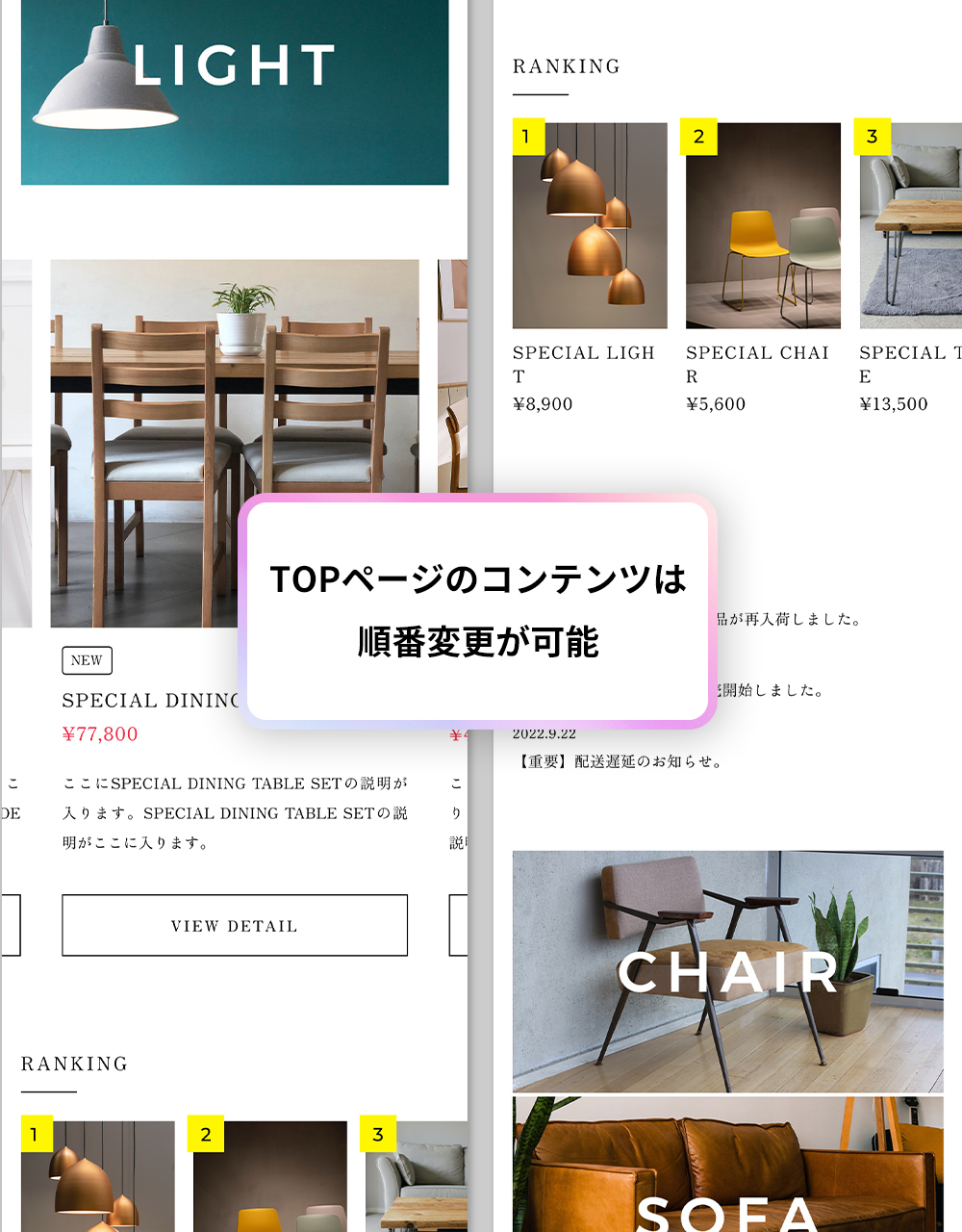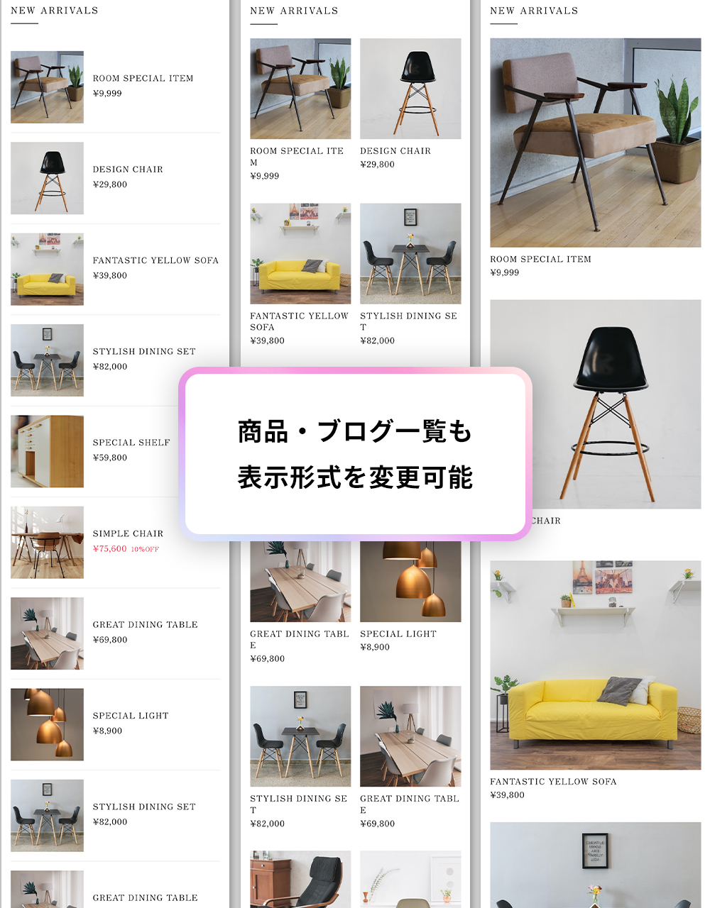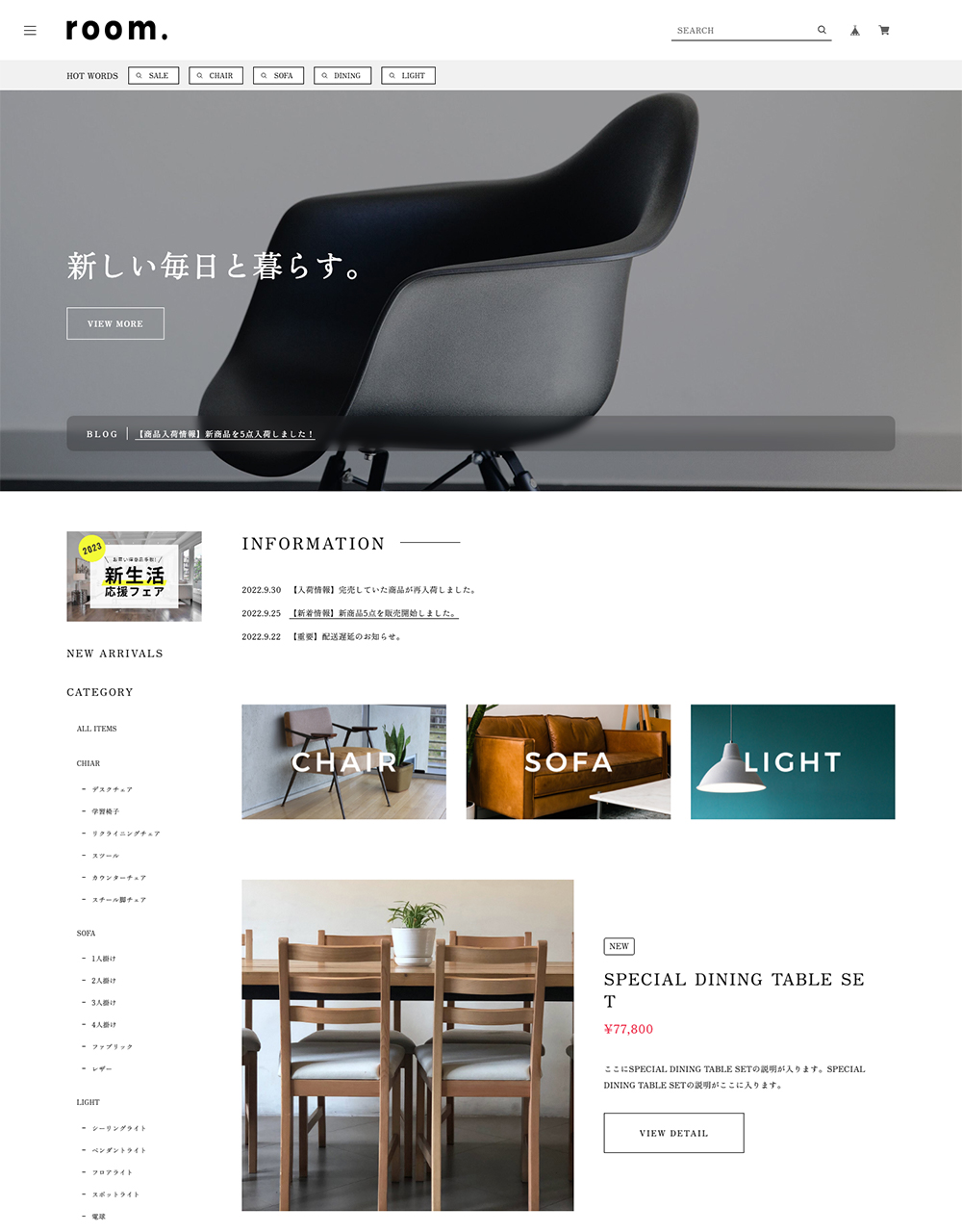 「room.〈 ルームドット 〉」はシンプルながらも豊富なカスタマイズが可能です。 売りたい商品の種類や点数に合わせて多様なレイアウトが実現できるテーマです。 インテリア、アパレル、雑貨、化粧品、など様々な種類のECサイトとしてお使いいただけます。 ▼こんなショップにおすすめ ・ショップのイベント時にバナーやリンクをいろんな箇所に配置したい ・Instagramの埋め込み機能が欲しい ・ランキング表示機能が欲しい → 豊富なテーマオプションで欲しい機能が見つかります! ▼こんなお悩みがあるショップにもおすすめ ・商品点数が多い ・商品点数が少ない ・取扱い商品が1点しかない → 商品一覧のレイアウトを変更できるので、 商品点数によってサイトの見栄えが左右されません。 =========================== ◆ room.を利用したデモショップ https://roomdot.base.ec/ ◆ テーマの詳細はこちら https://fromo.dev/base/room-dot/ =========================== ▼ 対応するBASE Appsについて ・メッセージApp ・カテゴリ管理App ・送料詳細設定App ・BASEロゴ非表示App ・デジタルコンテンツApp ・英語・外貨対応App ・BlogApp ・ラベルApp ・商品検索App ・定期便App ・レビューApp ・セールApp ・販売期間設定App ・予約販売App ・抽選販売App ・商品説明カスタムApp ・商品オプションApp ・コミュニティApp ・テイクアウトApp ・年齢制限App ・お知らせバナーApp ・メールマガジンApp ・メンバーシップApp ▼ テーマ概要 ◆ カラー設定 テキストやヘッダー、フッターなどの色変更が可能です。 ◆ フォント設定 明朝体・ゴシック体のどちらかを設定できます。 ◆ レイアウト設定 PC表示時の1カラム、2カラム設定が可能です。 2カラム時の左右位置の変更も可能です。 ◆ 商品/ブログ一覧レイアウト設定 表示カラム数を変更できます。 PC表示時、スマホ表示時でそれぞれ選択可能です。 PC:1〜5カラム スマホ:1〜3カラム ◆ クーポンバナー設定 クーポンAppにて発行されるクーポンコードを常時表示できるバナーエリアを設置できます。(要クーポンApp) ◆ HOT WORDS設定 TOPページのヘッダーの下におすすめの検索キーワードを5つ表示できます。(商品検索App利用時) ◆ メイン画像設定 TOPページ上部のメイン画像を設置できます。 スマホとPCでそれぞれ違う大きさの画像を設定できます。 また、任意のテキストをメイン画像上に配置することも可能です。 リンクボタンも追加できます。 ◆ お知らせ設定(INFORMATION) TOPページにお知らせを3件表示できます。 ◆ 特集スライド設定 TOPページに「画像」・「タイトル」・「金額」・「説明」を1セットにしたスライドを3スライドまで設定できます。 ◆ ランキング設定 TOPページにランキングを5位まで表示できます。(手動調整) ◆ カテゴリー商品一覧表示設定 TOPページに任意のカテゴリーの商品一覧を表示できます。 (カテゴリ管理管理App利用時・2カテゴリーまで) ◆ ブログ表示設定 TOPページにブログ記事を3〜10件表示できます。 (BLOG App利用時) ◆ FAQ設定 TOPページによくある質問を最大6件まで掲載できます。 ◆ 並び順変更設定 TOPページのメインコンテンツ部分の並び順を変更変更できます。 下記のエリアの並び順を任意で変更できます。 ・INFORMATION ・YouTube動画 ・パネルバナー ・特集スライド ・ランキング ・カテゴリー商品一覧 ・商品一覧 ・ブログ一覧 ・FAQ ・カテゴリ一覧 ◆ Instagram埋め込み表示設定 Sauce by SNPTを使ってInstagramのタイムライン表示ができます。 ◆ ABOUTページ設定 コンセプトやアクセス・営業時間情報、ショップガイドなどテキストを掲載できるエリアを多数用意しています。 ◆ 各所バナー設定 バナー画像を設置できる箇所を複数用意しています。 ◆ 商品ページ ・最近見た商品の表示機能(最大6件) ・セール商品の表示機能(最大6件、要セールApp) その他、詳細についてはテーマの説明ページをご覧ください。 =========================== ◆ テーマの詳細はこちら https://fromo.dev/base/room-dot/ ◆ ご質問・ご要望については下記サイトよりお願いいたします。 https://fromo.dev/ =========================== ◆ 更新情報 2025.12 定期便Appアップデート対応 2025.2 カートバッジ表示機能に対応 2024.11 Pay ID あと払いウィジェット対応 2024.2 SNSアイコン各種を変更 2023.11 メニューのカテゴリ表示のフォントサイズを変更 2023.09 商品ページに「残り1点」表示機能追加 2023.09 TOPページにYouTube動画の埋め込み機能追加 2023.05 メンバーシップAppに対応 2023.01 商品一覧「SOLD OUT」表示を画像の上に配置するかタグとして商品価格の下に配置するか切替機能を追加 2022.12 商品ページ「セール商品」の表示機能追加 2022.11 各所フォントサイズの微調整 2022.11 商品ページ「最近見た商品」の表示機能追加 2022.11 TOPページ 任意のカテゴリー商品一覧の表示機能追加 2022.11 メインビジュアルにアニメーション演出追加(ON/OFF可能) 2022.11 スクロール時に要素のアニメーション演出追加(ON/OFF可能)
