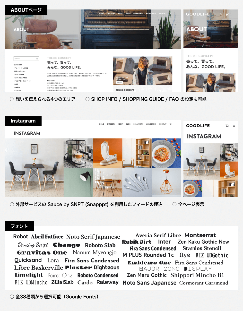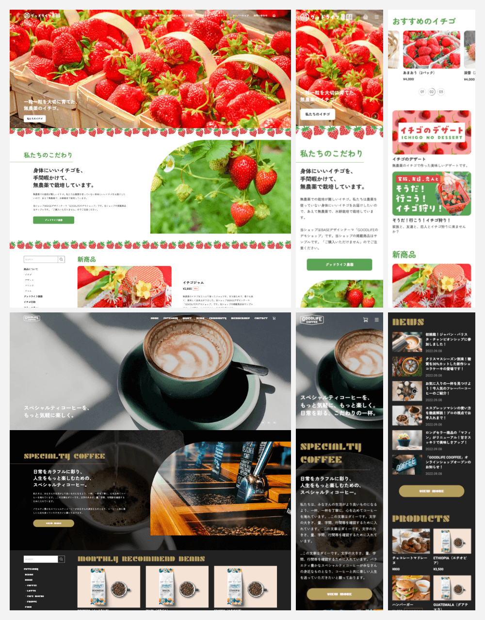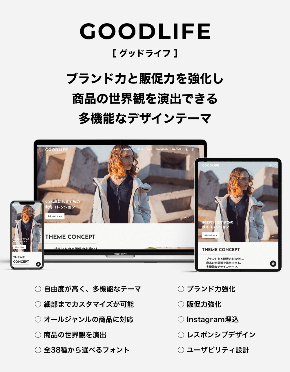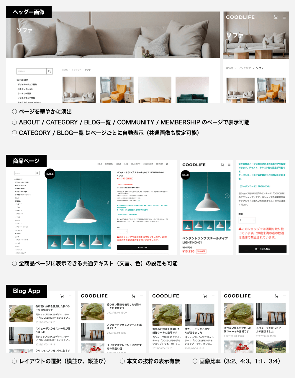 −−−−−−−−−−−−−−−−−−−−−−−−− ブランド力と販促力を強化し、 商品の世界観を演出できる、 多機能なデザインテーマ。 −−−−−−−−−−−−−−−−−−−−−−−−− ○ 自由度が高く、多機能なテーマ ○ 細部までカスタマイズが可能 ○ オールジャンルの商品に対応 ○ 商品の世界観を演出 ○ ブランド力強化 ○ 販促力強化 ○ レスポンシブデザイン(PC、タブレット、スマホに対応) ○ ユーザビリティ設計 −−−−−−−−−−−−−−−−−−−−−−−−− 主な特徴 −−−−−−−−−−−−−−−−−−−−−−−−− ○ 38種類から選べるフォント ○ デザインの選択(画像の角丸、ボタンの形状) ○ 画像比率の選択(3:2、4:3、1:1、3:4) ○ ナビゲーションでのバナー表示 ○ メインビジュアルのスライド3パターン(静止、スライド、フェード) ○ CONCEPTエリア ○ エリアの並べ替え ○ INFORMATIONエリア(テキストのみ) ○ バナーエリア ○ PICK UP商品エリア ○ RANKINGエリア ○ Instagramフィード表示(外部サービスを利用) ○ 下層ページのヘッダー画像の表示 ○ 商品ページの共通テキストエリア ○ ABOUTページの4つのエリア ○ BLOG一覧(レイアウト、本文抜粋の表示設定) ○ OGP画像設定 ○ CSS追加設定(上級者向け) −−−−−−−−−−−−−−−−−−−−−−−−− デモショップ −−−−−−−−−−−−−−−−−−−−−−−−− ■ テーマの説明を兼ねたオールジャンルのお店 ○ メインビジュアル(スライド) ○ フルスクリーン表示ON ○ COMMUNITYページのヘッダー画像の登録あり https://goodlife1.base.shop ■ 身体にいい無農薬栽培のイチゴ農園 ○ メインビジュアル(フェードのアニメーションON) ○ COMMUNITYページのヘッダー画像の登録あり https://goodlife2.base.shop ■ こだわりのスペシャルティコーヒーのお店 ○ メインビジュアル(フェード/フェードのアニメーションON/フェードの画像遷移速度(ゆっくり)ON) ○ フルスクリーン表示ON ○ CATEGORYページの共通ヘッダー画像の登録あり ○ COMMUNITYページのヘッダー画像の登録あり https://goodlife3.base.shop −−−−−−−−−−−−−−−−−−−−−−−−− 設定マニュアル・更新情報 −−−−−−−−−−−−−−−−−−−−−−−−− ■ 設定マニュアル https://base.leende.jp/goodlife/goodlife-howtouse/ ■ 更新情報 https://base.leende.jp/goodlife/goodlife-update/ −−−−−−−−−−−−−−−−−−−−−−−−− 共通項目 −−−−−−−−−−−−−−−−−−−−−−−−− 【フォント】 さまざまなジャンルの商品に対応できるよう、Google Fontsから厳選しました。 ■ フォントの表示ルール https://base.leende.jp/goodlife/goodlife-howtouse/#anc-font--rule ■ フォントの種類(全38種類) https://base.leende.jp/goodlife/goodlife-howtouse/#anc-font--type 【ヘッダー】 スクロール後のロゴ、背景色、テキスト色が変更可能。 【ナビゲーション】 ○ フォントサイズ(15px、16px、17px、18px) ○ テキストの太さ(標準、太字) ○ サイドナビゲーションの追従(ON/OFF)※1200px以上 ○ 大カテゴリの太字(ON/OFF) ○ 中カテゴリの常時表示(ON/OFF) ○ 文言の変更 ○ 追加リンク(最大3件) ○ カートアイコンの設定(カート、バッグ) ○ SNSアイコンの背景色(アイコンが見えにくい場合) ○ バナー画像とリンク 【フッターナビゲーション】 ○ 背景色(幅1199px以下の時) ○ テキストの色(幅1199px以下の時) 【フッターコピーライト】 ○ 背景色 ○ テキストの色 【角丸デザイン】 ○ ON/OFF設定 ※画像などの角が角丸になります 【見出し】 ○ フォントサイズ(XS、S、M、L、XL) ○ 太さ(標準、太字) ○ 色 ○ 位置 【ボタン】 ○ 種類(背景色あり、細枠線、太枠線) ○ 形状(四角、角丸、丸型) ○ ボタンの色 ○ テキストの色 ※背景色ありの場合のみ ○ テキストの太さ(標準、太字) −−−−−−−−−−−−−−−−−−−−−−−−− 商品(共通) −−−−−−−−−−−−−−−−−−−−−−−−− ○ 見出しの文言変更(トップページ) ○ 商品画像の比率(3:2、4:3、1:1、3:4) ※画像比率がバラバラでも表示崩れが起きません ※比率からはみ出した部分は切り取られます ○ 商品価格の文字の太さ(標準、太字) ○ 商品ステータスの色 ○ ボタンのテキストの文言変更 −−−−−−−−−−−−−−−−−−−−−−−−− トップページ −−−−−−−−−−−−−−−−−−−−−−−−− 【メインビジュアル】 細かい設定が可能で、自由度が高い仕様になっています。 ○ スライドの種類(スライド、フェード、静止) ○ フルスクリーン表示(ON/OFF) ○ フェード選択時のアニメーション設定(ON/OFF) ○ フェード選択時の画像遷移速度(ゆっくり)設定(ON/OFF) ○ スライド画像(最大3枚)で、縦横の画像設定が可能 ※画面からはみ出した部分は切り取られます ※縦画像のみでは表示されませんので、横画像を登録してください ○ テキスト(文言の登録、サイズ、太さ、色) ○ リンク先の設定 ○ ボタン(文言の登録、色) ※スライドごとにテキストとボタンの色変