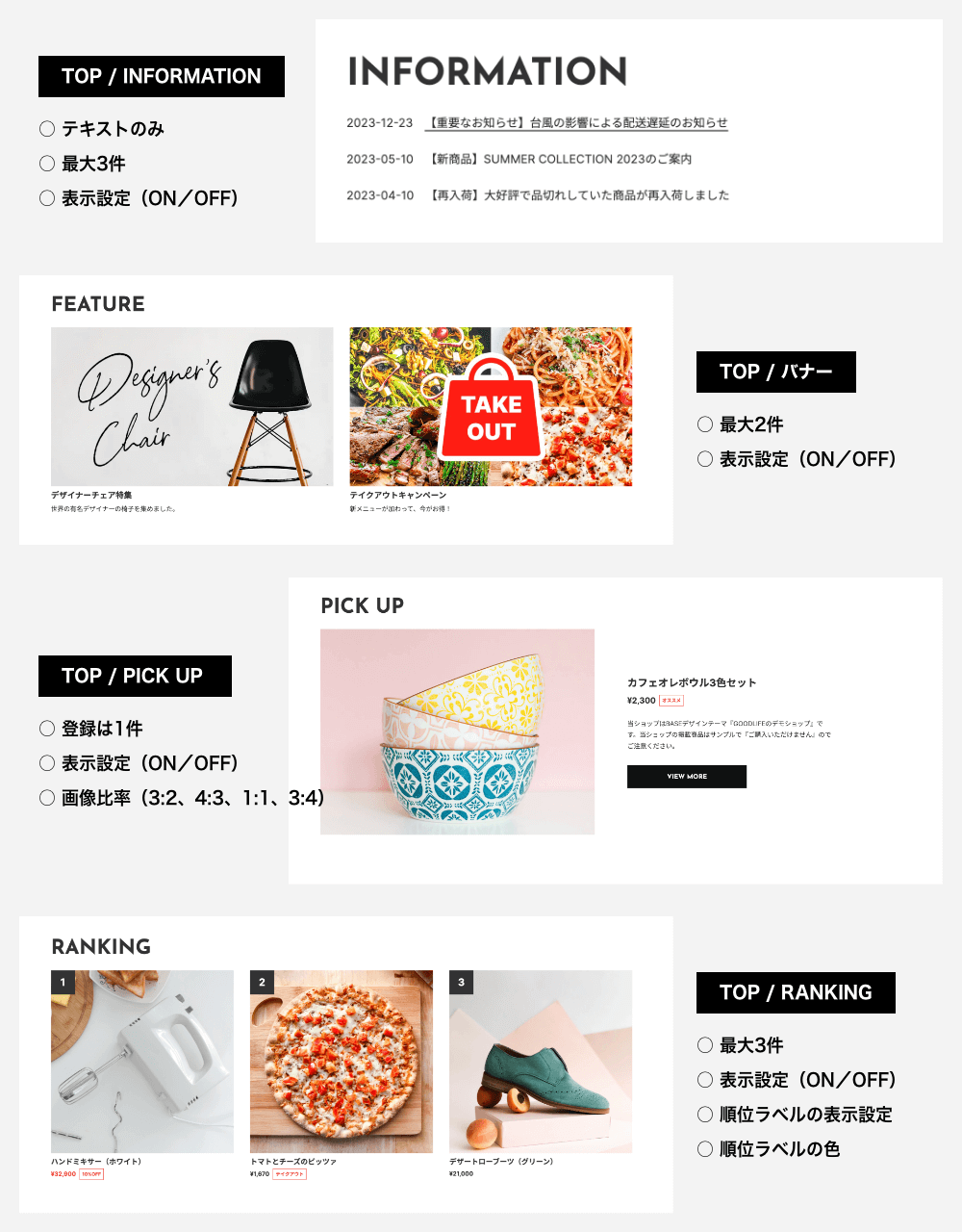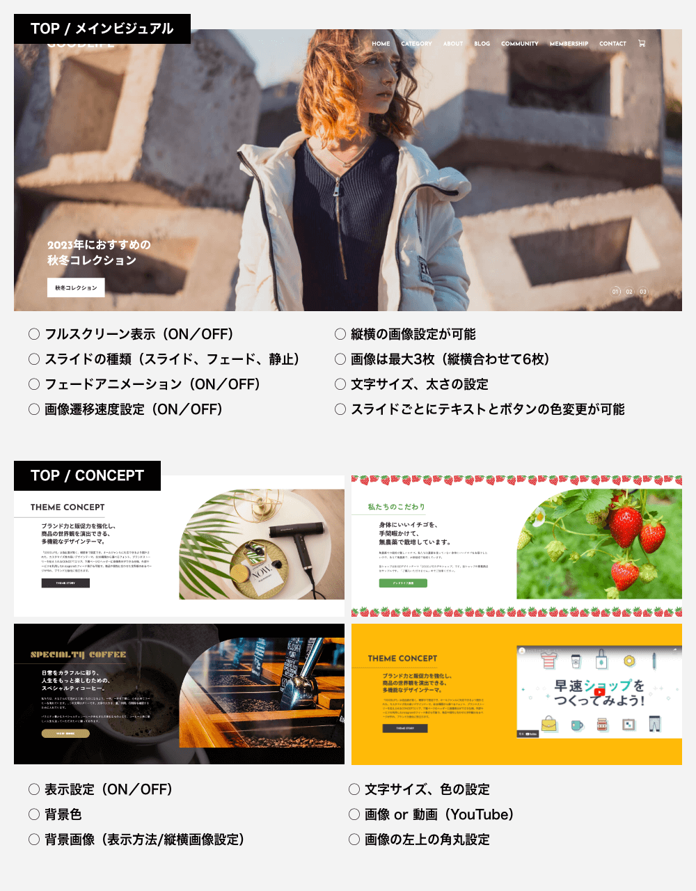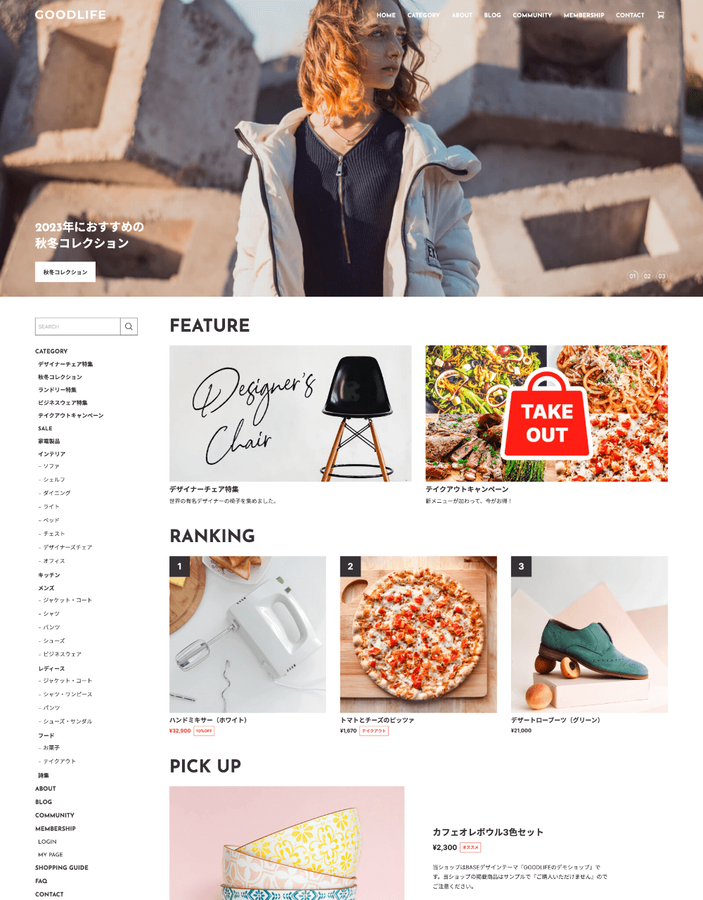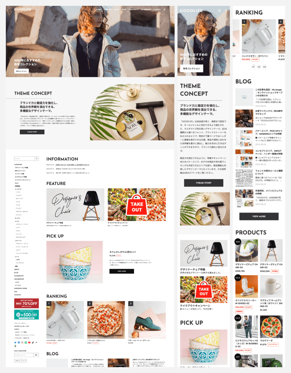 −−−−−−−−−−−−−−−−−−−−−−−−− ブランド力と販促力を強化し、 商品の世界観を演出できる、 多機能なデザインテーマ。 −−−−−−−−−−−−−−−−−−−−−−−−− ○ 自由度が高く、多機能なテーマ ○ 細部までカスタマイズが可能 ○ オールジャンルの商品に対応 ○ 商品の世界観を演出 ○ ブランド力強化 ○ 販促力強化 ○ レスポンシブデザイン(PC、タブレット、スマホに対応) ○ ユーザビリティ設計 −−−−−−−−−−−−−−−−−−−−−−−−− 主な特徴 −−−−−−−−−−−−−−−−−−−−−−−−− ○ 38種類から選べるフォント ○ デザインの選択(画像の角丸、ボタンの形状) ○ 画像比率の選択(3:2、4:3、1:1、3:4) ○ ナビゲーションでのバナー表示 ○ メインビジュアルのスライド3パターン(静止、スライド、フェード) ○ CONCEPTエリア ○ エリアの並べ替え ○ INFORMATIONエリア(テキストのみ) ○ バナーエリア ○ PICK UP商品エリア ○ RANKINGエリア ○ Instagramフィード表示(外部サービスを利用) ○ 下層ページのヘッダー画像の表示 ○ 商品ページの共通テキストエリア ○ ABOUTページの4つのエリア ○ BLOG一覧(レイアウト、本文抜粋の表示設定) ○ OGP画像設定 ○ CSS追加設定(上級者向け) −−−−−−−−−−−−−−−−−−−−−−−−− デモショップ −−−−−−−−−−−−−−−−−−−−−−−−− ■ テーマの説明を兼ねたオールジャンルのお店 ○ メインビジュアル(スライド) ○ フルスクリーン表示ON ○ COMMUNITYページのヘッダー画像の登録あり https://goodlife1.base.shop ■ 身体にいい無農薬栽培のイチゴ農園 ○ メインビジュアル(フェードのアニメーションON) ○ COMMUNITYページのヘッダー画像の登録あり https://goodlife2.base.shop ■ こだわりのスペシャルティコーヒーのお店 ○ メインビジュアル(フェード/フェードのアニメーションON/フェードの画像遷移速度(ゆっくり)ON) ○ フルスクリーン表示ON ○ CATEGORYページの共通ヘッダー画像の登録あり ○ COMMUNITYページのヘッダー画像の登録あり https://goodlife3.base.shop −−−−−−−−−−−−−−−−−−−−−−−−− 設定マニュアル・更新情報 −−−−−−−−−−−−−−−−−−−−−−−−− ■ 設定マニュアル https://base.leende.jp/goodlife/goodlife-howtouse/ ■ 更新情報 https://base.leende.jp/goodlife/goodlife-update/ −−−−−−−−−−−−−−−−−−−−−−−−− 共通項目 −−−−−−−−−−−−−−−−−−−−−−−−− 【フォント】 さまざまなジャンルの商品に対応できるよう、Google Fontsから厳選しました。 ■ フォントの表示ルール https://base.leende.jp/goodlife/goodlife-howtouse/#anc-font--rule ■ フォントの種類(全38種類) https://base.leende.jp/goodlife/goodlife-howtouse/#anc-font--type 【ヘッダー】 スクロール後のロゴ、背景色、テキスト色が変更可能。 【ナビゲーション】 ○ フォントサイズ(15px、16px、17px、18px) ○ テキストの太さ(標準、太字) ○ サイドナビゲーションの追従(ON/OFF)※1200px以上 ○ 大カテゴリの太字(ON/OFF) ○ 中カテゴリの常時表示(ON/OFF) ○ 文言の変更 ○ 追加リンク(最大3件) ○ カートアイコンの設定(カート、バッグ) ○ SNSアイコンの背景色(アイコンが見えにくい場合) ○ バナー画像とリンク 【フッターナビゲーション】 ○ 背景色(幅1199px以下の時) ○ テキストの色(幅1199px以下の時) 【フッターコピーライト】 ○ 背景色 ○ テキストの色 【角丸デザイン】 ○ ON/OFF設定 ※画像などの角が角丸になります 【見出し】 ○ フォントサイズ(XS、S、M、L、XL) ○ 太さ(標準、太字) ○ 色 ○ 位置 【ボタン】 ○ 種類(背景色あり、細枠線、太枠線) ○ 形状(四角、角丸、丸型) ○ ボタンの色 ○ テキストの色 ※背景色ありの場合のみ ○ テキストの太さ(標準、太字) −−−−−−−−−−−−−−−−−−−−−−−−− 商品(共通) −−−−−−−−−−−−−−−−−−−−−−−−− ○ 見出しの文言変更(トップページ) ○ 商品画像の比率(3:2、4:3、1:1、3:4) ※画像比率がバラバラでも表示崩れが起きません ※比率からはみ出した部分は切り取られます ○ 商品価格の文字の太さ(標準、太字) ○ 商品ステータスの色 ○ ボタンのテキストの文言変更 −−−−−−−−−−−−−−−−−−−−−−−−− トップページ −−−−−−−−−−−−−−−−−−−−−−−−− 【メインビジュアル】 細かい設定が可能で、自由度が高い仕様になっています。 ○ スライドの種類(スライド、フェード、静止) ○ フルスクリーン表示(ON/OFF) ○ フェード選択時のアニメーション設定(ON/OFF) ○ フェード選択時の画像遷移速度(ゆっくり)設定(ON/OFF) ○ スライド画像(最大3枚)で、縦横の画像設定が可能 ※画面からはみ出した部分は切り取られます ※縦画像のみでは表示されませんので、横画像を登録してください ○ テキスト(文言の登録、サイズ、太さ、色) ○ リンク先の設定 ○ ボタン(文言の登録、色) ※スライドごとにテキストとボタンの色変