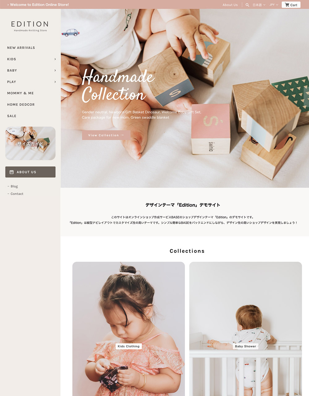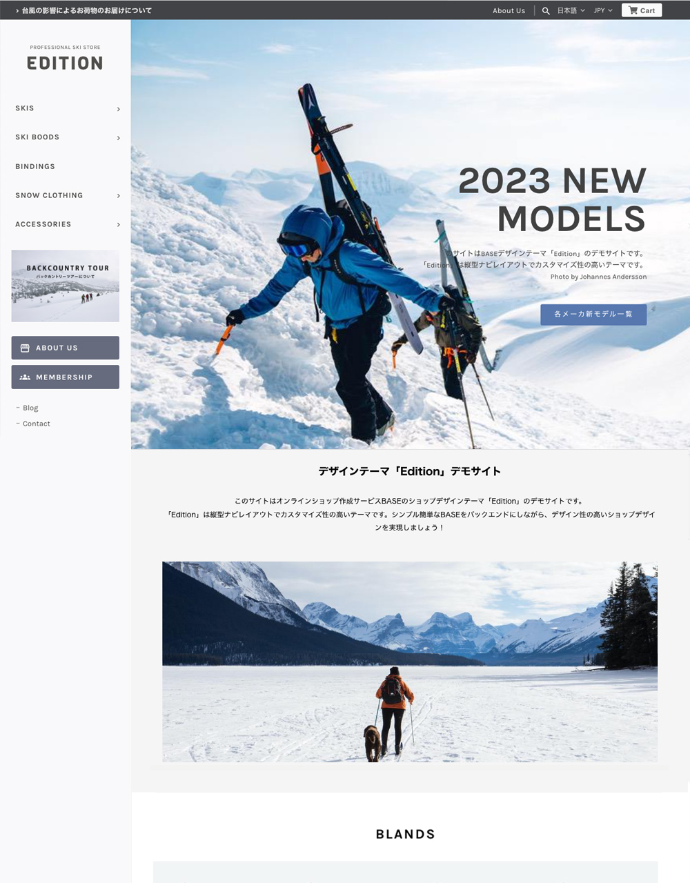 ■ デザインテーマ『Edition / エディション』 『Edition』はサイドメニューレイアウトを特徴としたデザインテーマです。 カラーリング自由なサイドバー、ヘッダーバーがカラーアクセントとなり、よりお店の個性や雰囲気を表現しやすくなっています。 また内部には商品サムネイルのサイズや縦横比調整といった細やかなデザイン調整、スライドギャラリーや動画再生、カテゴリーヘッダーなど、様々なカスタマイズ機能を搭載ています。 複数のデザイン設定サンプルをご用意していますのでぜひご覧ください。 =========================== 1. 明るく柔らかく優しい雰囲気: https://basedesign.info/edition/demo/demo01/ 2. 色味で表現するエレガントな雰囲気:https://basedesign.info/edition/demo/demo02/ 3. ダークカラーで締まった雰囲気:https://basedesign.info/edition/demo/demo03/ 4. 白ベースでシンプル・スタンダードに:https://basedesign.info/edition/demo/demo00/ テーマ詳細・設定マニュアル → https://basedesign.info/edition/manual =========================== 【テーマの特徴】 ・レスポンシブなカラーサイドバー ・お知らせ表示ができるカラーヘッダーバー ・イメージ画像上のテキストデザイン機能 ・カテゴリーを主体とした階層メニューシステム ・カテゴリーごとのヘッダー画像設定機能 ・使い方自由自在なコレクション機能 ・画面を彩るイメージ/YouTube動画再生セクション ・商品サムネイルのカラム数/縦横比設定 ・商品詳細ページのレイアウトカスタマイズ ・商品詳細ページの「最近見た商品」「セール中商品」による動線 ・Aboutページの拡張機能(お店写真、送料、決済など) ・送料や決済を表示できるフッターセクション ・スマホ対応のレスポンシブデザイン 【こんなお店にオススメ】 ✓ 小〜中規模 ✓ 色で雰囲気を表現したい(サイドバーが良いアクセントに!) ✓ イメージ写真やキャッチコピーで凝ったデザインに ✓ イメージ映像を埋め込みたい ✓ 商品カテゴリーごとにヘッダーデザインを変えたい ✓ 商品写真を大きく見せたい ✓ 実店舗の紹介もしたい(実店舗なしでも可) ★お知らせバナー非対応の理由 このテーマでは独自にお知らせバナー機能を内蔵しています。「お知らせバナーApp」なしで、よりデザインに馴染んだお知らせバナーを表示できます。 【専用サポートフォーラムをご利用いただけます】 テーマ専用サポートフォーラム → https://basedesign.info 私たちはBASEデザインマーケットを通じて長期に渡りBASEのデザイン開発を行なっています。 販売テーマには独自のサポートフォーラムを用意し、テーマをご利用いただくショップオーナー様からのご質問を随時受け付け、積極的にサポートを行なっています。 ------------------ ■リリースノート [2026.01.15] ・「定期便 App」の初回価格機能に対応しました [2025.12.3] ・決済案内でのMastercard®ロゴを非表示 Mastercard®の取り扱い一時停止されることに伴い、テーマオプションとして表示しているクレジットカードロゴを非表示といたしました。 → [2025.12.19] 追記:取り扱い継続のお知らせに伴い、再度表示するよう変更しました。 [2025.10.29] ・商品詳細ページでのセール中商品、閲覧履歴表示機能のの内部処理を変更しました。 その他、表示に関する小さな修正や改善を行いました。 [2025.4.28] ・BASEかんたん決済にて「ダイナースクラブカード」取り扱い開始を受け、テーマのクレジットカードロゴにダイナースクラブを追加しました。 その他、表示に関するいくつかの調整、改善を行いました。 [2025.3.15] ・カートに商品が入っていると表示されるカートバッジに対応しました。 デザイン設定にてバッジの色(赤色/アクセントカラー)を選択できます。 ・カテゴリーヘッダー画像の表示に関する処理を改善しました。 [2024.10.31] ・「Pay ID あと払いウィジェット」に対応しました。 [2024.9.10] ・デザイン設定項目のグループ化に対応し、より使いやすくなりました。 ・ヘッダーメッセージを流れて表示させるオプションを追加しました。 ・LINEボタン表示機能を追加しました(メッセージAppのような形でLINE公式アカウントボタンを表示できます。メッセージAppとの併用はできません) その他、表示に関するいくつかの調整、改善を行いました。 [2024.1.29] ・スマホでの商品ページにて「購入ボタンを固定表示」機能を追加しました! 画面下方向にスクロールした際に画面下に「購入ボタン」が固定表示されます。商品説明が非常に長い場合でも購入しやすくなります。(初期設定ではOFFになっています) ・スマホでのカテゴリーメニューをより見やすくスムーズな動作に改善しました。 [2024.1.9] 決済方法案内に関する表示調整を行いました。 [2023.9.29] 「メンバーシップ App」にてショップオリジナルのポイント機能が追加されました。商品画面でのポイント表示に関する表示調整を行いました。 [2023.09.12] ・商品詳細ページにて「最近見た商品」と「セール中商品」を表示する機能を追加しました 商品ページから他の商品への動線が増えることで、